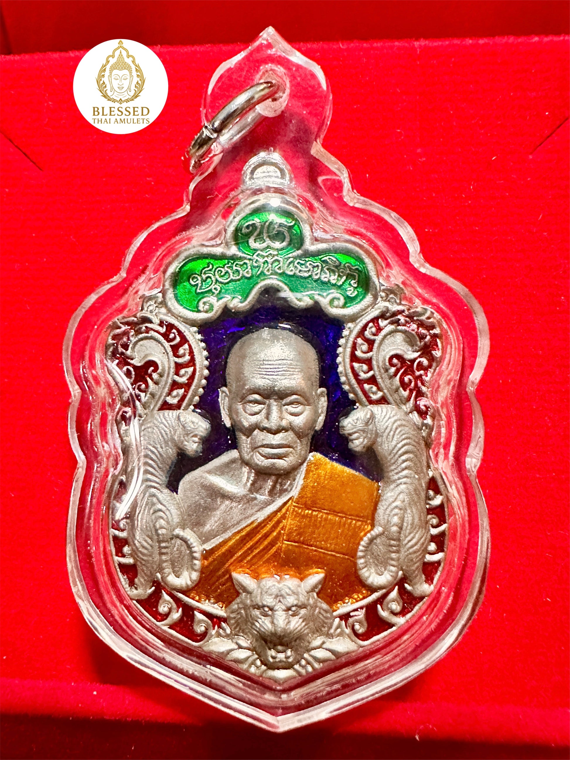 This striking Thai amulet features the revered Luang Phor Phat flanked by twin tigers—symbols of power, fearlessness, and spiritual guardianship. The bold tiger faces and dynamic design evoke both protective and predatory energy, ideal for those walking a path that demands inner strength and unwavering determination.