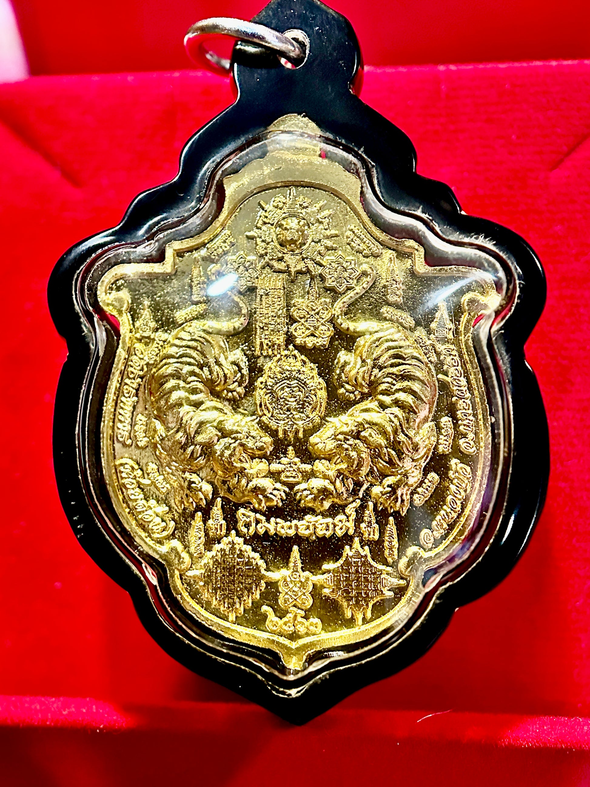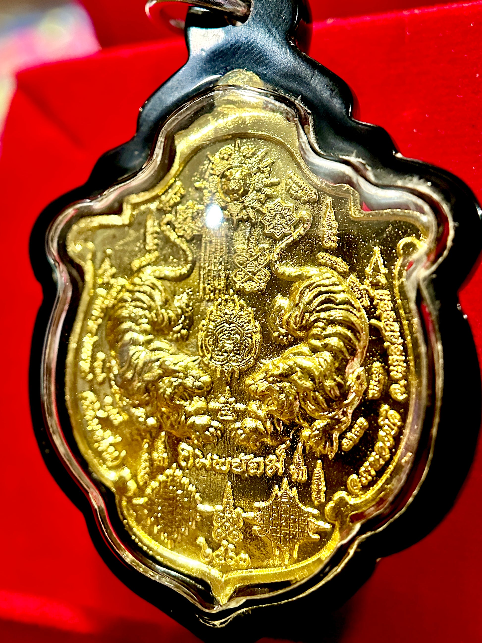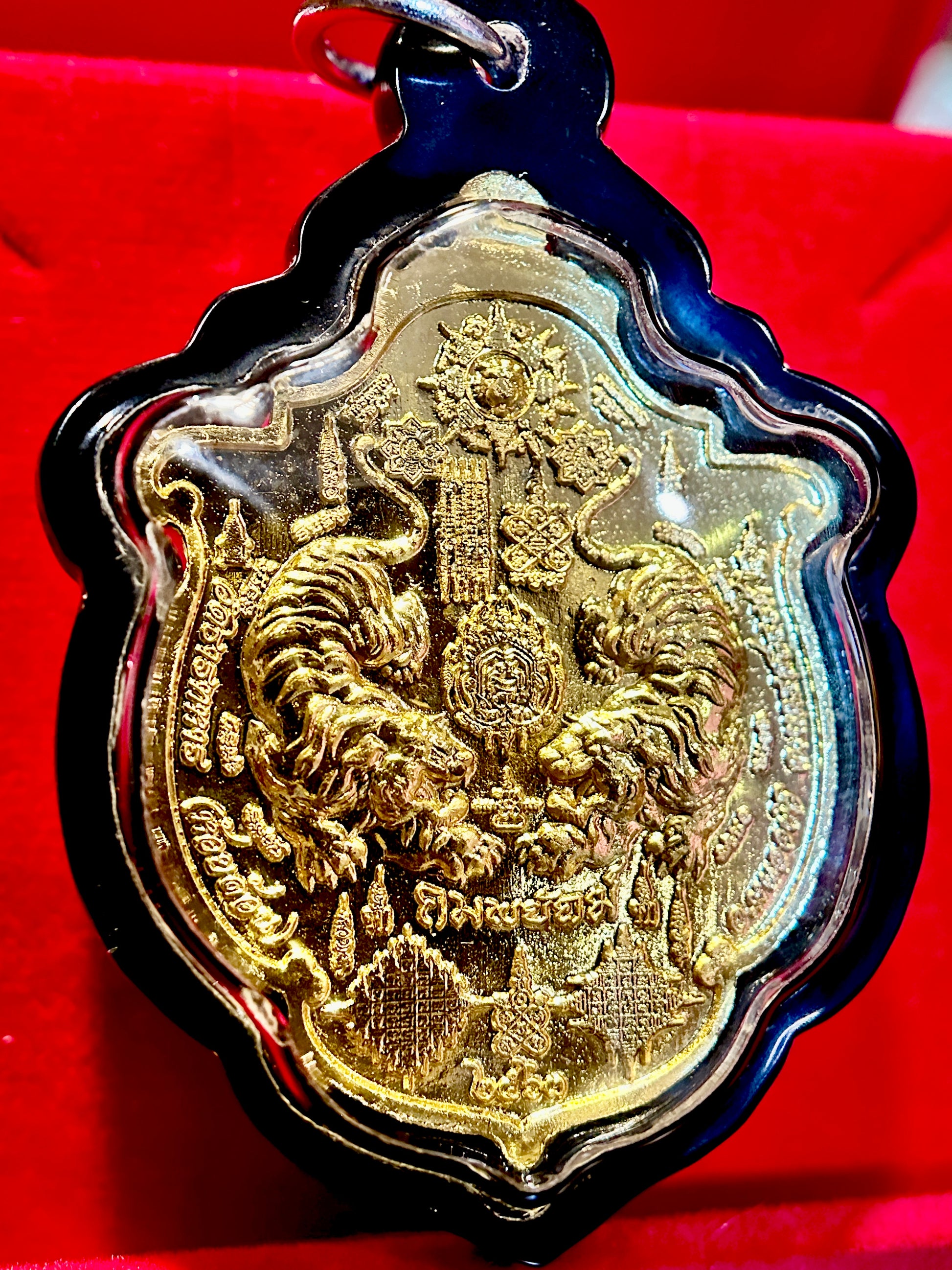 The reverse side is equally striking, showcasing two powerful tigers facing each other amidst yantra symbols and sacred inscriptions. The word “Sinlapachai” is inscribed in Thai, signifying victory and auspicious success. This amulet embodies dominance, invincibility, and sacred charm—ideal for those seeking protection, good luck, and personal power.