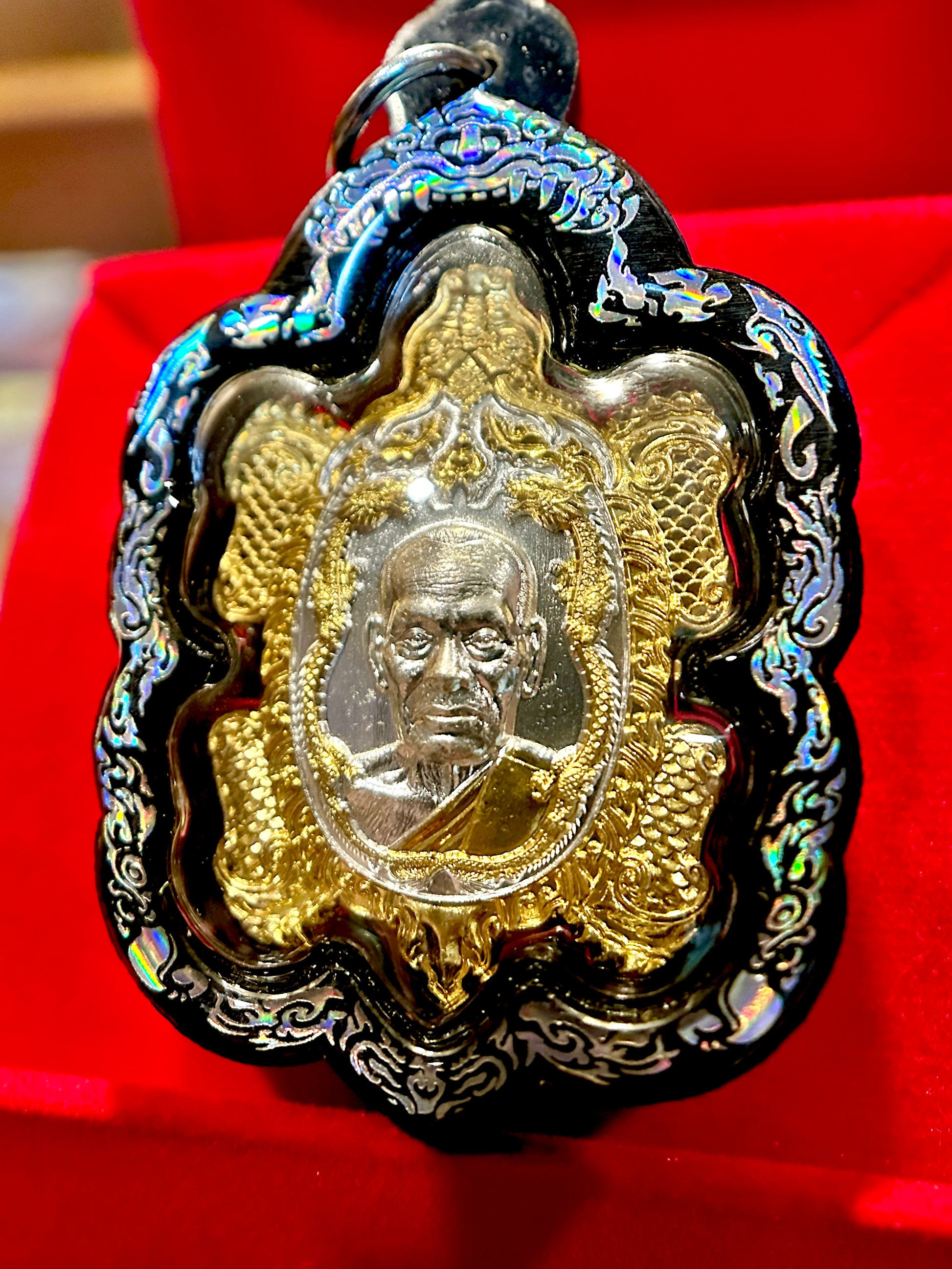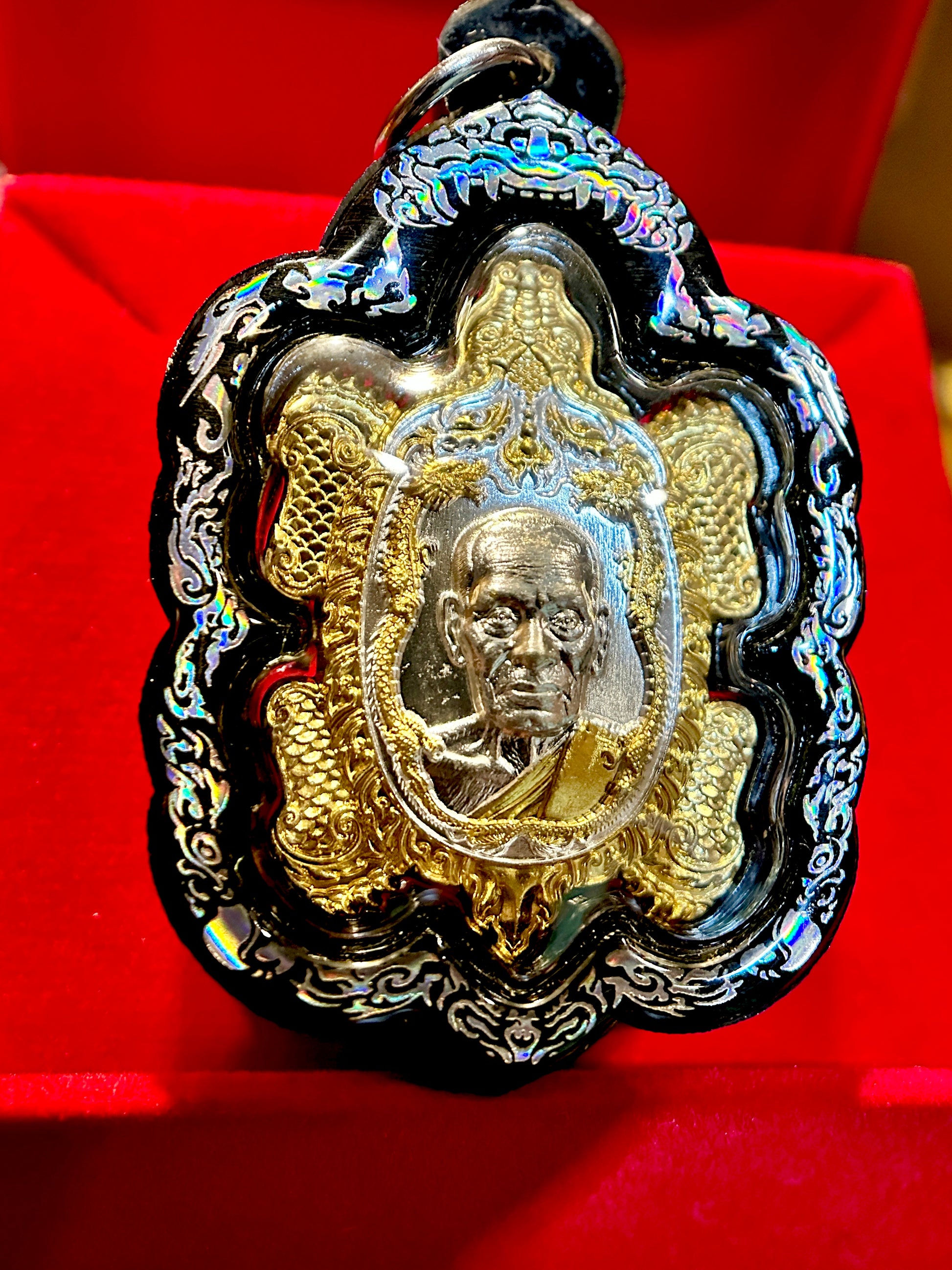 🔹 Front: The silver-and-gold portrait of Luang Phor Phat is framed within a turtle-shaped design, symbolizing longevity, stability, and protection.