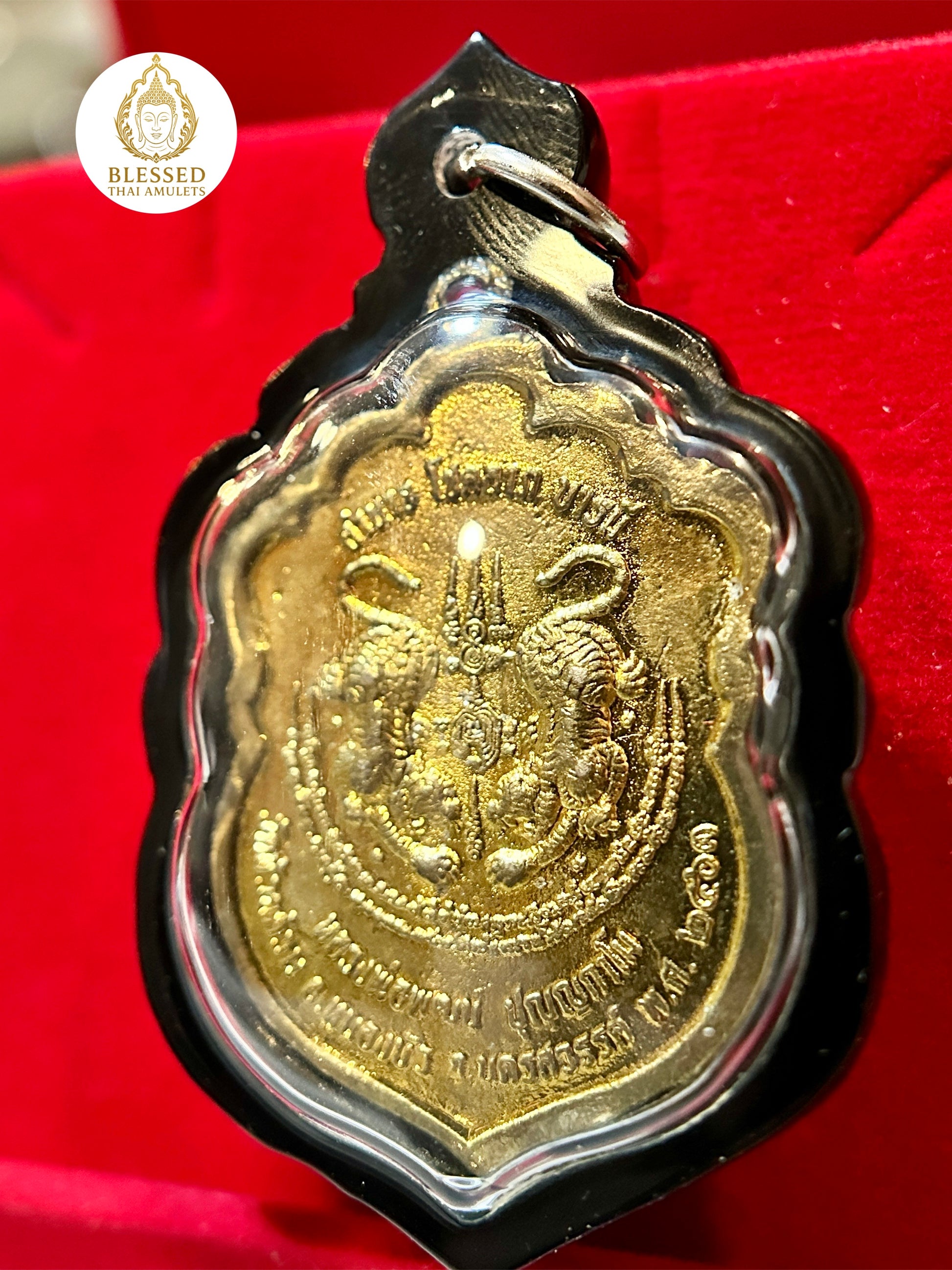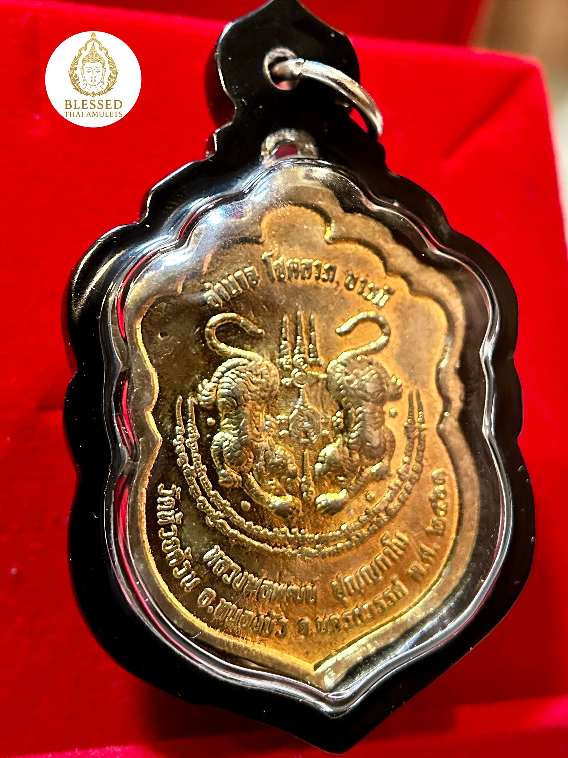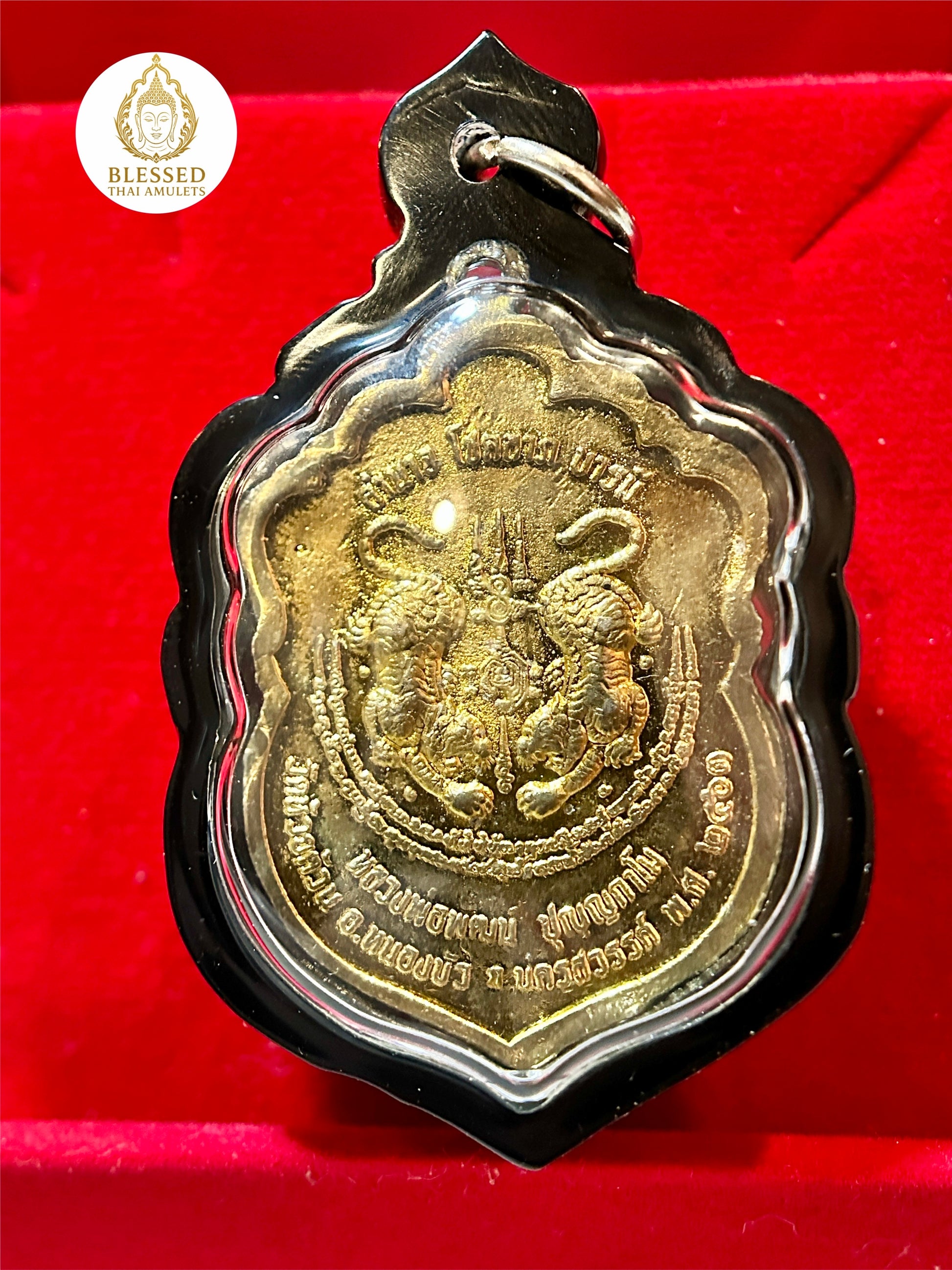 The reverse showcases two mirrored Twin Tigers mid-roar, a fierce symbol of dominance, courage, and assertive energy, often worn by Muay Thai fighters and warriors seeking protection in both spiritual and physical battles. Intricate script and yantra etchings amplify the amulet’s sacred power.