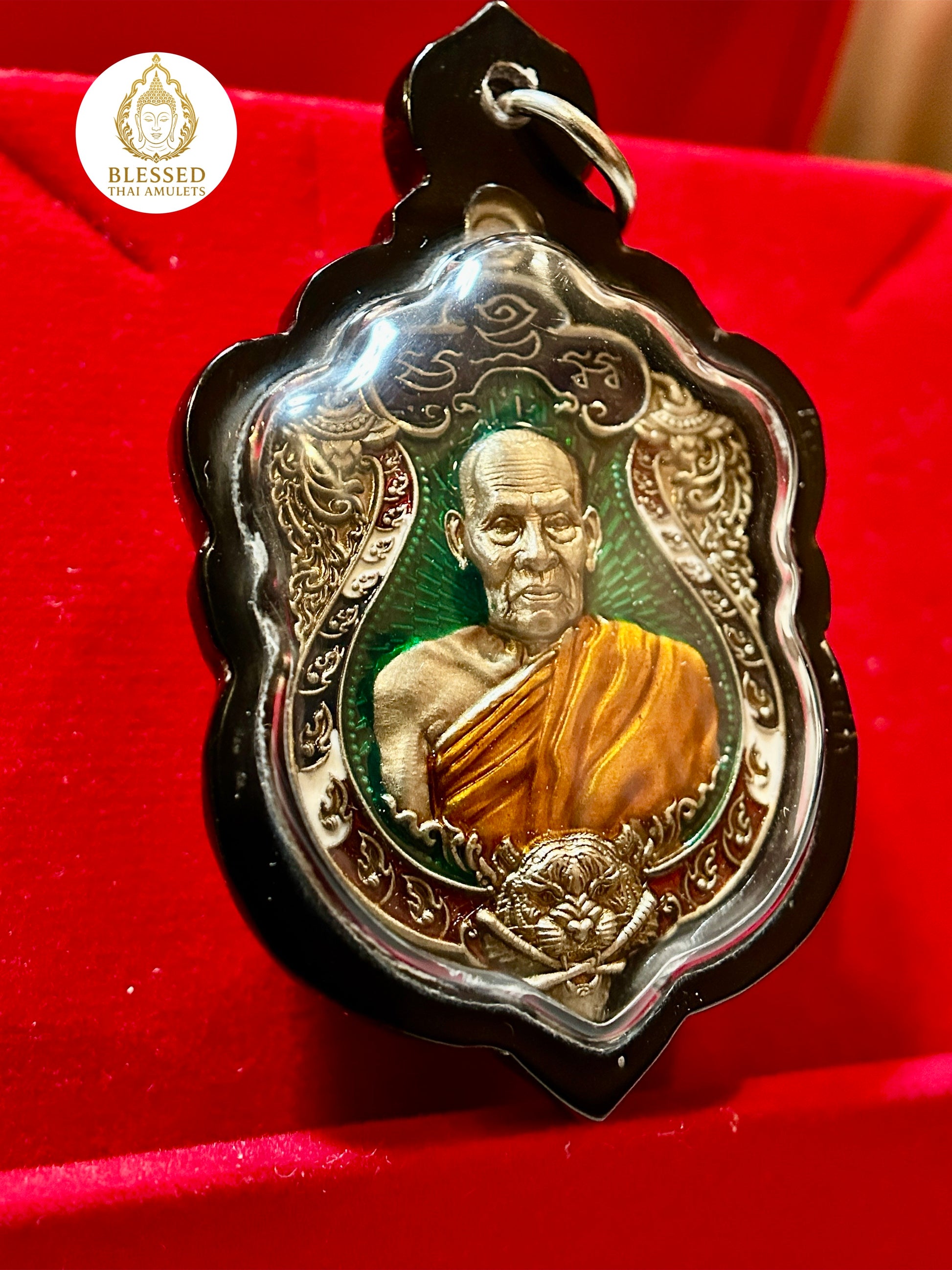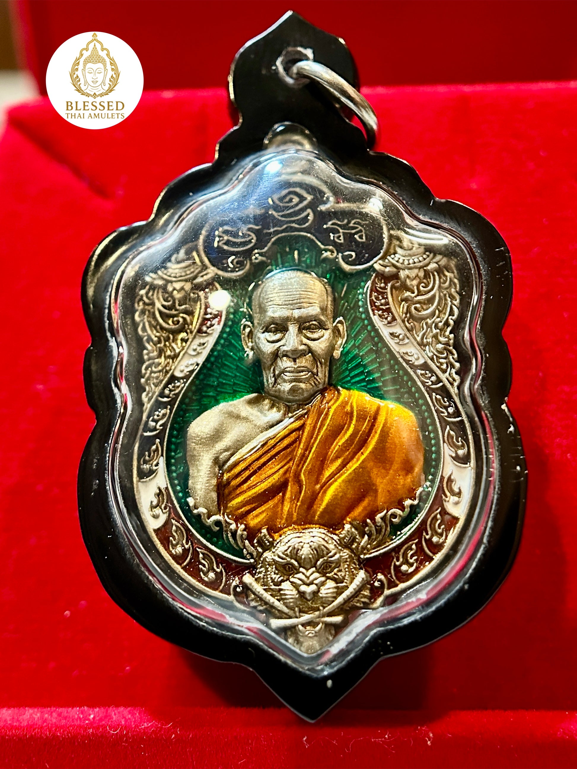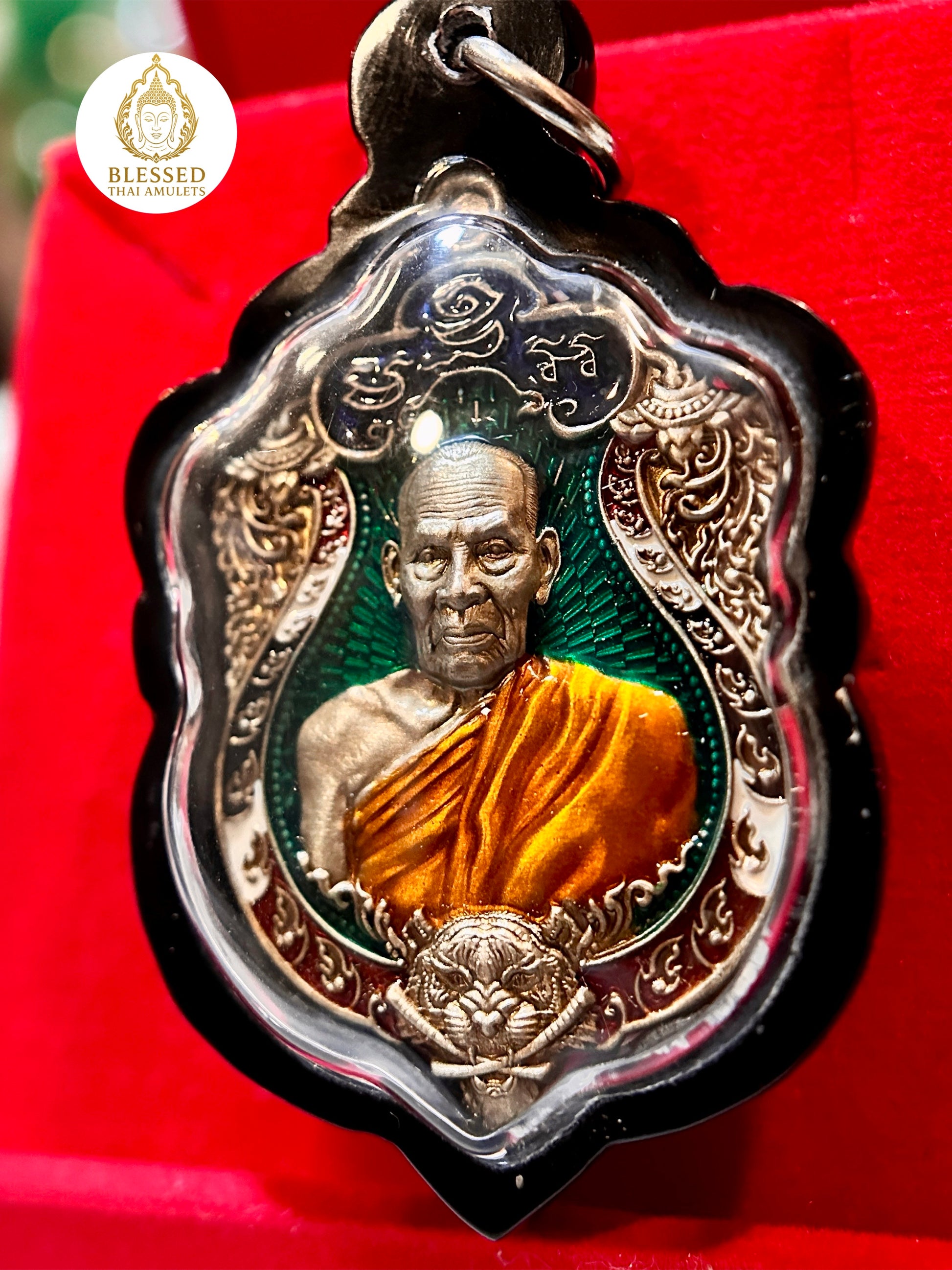 This exquisite amulet showcases Luang Phor Phat on the front, finely detailed against a brilliant emerald green background. Below his portrait is a powerful tiger’s head, a sacred symbol of strength, protection, and fearlessness.