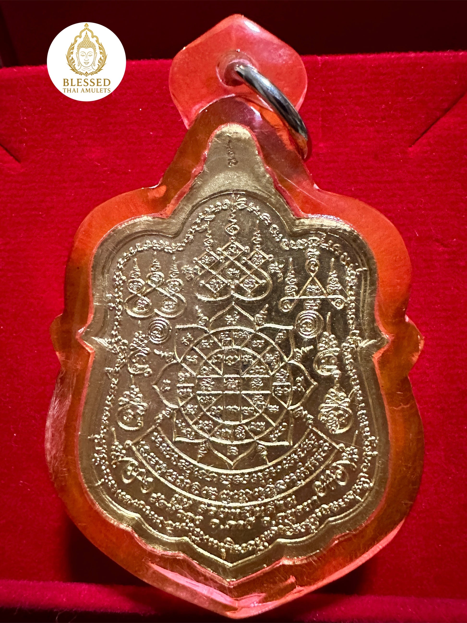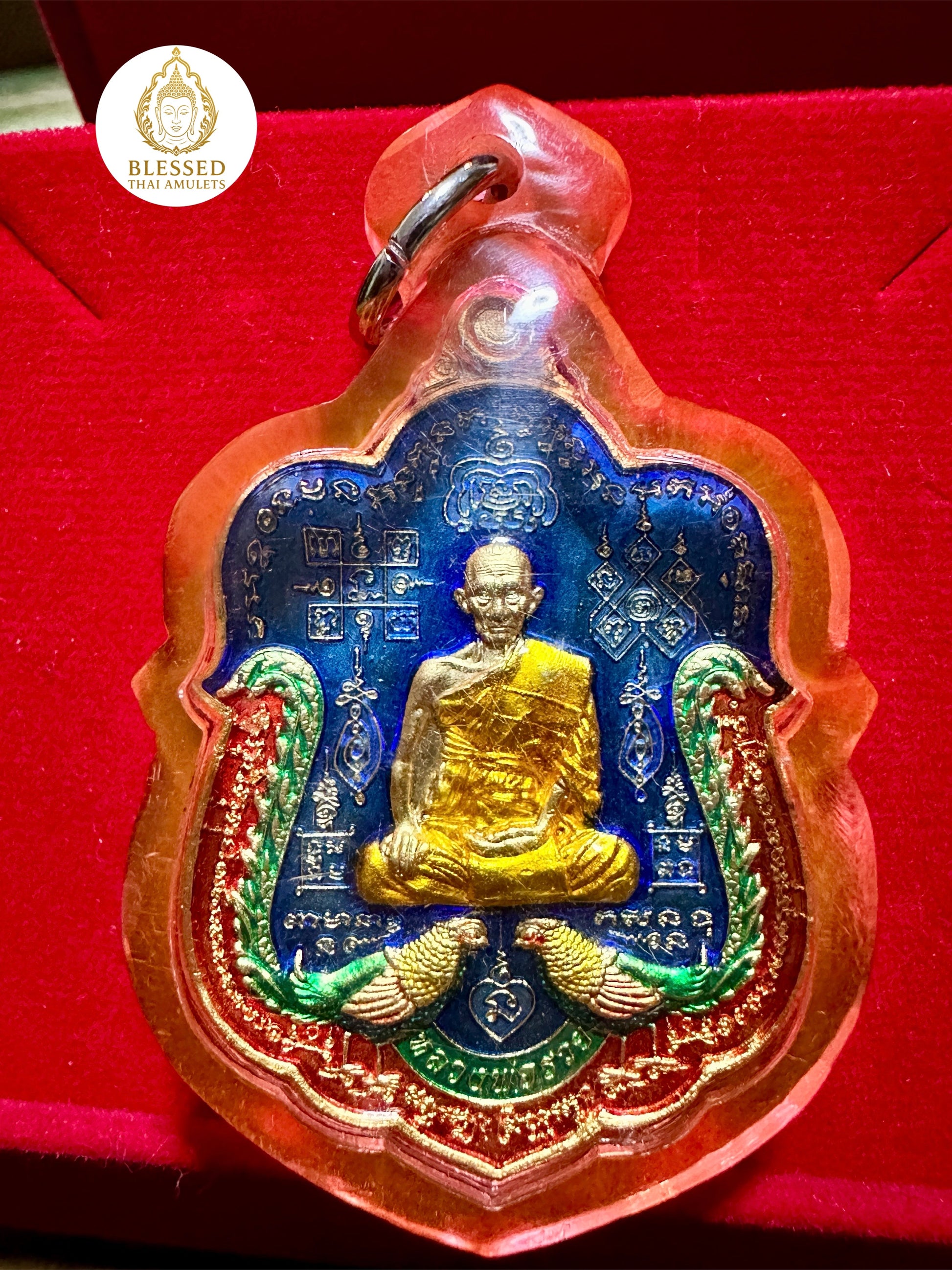 This beautifully detailed amulet features Luang Phor Ruay, a highly revered monk known for his blessings of wealth, protection, and spiritual guidance. Seated in a calm meditative pose, he is surrounded by sacred yantras and flanked by two golden roosters—powerful symbols of vigilance, victory, and warding off misfortune. Set against a deep blue enamel backdrop and framed in a bold pink-orange trim case, this amulet radiates both spiritual strength and visual elegance. The reverse displays a highly detailed protective yantra, calling in luck, prosperity, and spiritual protection.