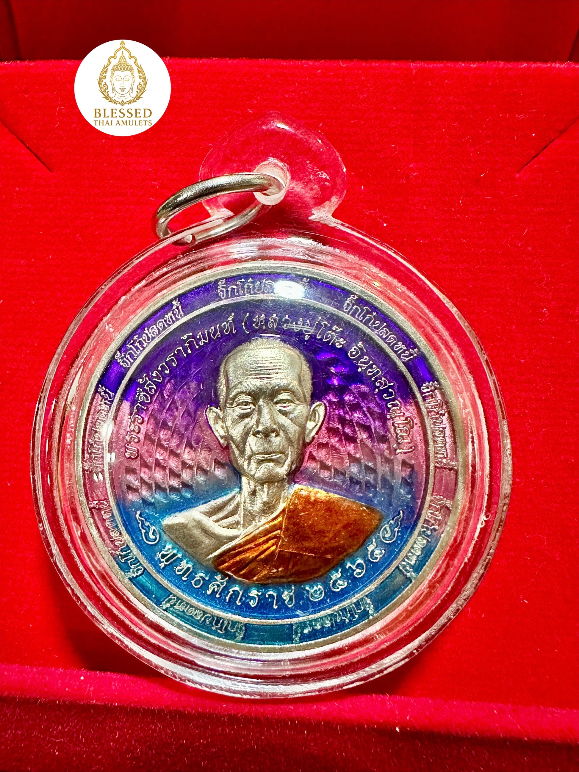 This striking amulet honors Luang Phor Toh (หลวงพ่อโต), a highly revered monk known for his deep wisdom and spiritual power. Set against a radiant gradient backdrop of violet, purple, and blue, the front depicts his calm, aged face in fine detail, with his saffron robe hand-painted in gold and copper enamel.