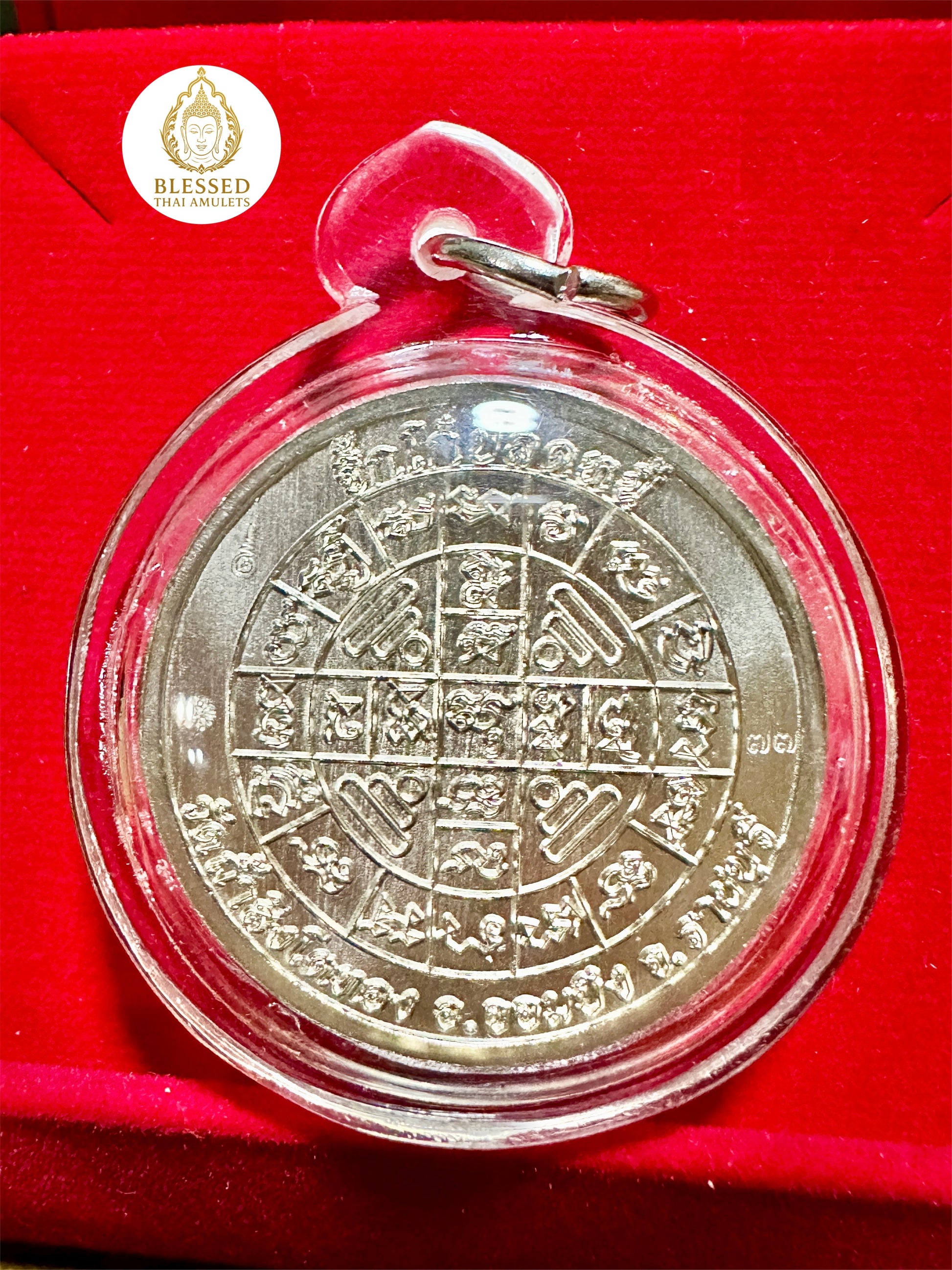 The reverse features an intricate 81-square yantra grid surrounded by sacred Khmer script—used for auspicious protection, clarity of mind, and balancing cosmic energies. This style of grid is commonly linked to enhanced fortune, improved decision-making, and shielding the bearer from misfortune.