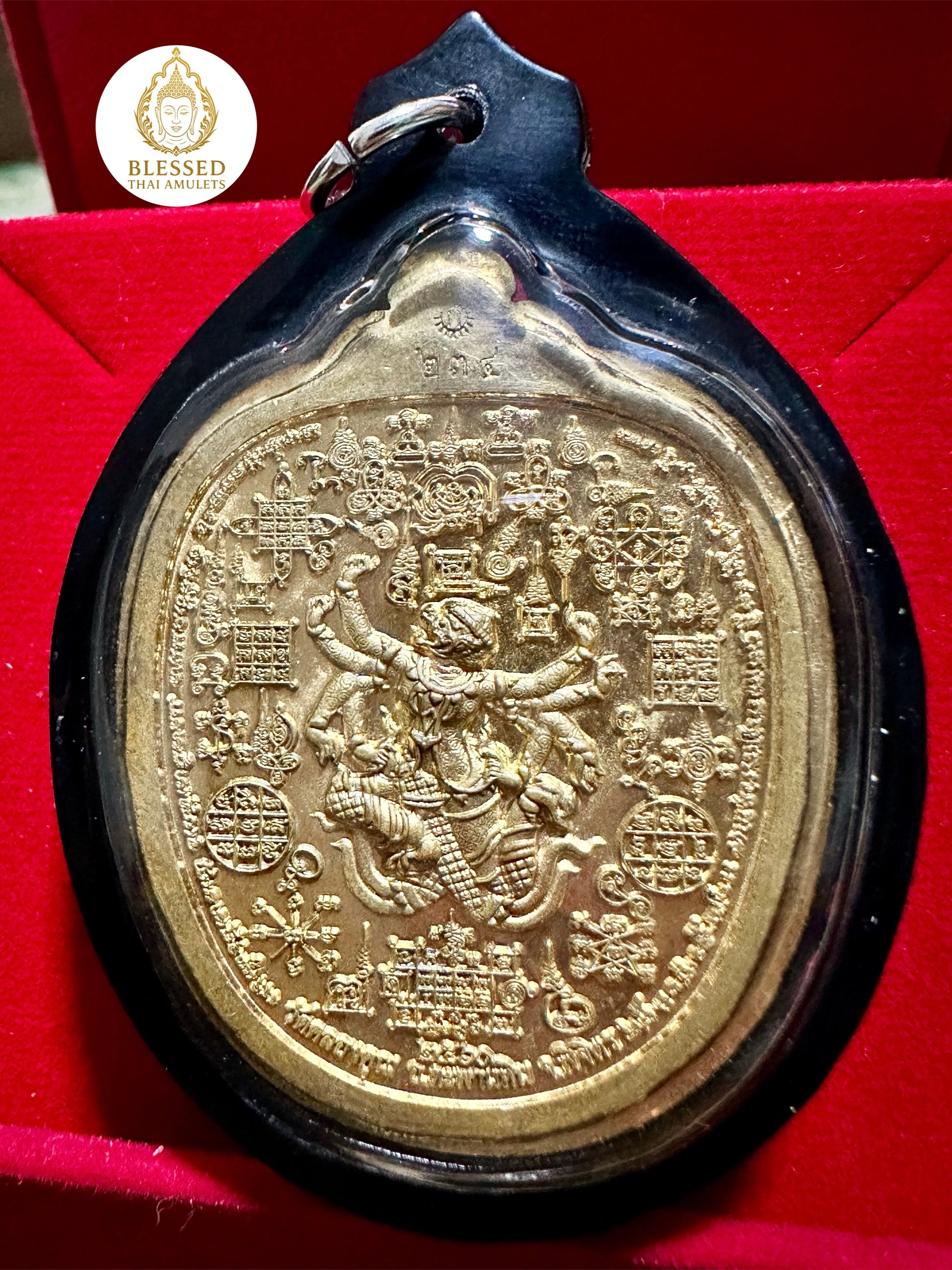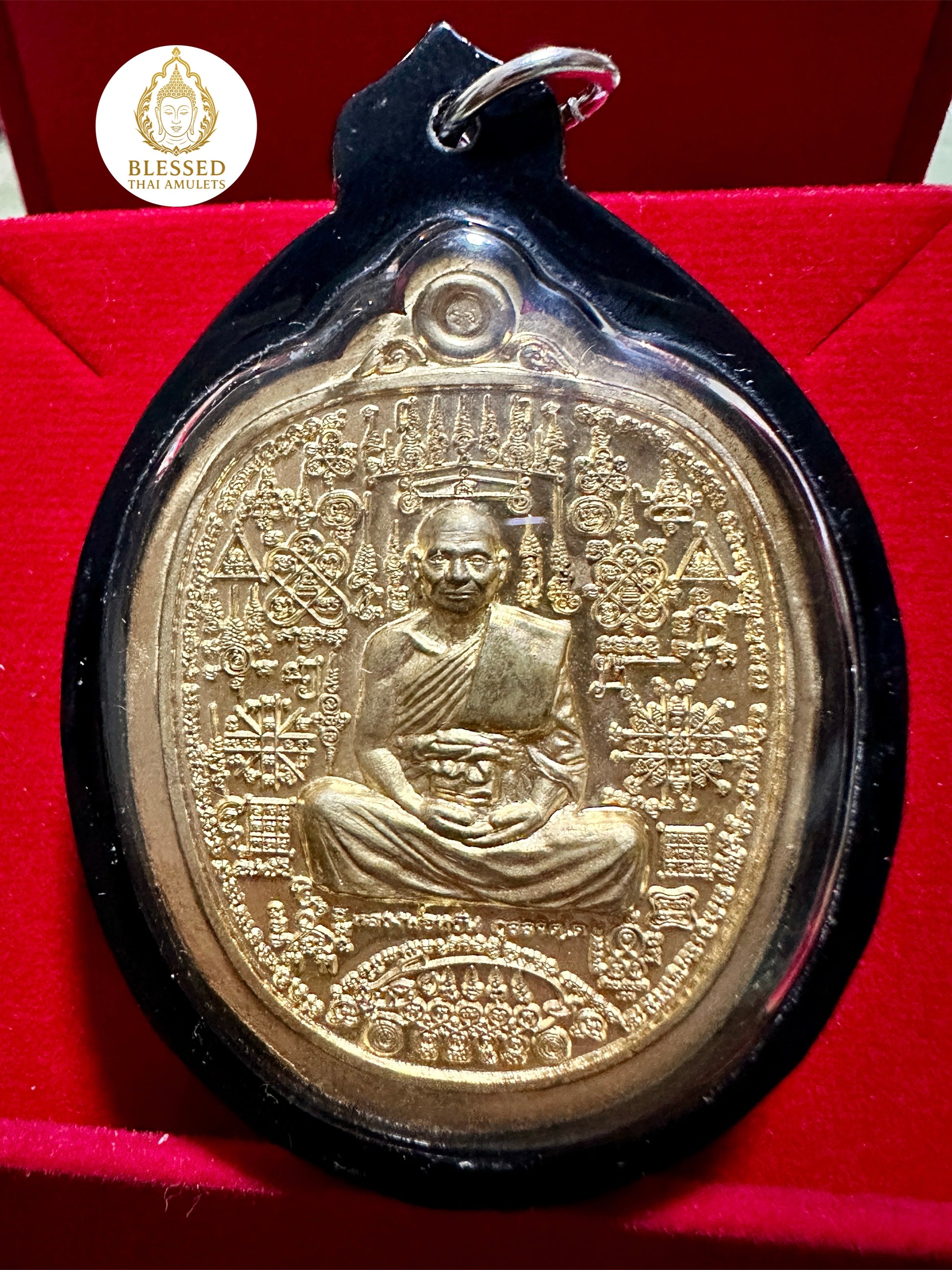 This is a large and bold amulet, encased in a sleek black trim—ideal for those seeking spiritual authority, unwavering resilience, and the blessings of both monk and mythic guardian.