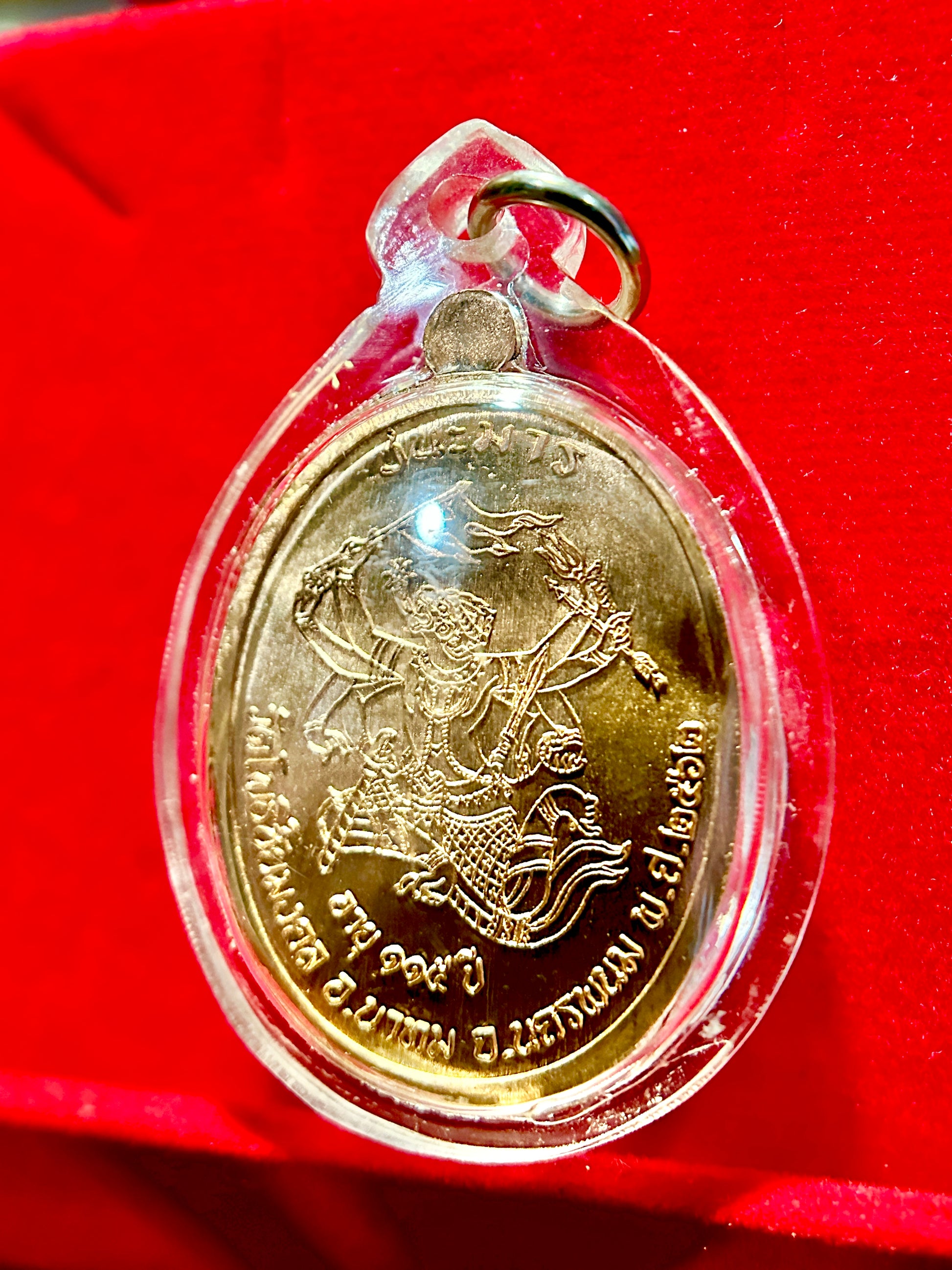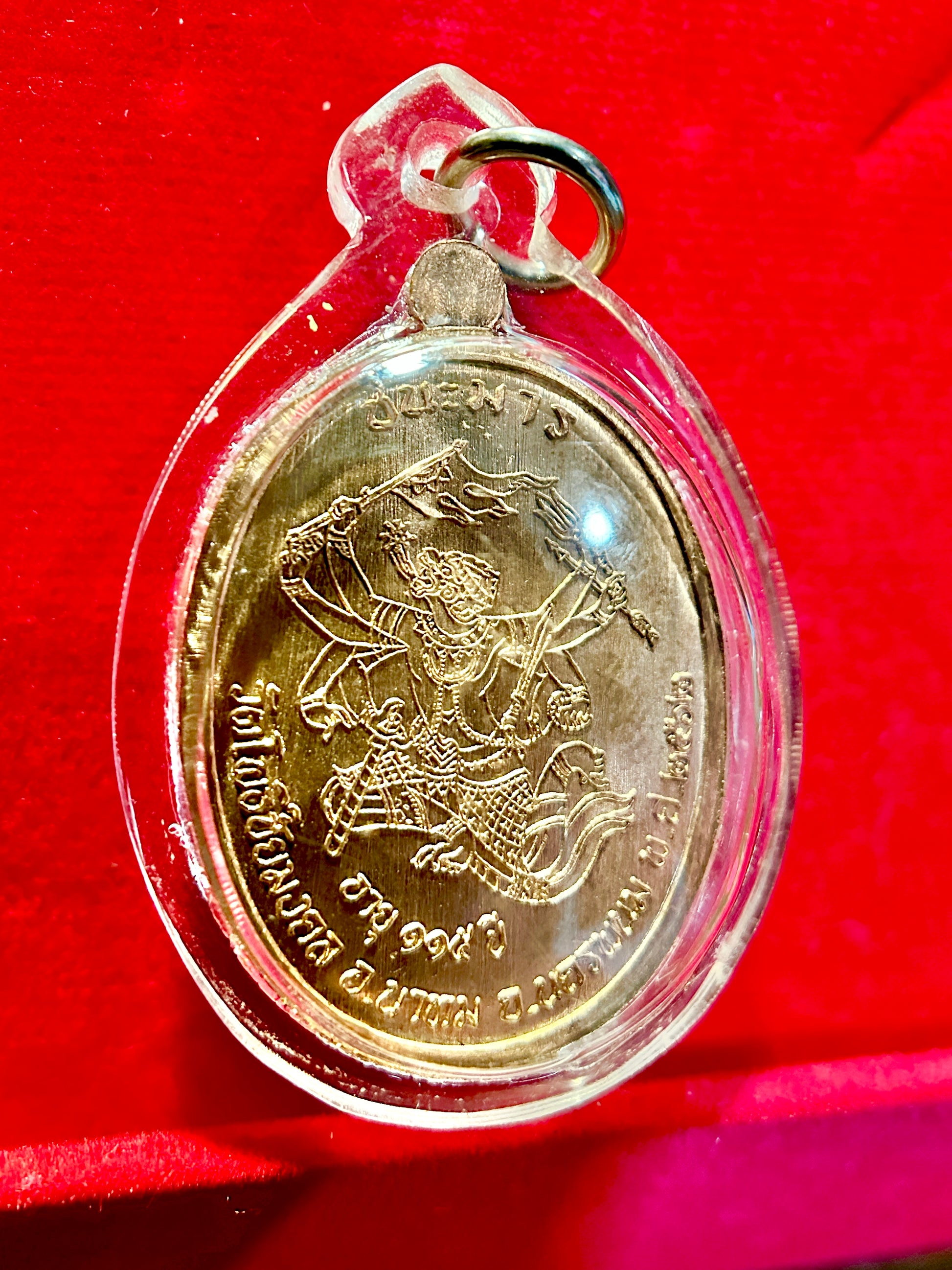 The reverse side reveals Hanuman, the divine monkey warrior from the Ramayana epic, captured mid-leap with his mace in hand and aura of invincibility. Hanuman is a revered symbol of courage, loyalty, unwavering focus, and supernatural strength — especially favored by warriors, athletes, and Muay Thai fighters.