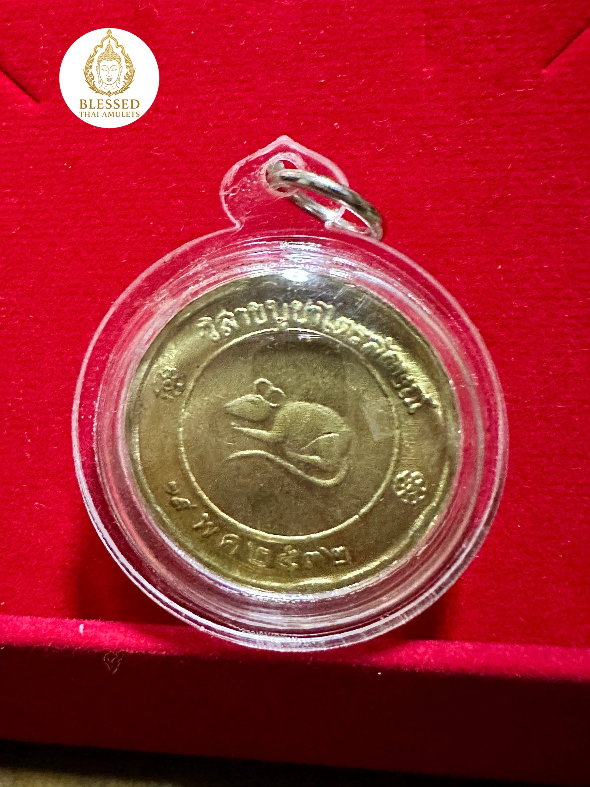 A unique round amulet featuring the bold Thai word “โชคดี” (Chok Dee), meaning “Good Luck,” beautifully embossed across the front. Created by Luang Phor Khen of Wat Sri Rat Sattharam, this charm is designed to attract prosperity and positive fortune. The reverse displays a rat—the first animal in the Thai zodiac—symbolizing intelligence, resourcefulness, and financial success. A great choice for those born in the Year of the Rat or anyone seeking a boost in luck and opportunity.