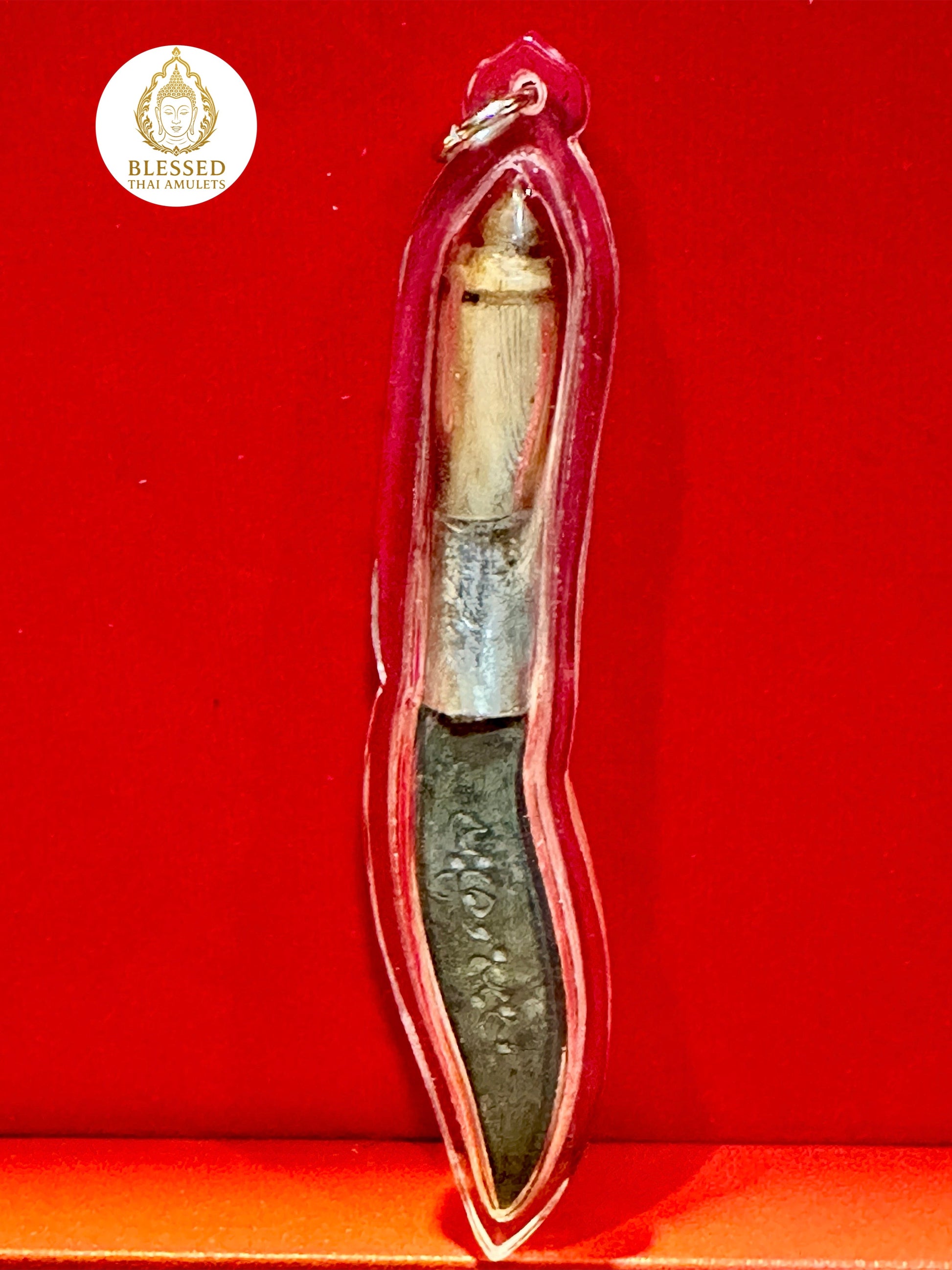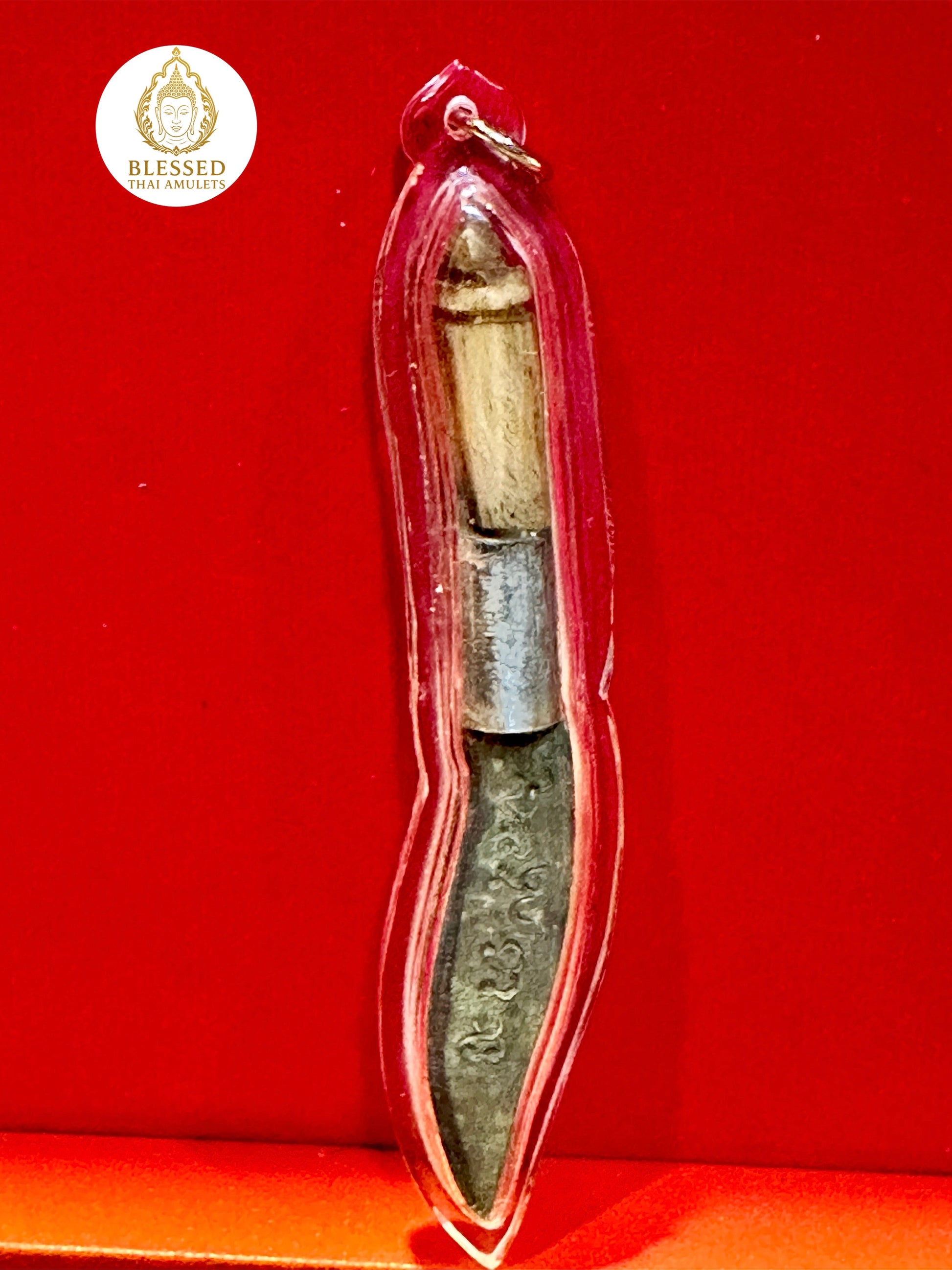 A powerful Meed Mor ritual blade, finely encased and inscribed with sacred script along the blade and shaft. This knife amulet features a traditional combination of metal and wooden handle, commonly used by monks and spiritual masters for blessings, ritual protection, and clearing negative energy.