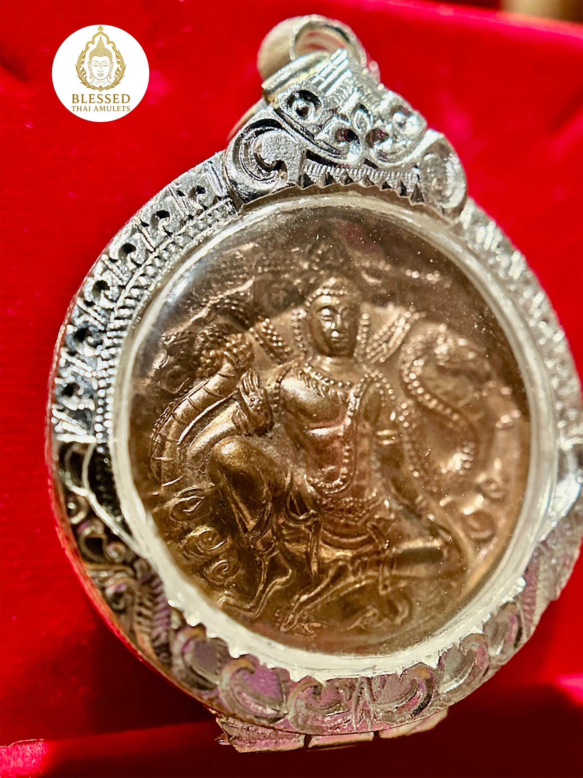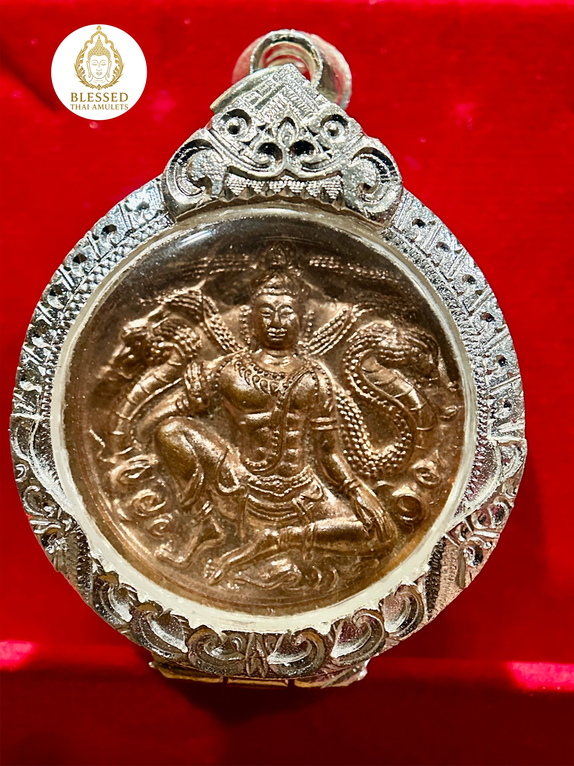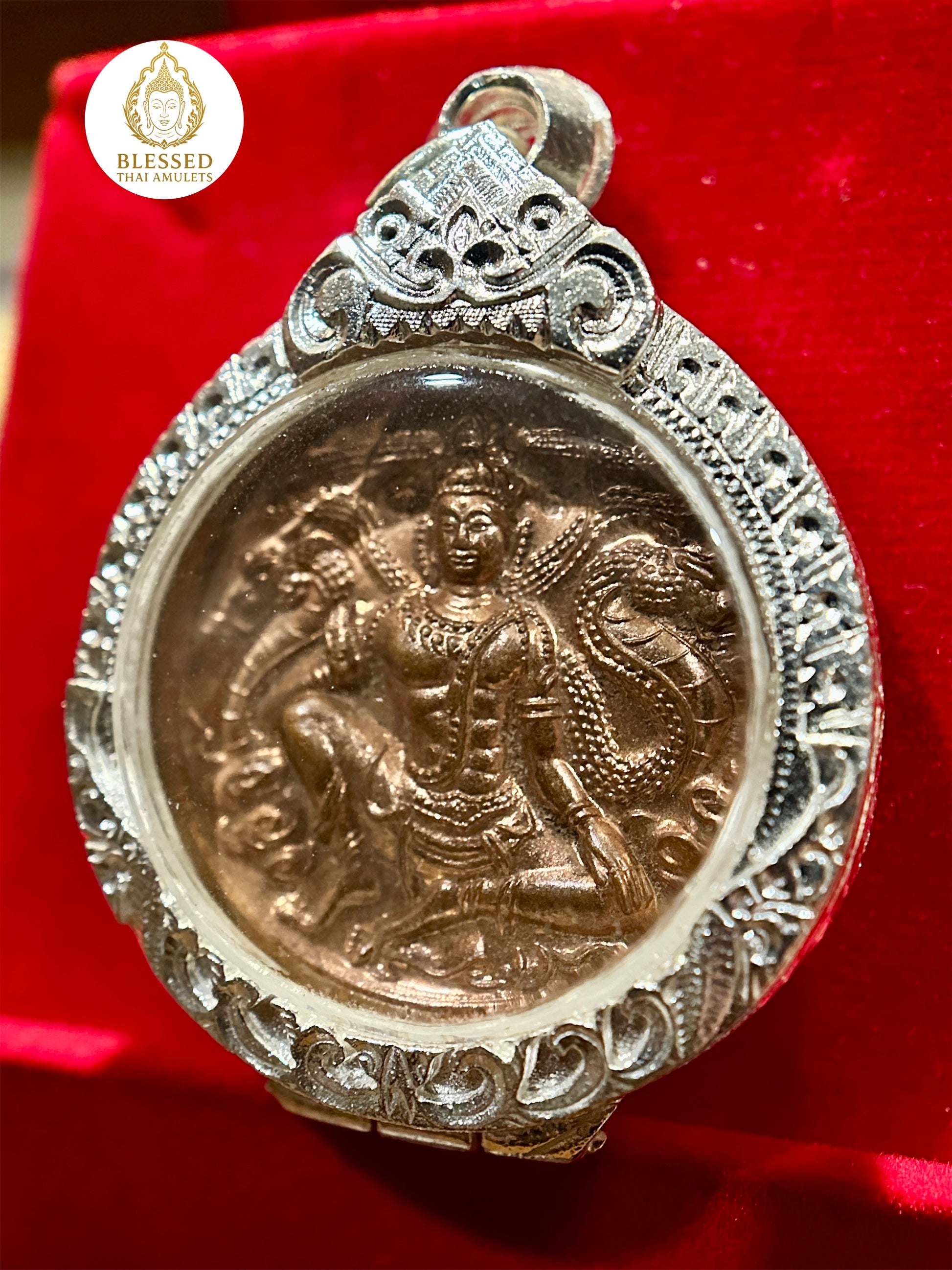 This powerful bronze amulet features a serene Bodhisattva seated in deep meditation, embraced by the coiling form of the Naga serpent, a divine guardian spirit in Thai and Buddhist mythology. The Naga’s protective presence symbolizes spiritual shelter, wisdom, and awakening, echoing the ancient tale of Mucalinda shielding the Buddha from the storm.
