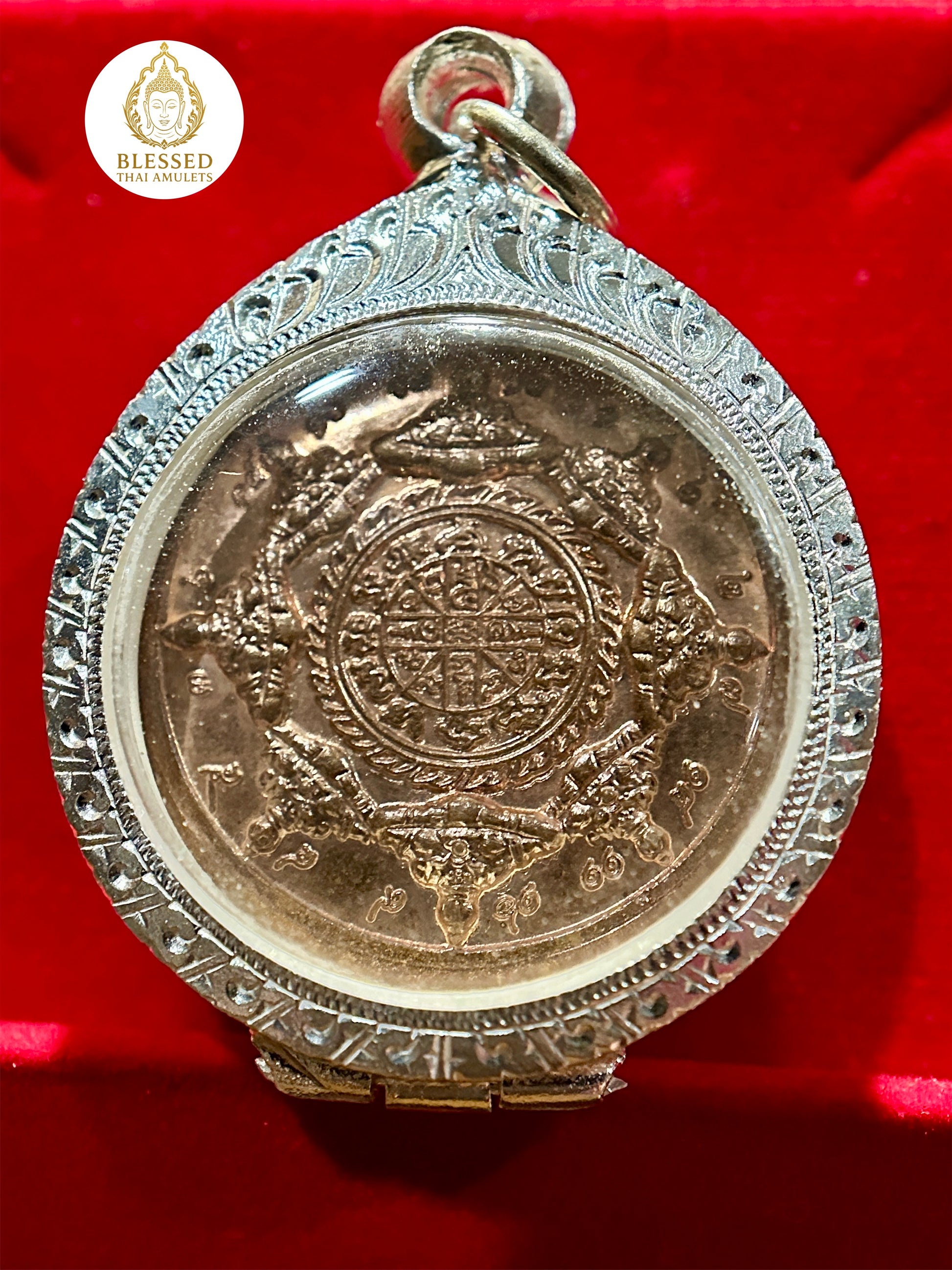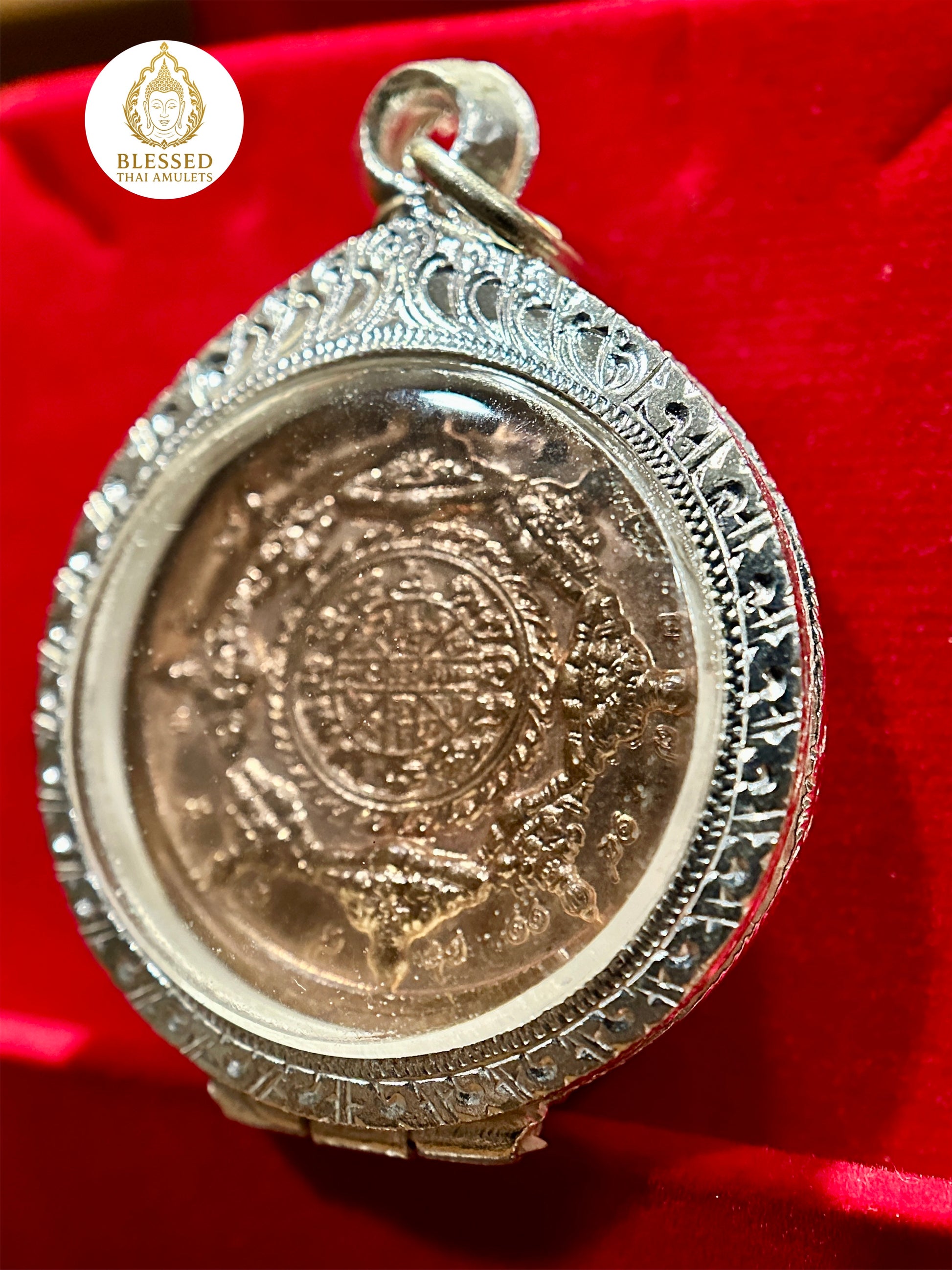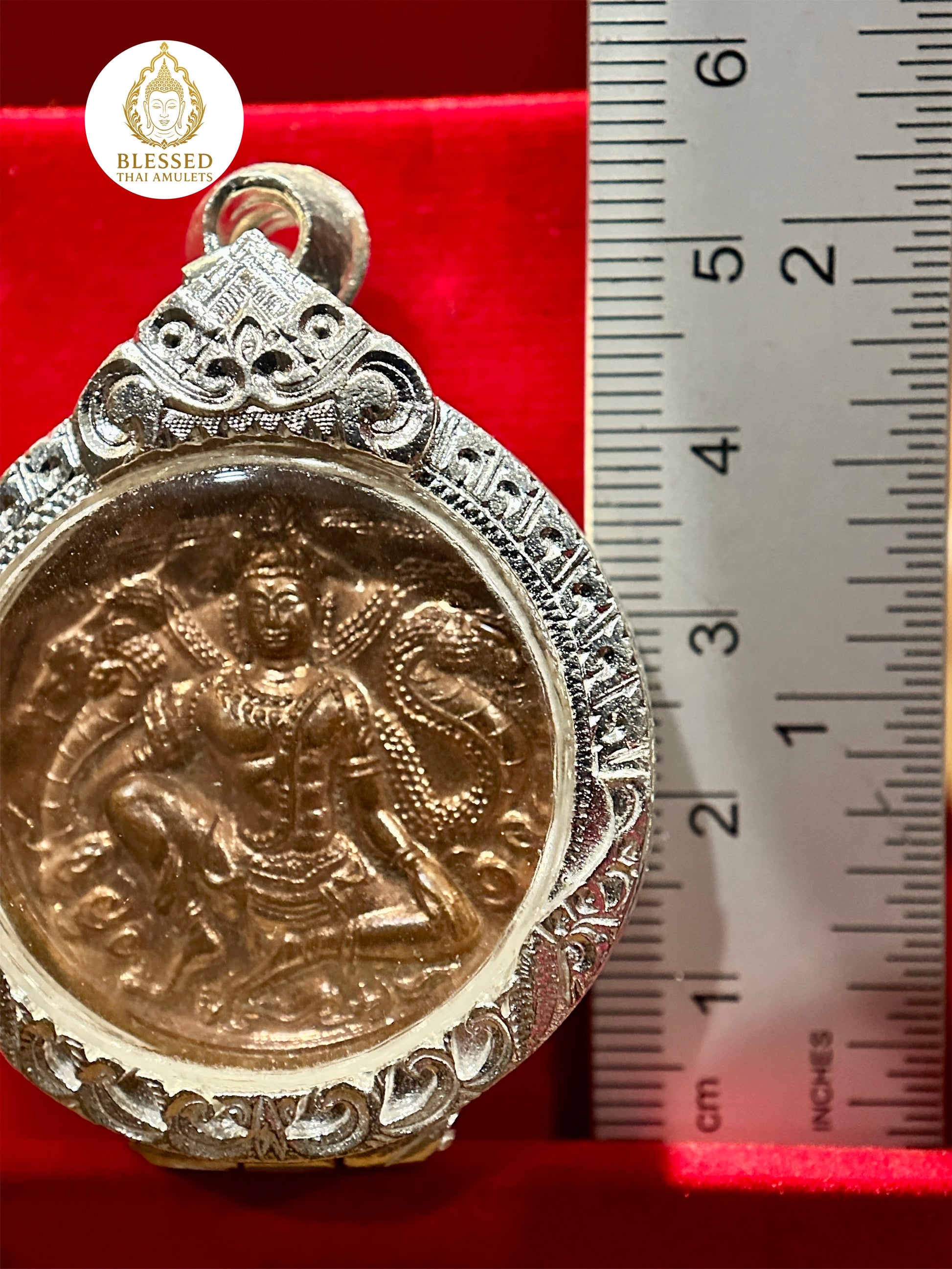 This powerful bronze amulet features a serene Bodhisattva seated in deep meditation, embraced by the coiling form of the Naga serpent, a divine guardian spirit in Thai and Buddhist mythology. The Naga’s protective presence symbolizes spiritual shelter, wisdom, and awakening, echoing the ancient tale of Mucalinda shielding the Buddha from the storm.