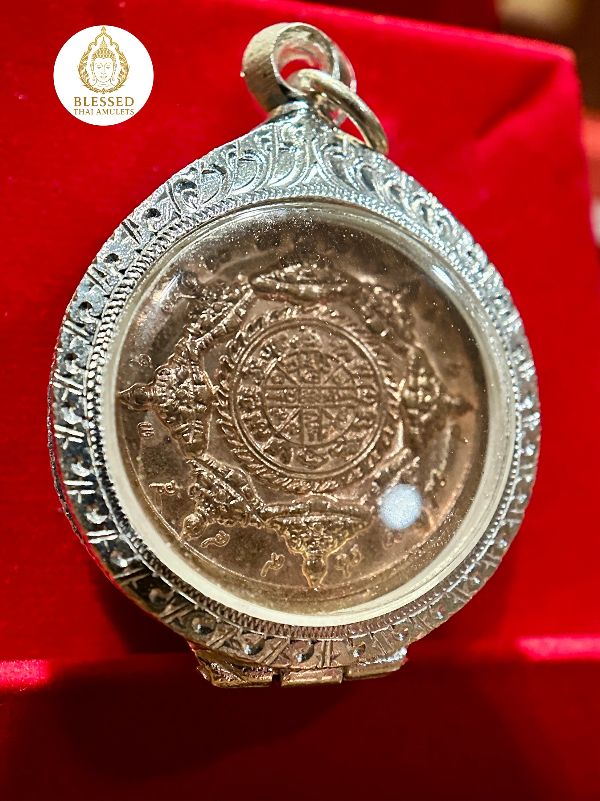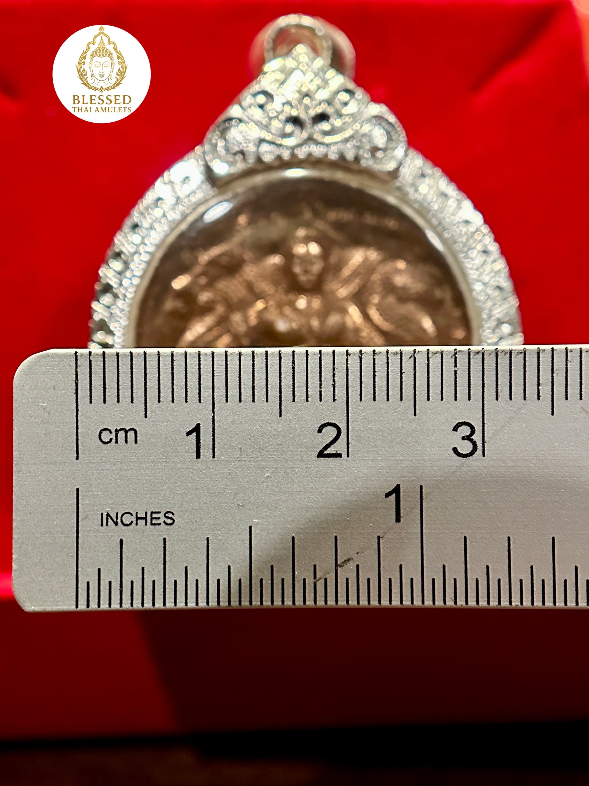 The intricate raised relief and the ornate silver-toned casing add a regal aesthetic to this sacred piece, making it not just a symbol of spiritual protection but also a display of fine craftsmanship.