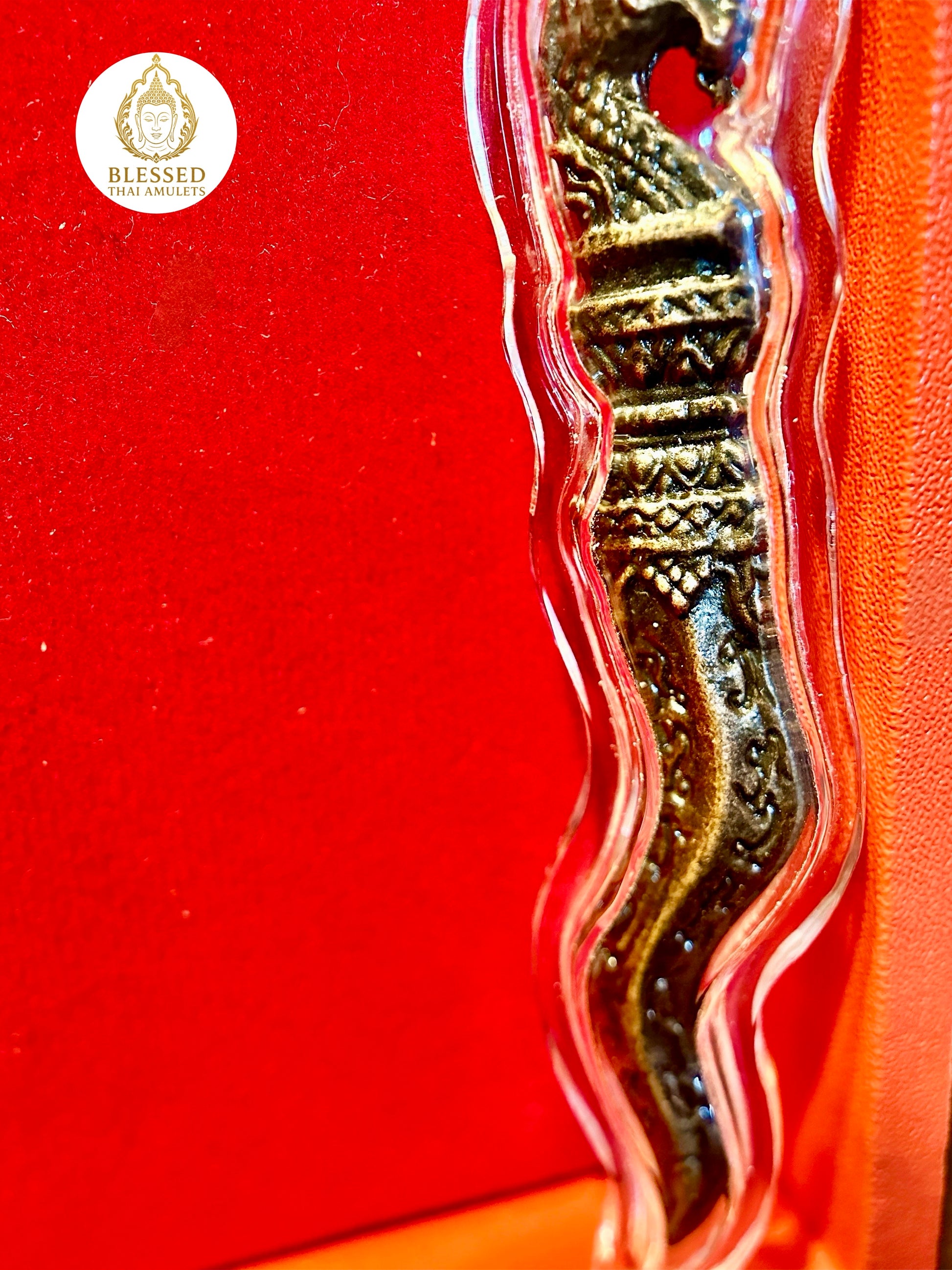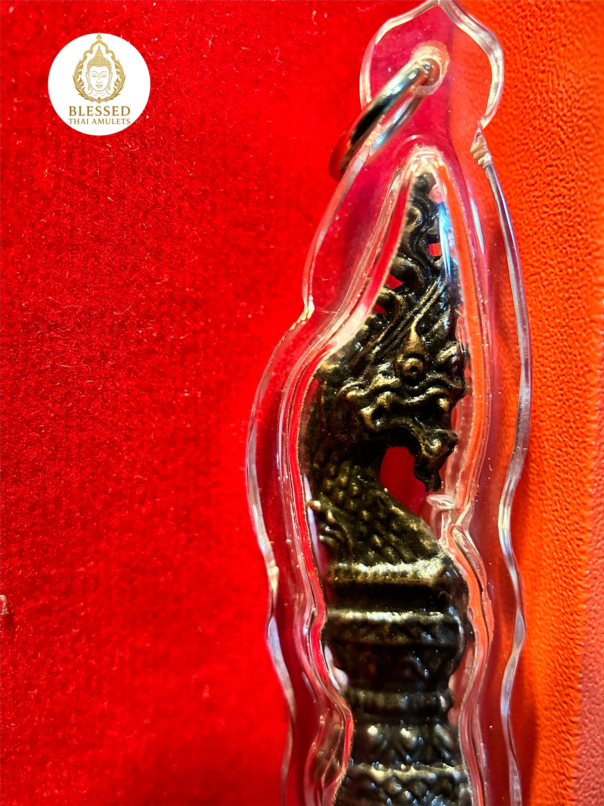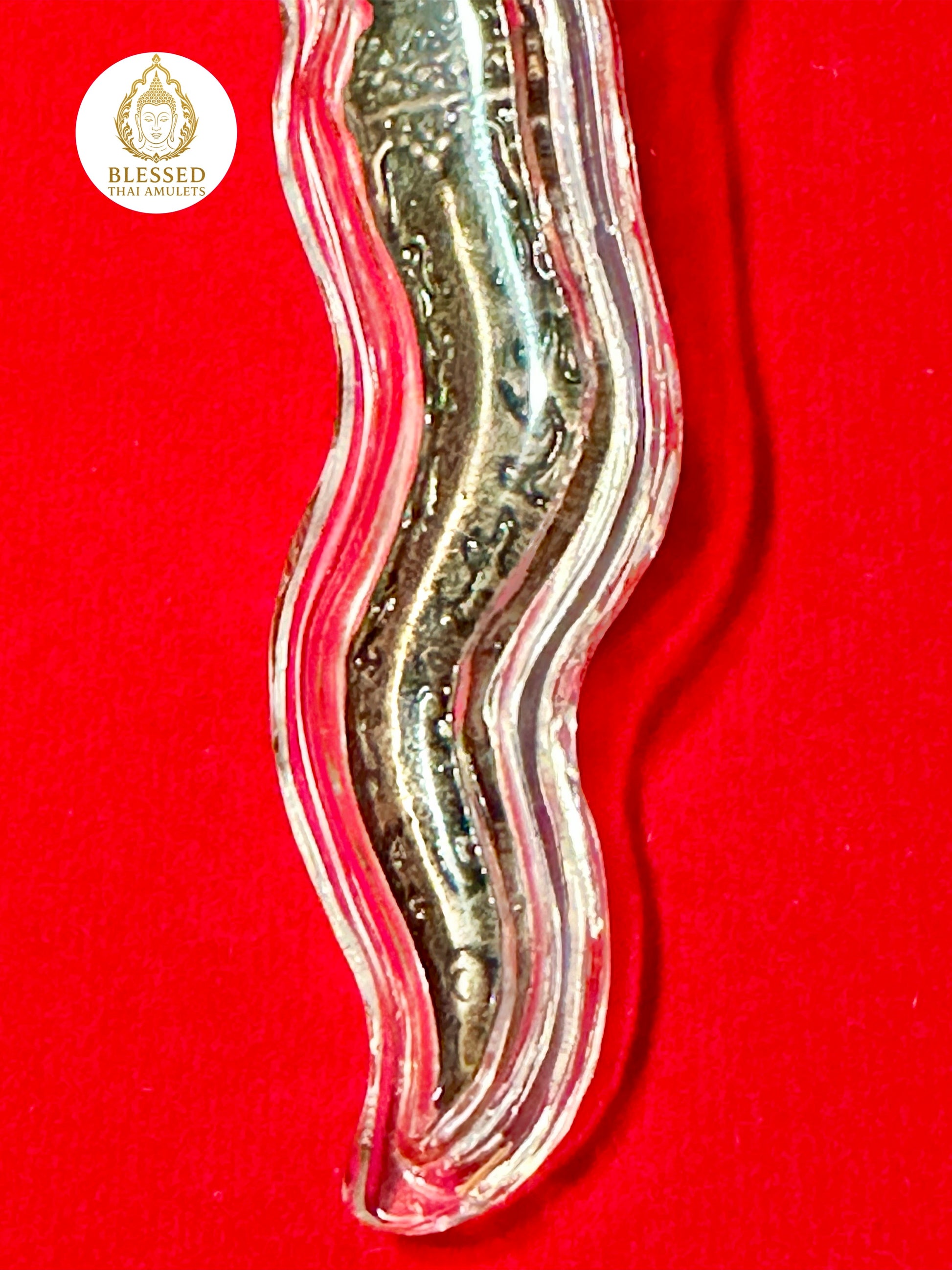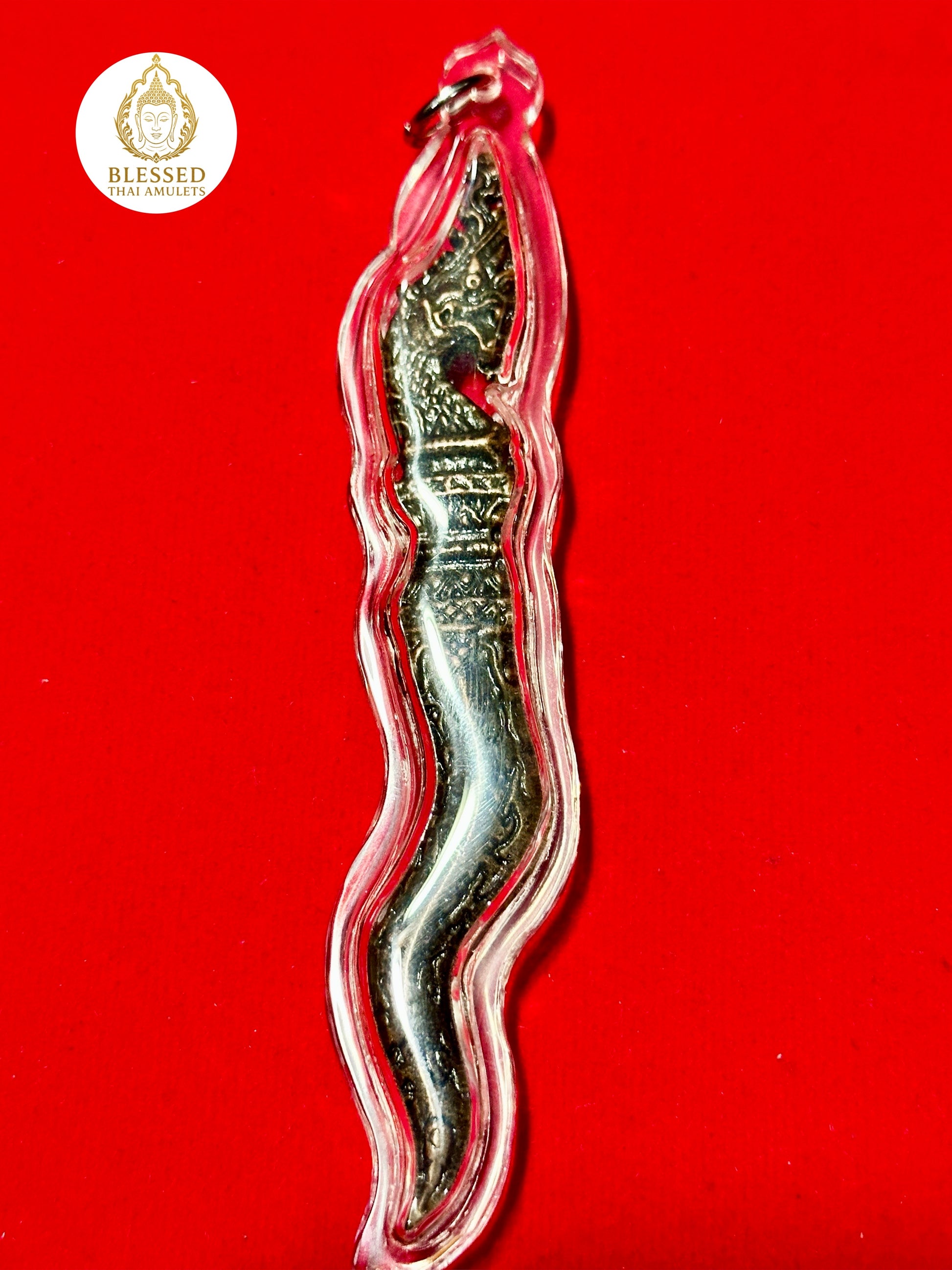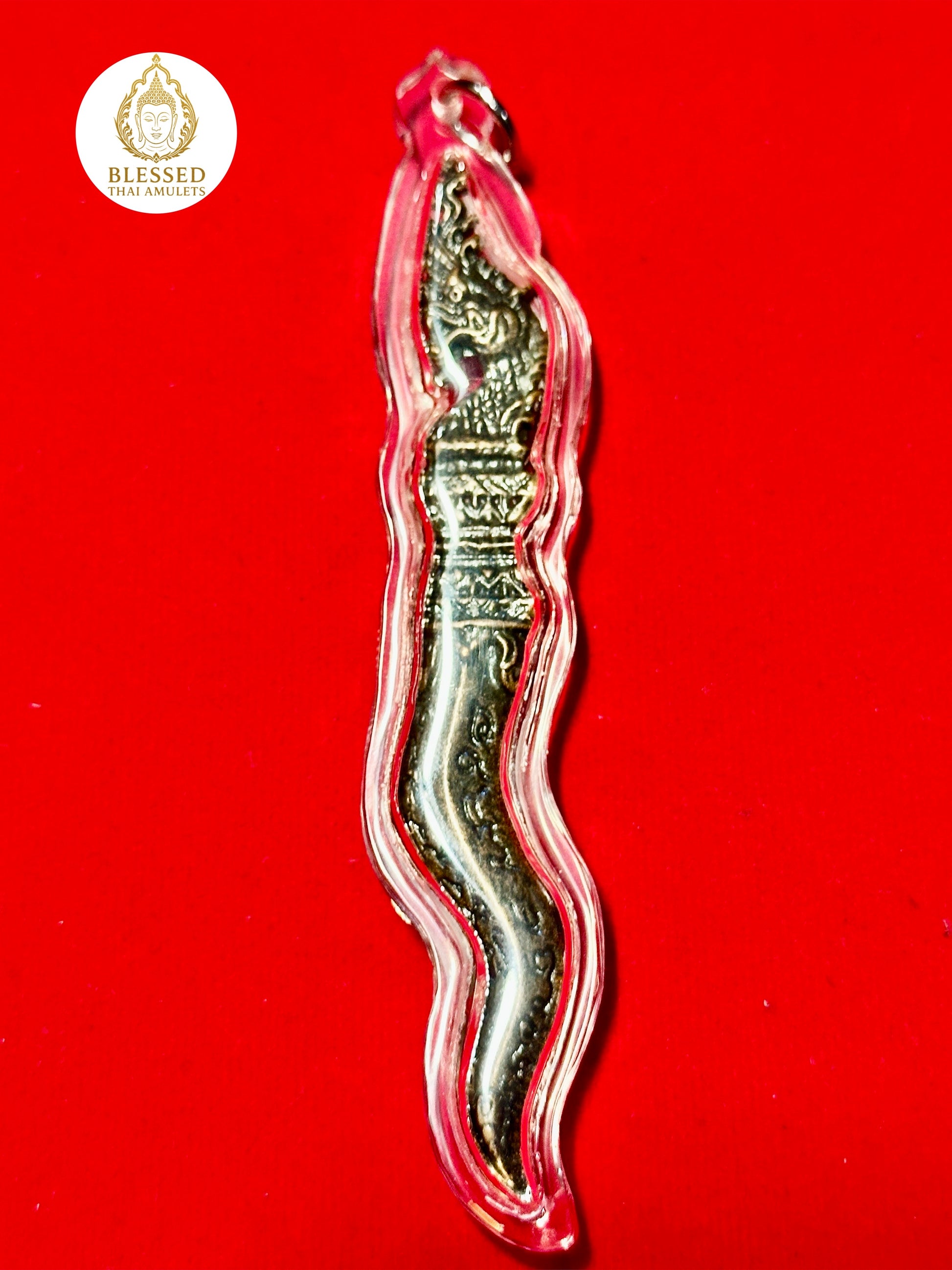This striking Thai talisman features a sinuous wavy blade crowned with the fierce head of the Naga serpent—a divine guardian in Thai and Hindu mythology. Crafted in dark-toned metal with ornate sak yant inscriptions running down the blade, this piece radiates ancient energy.