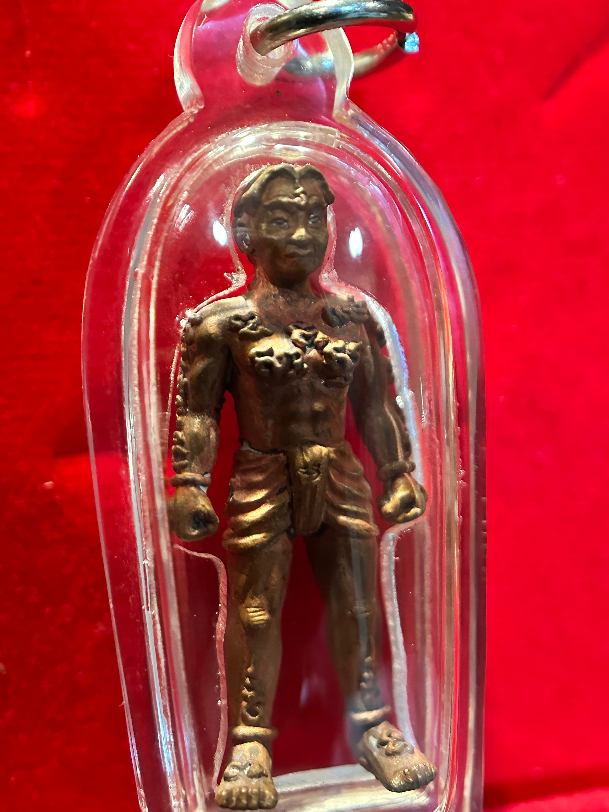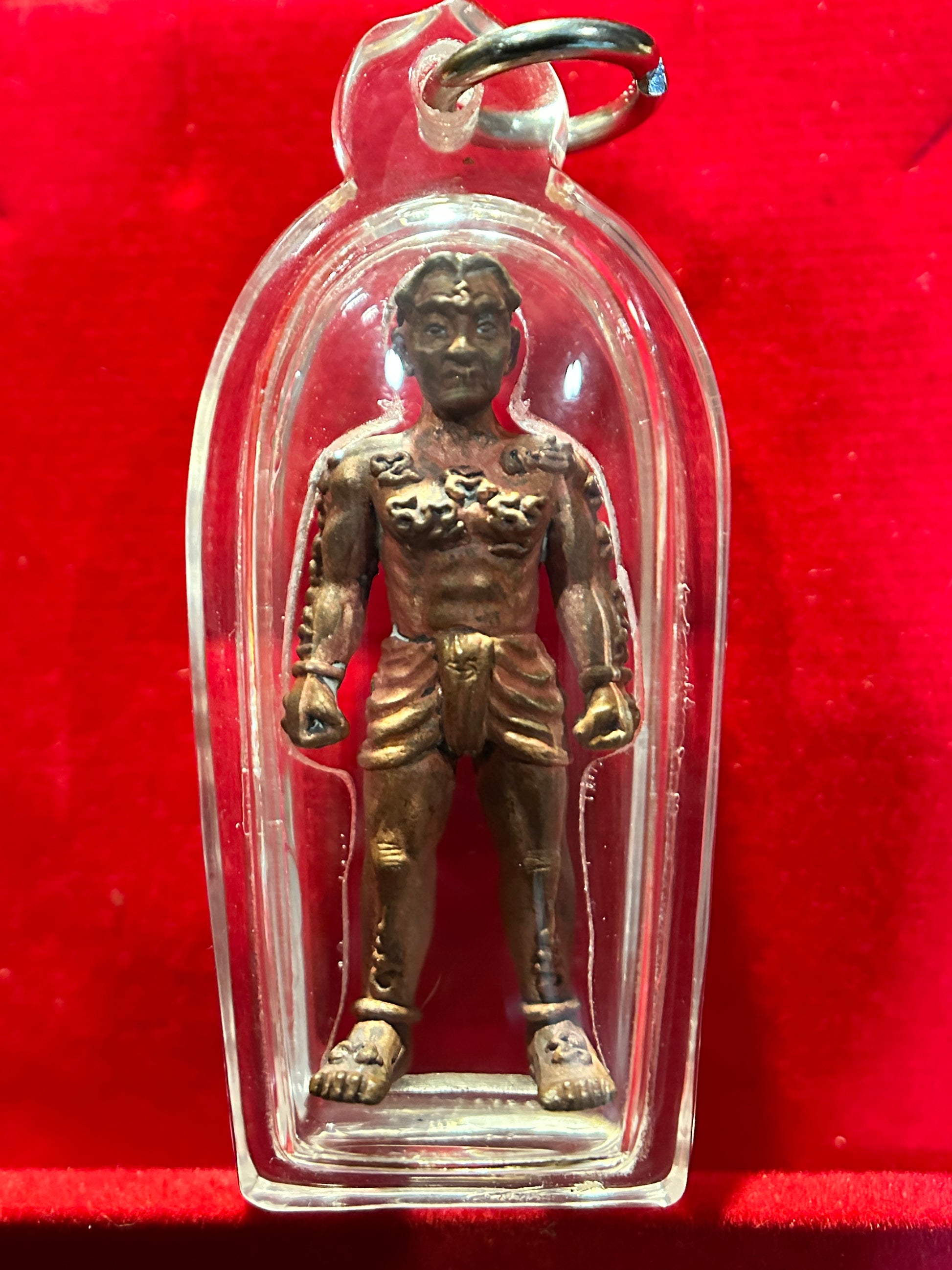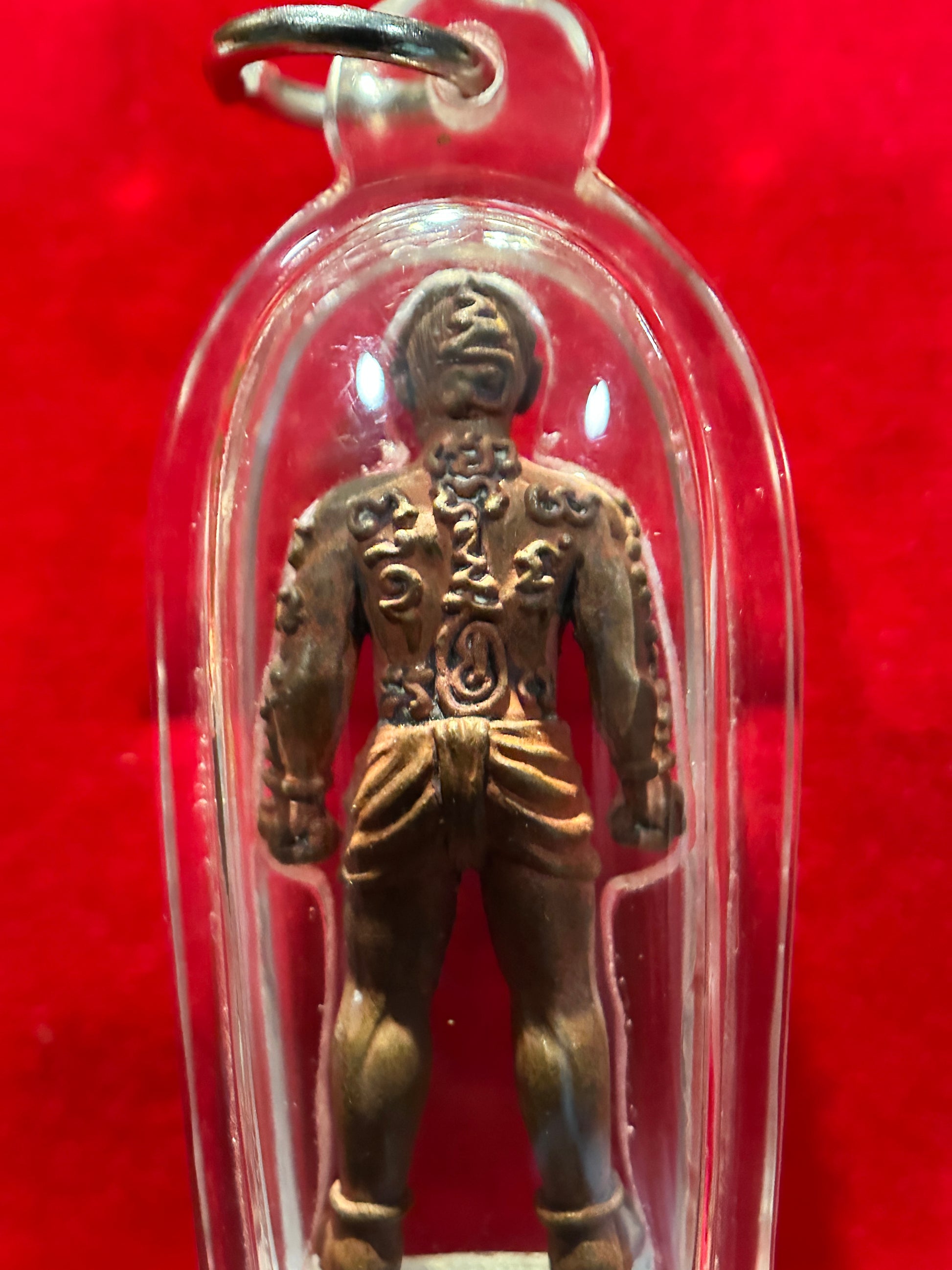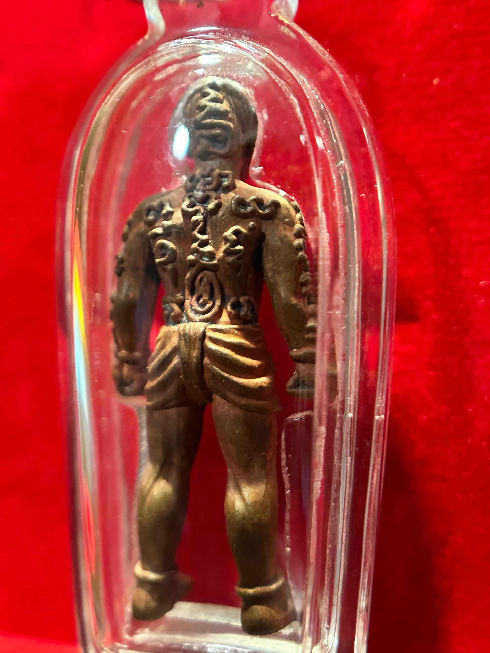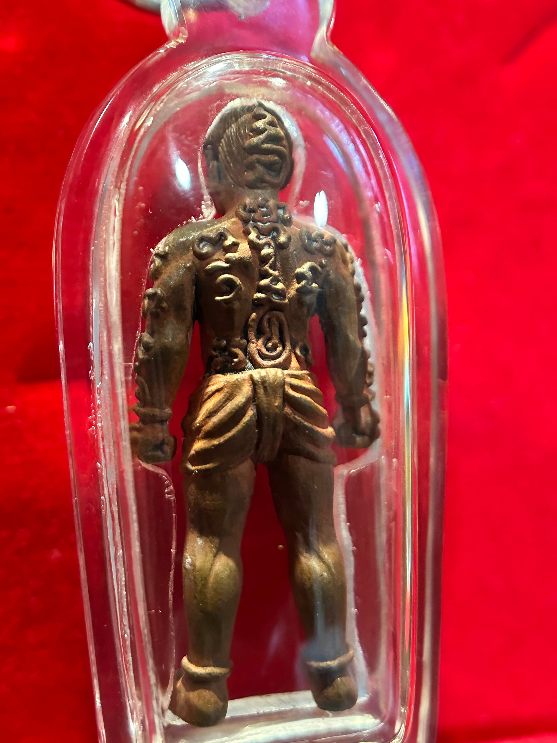 Front: The figure is shirtless and muscular, wearing traditional Thai-style fighting shorts, with sak yant (sacred yantra) markings inscribed across his chest, arms, and legs—often used for power, protection, and courage.