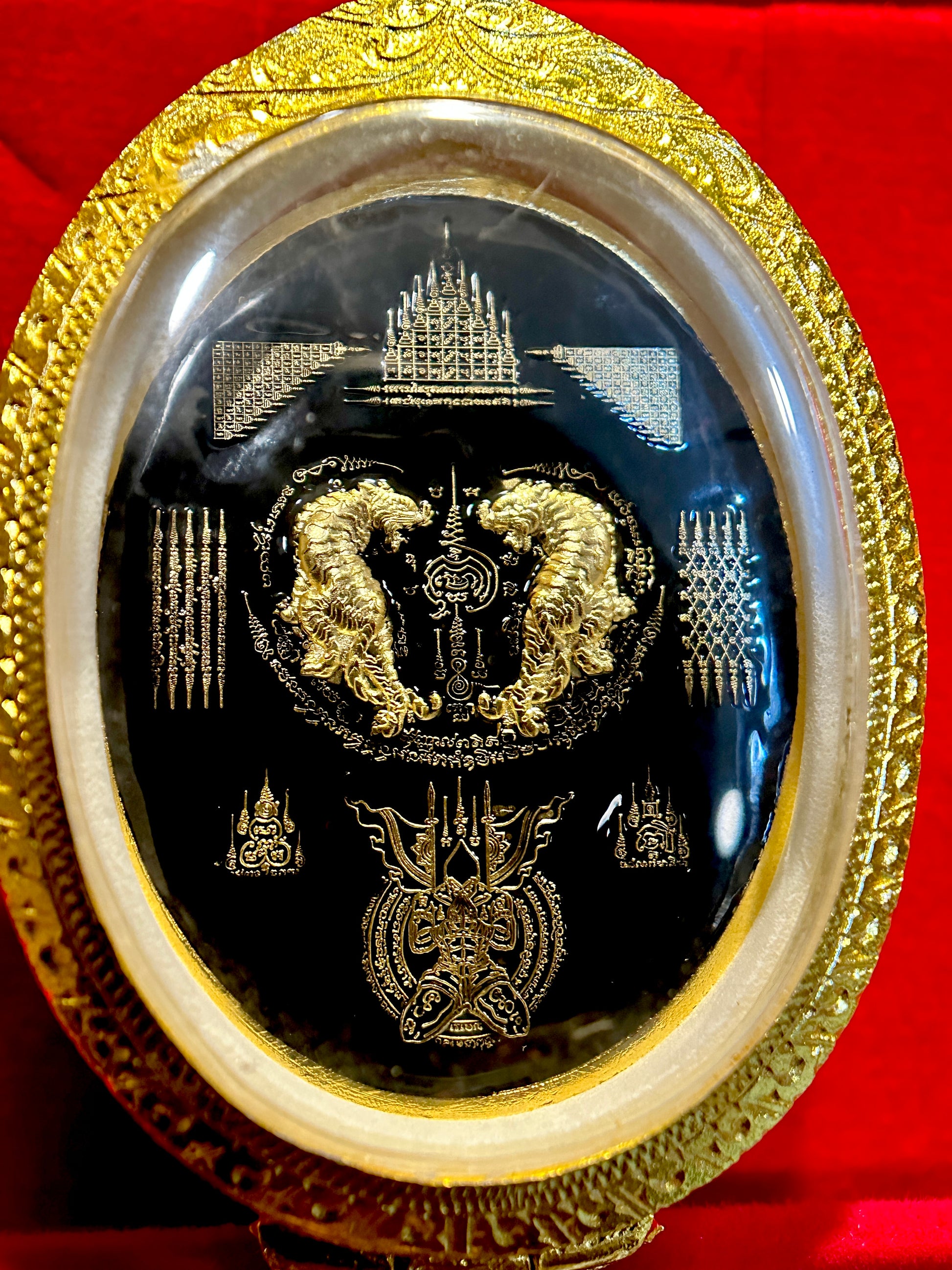 Encased in an ornate gold frame, this amulet was consecrated in a Puttapisek ceremony by Kruba Am of Wat Sung Thammaram (Lamphun, Thailand), imbuing it with sacred energy and blessings for protection and fearlessness.
