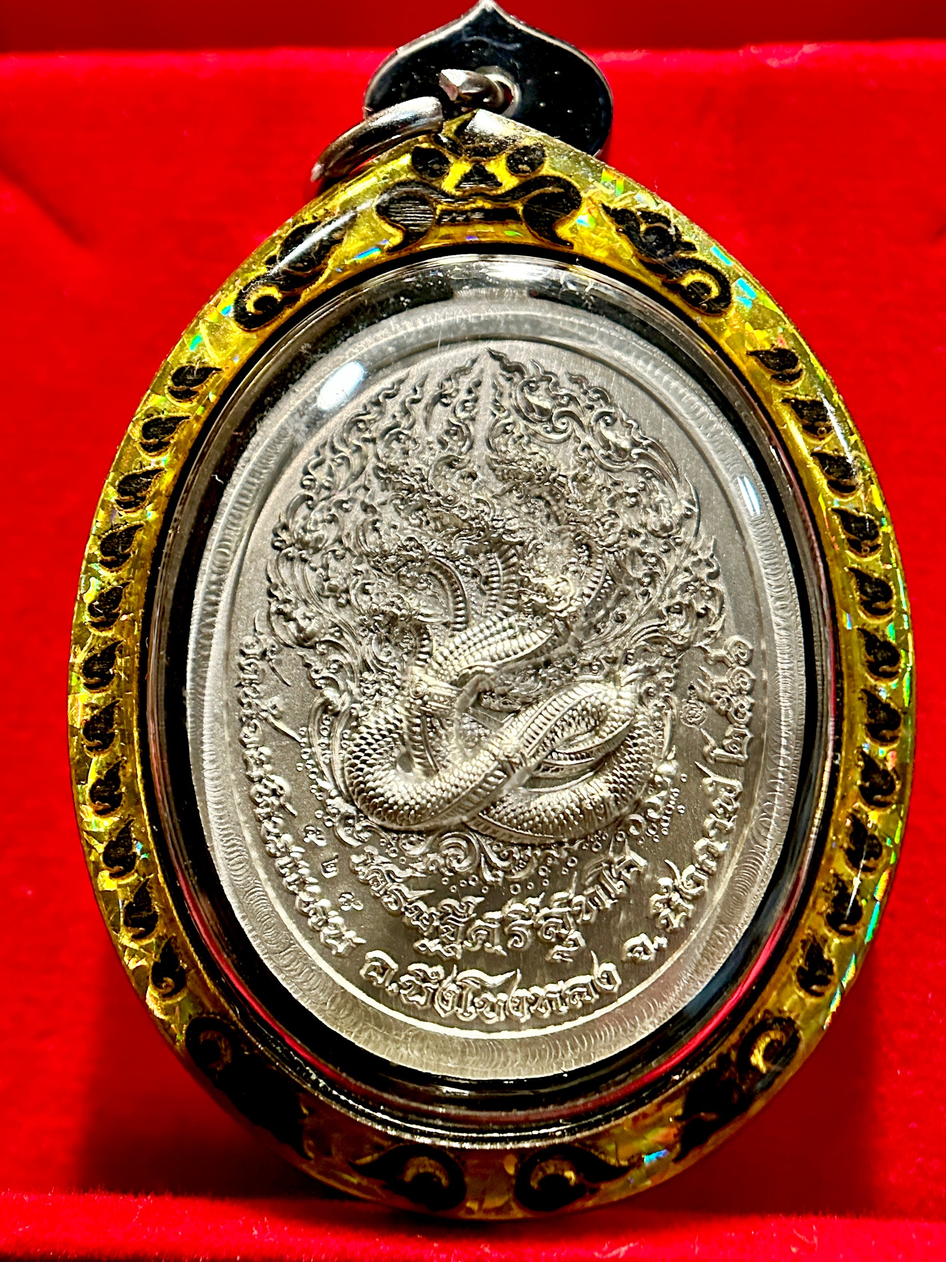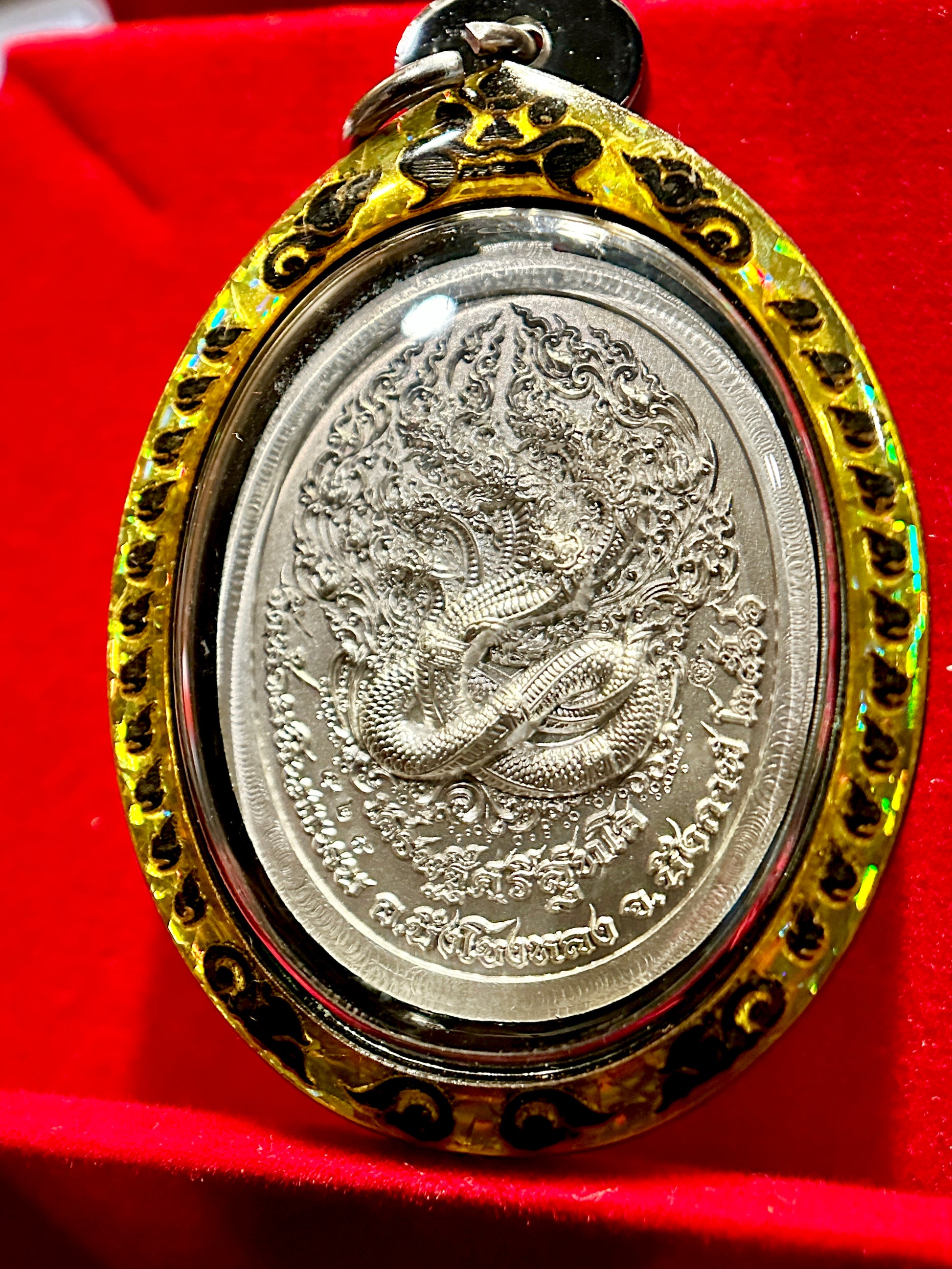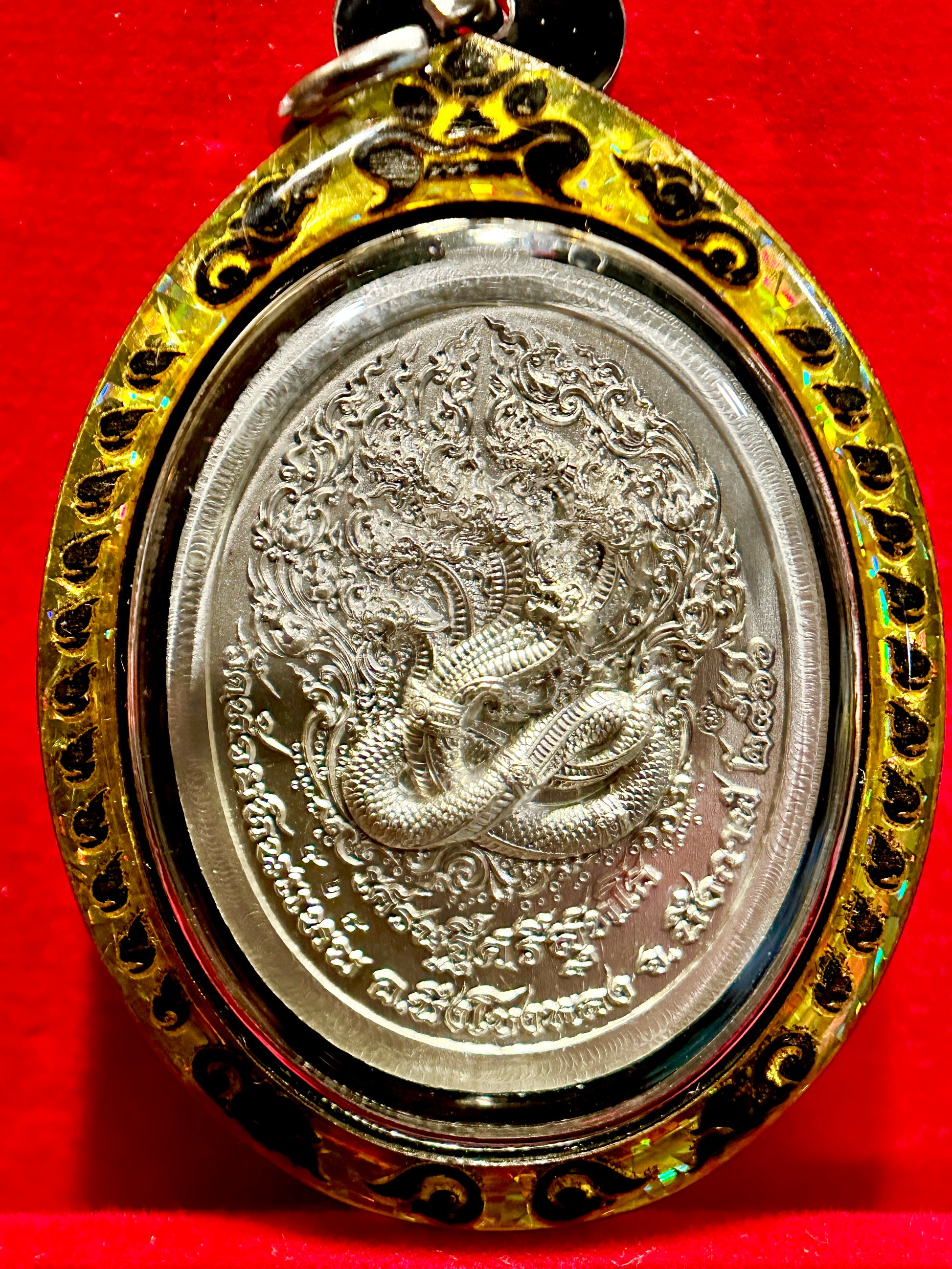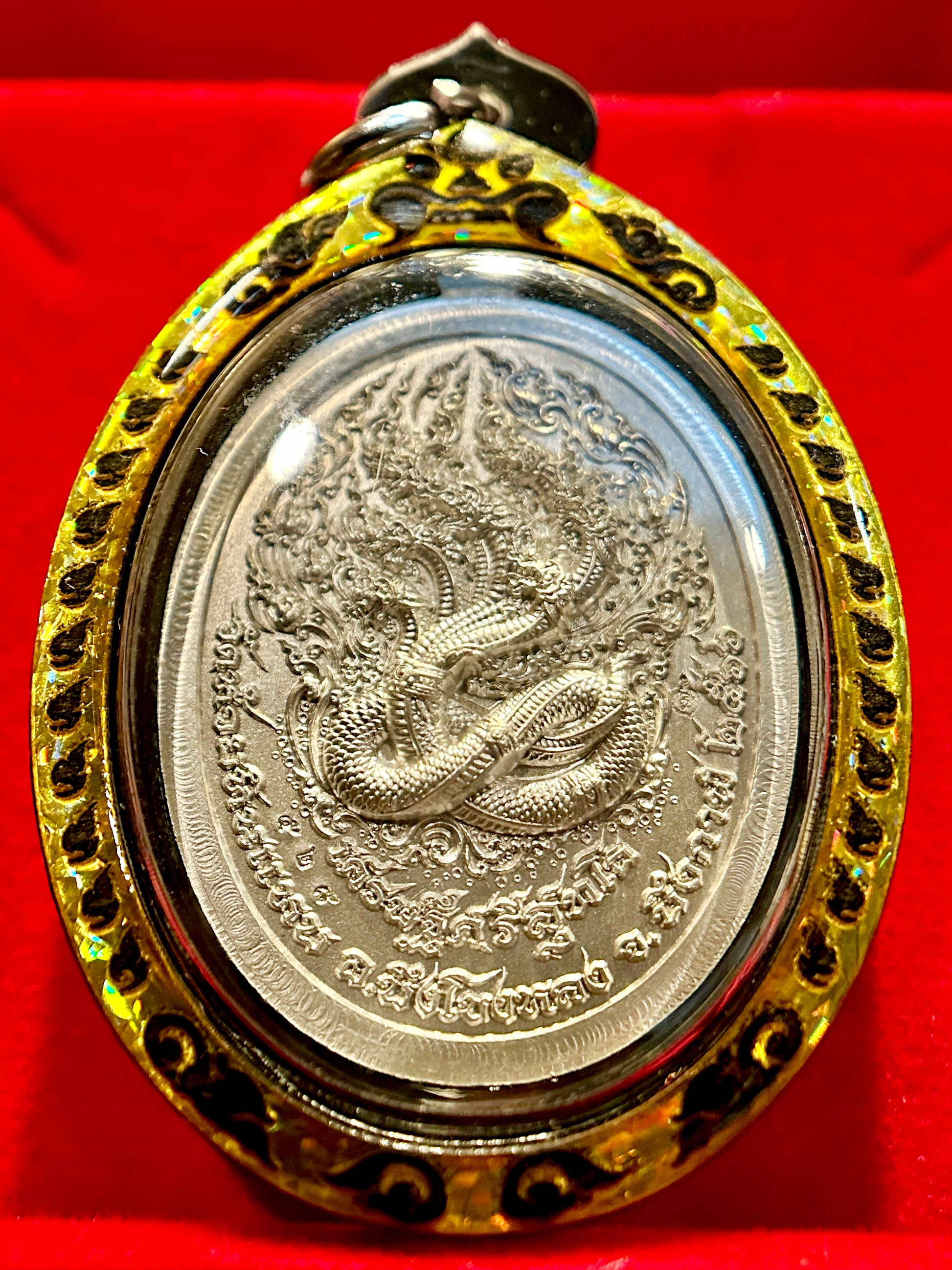 This vibrant double-sided amulet combines the auspicious energy of a Maha Setthi wealth deity on the front with the powerful protection of the Naga Serpent King on the reverse.