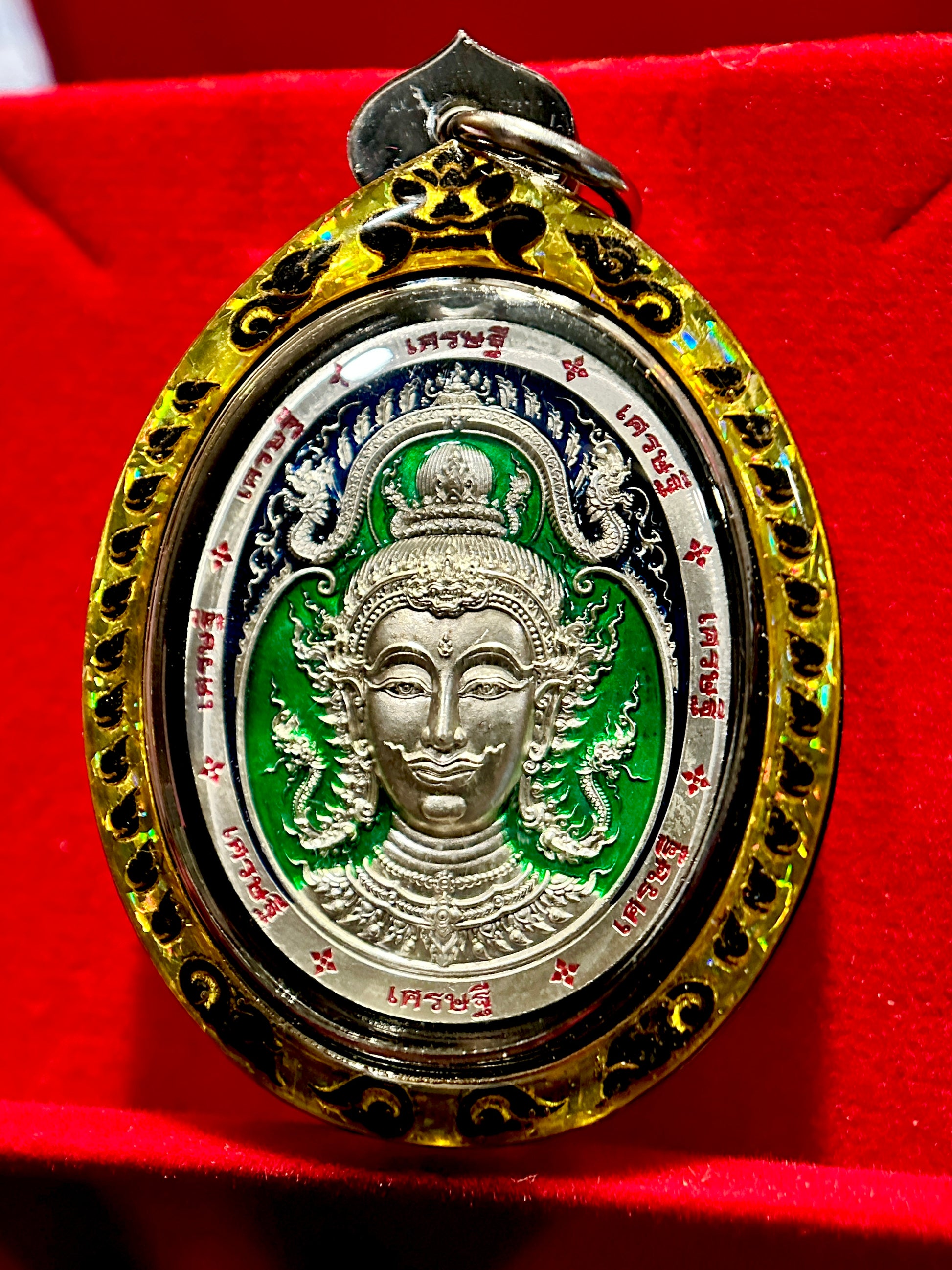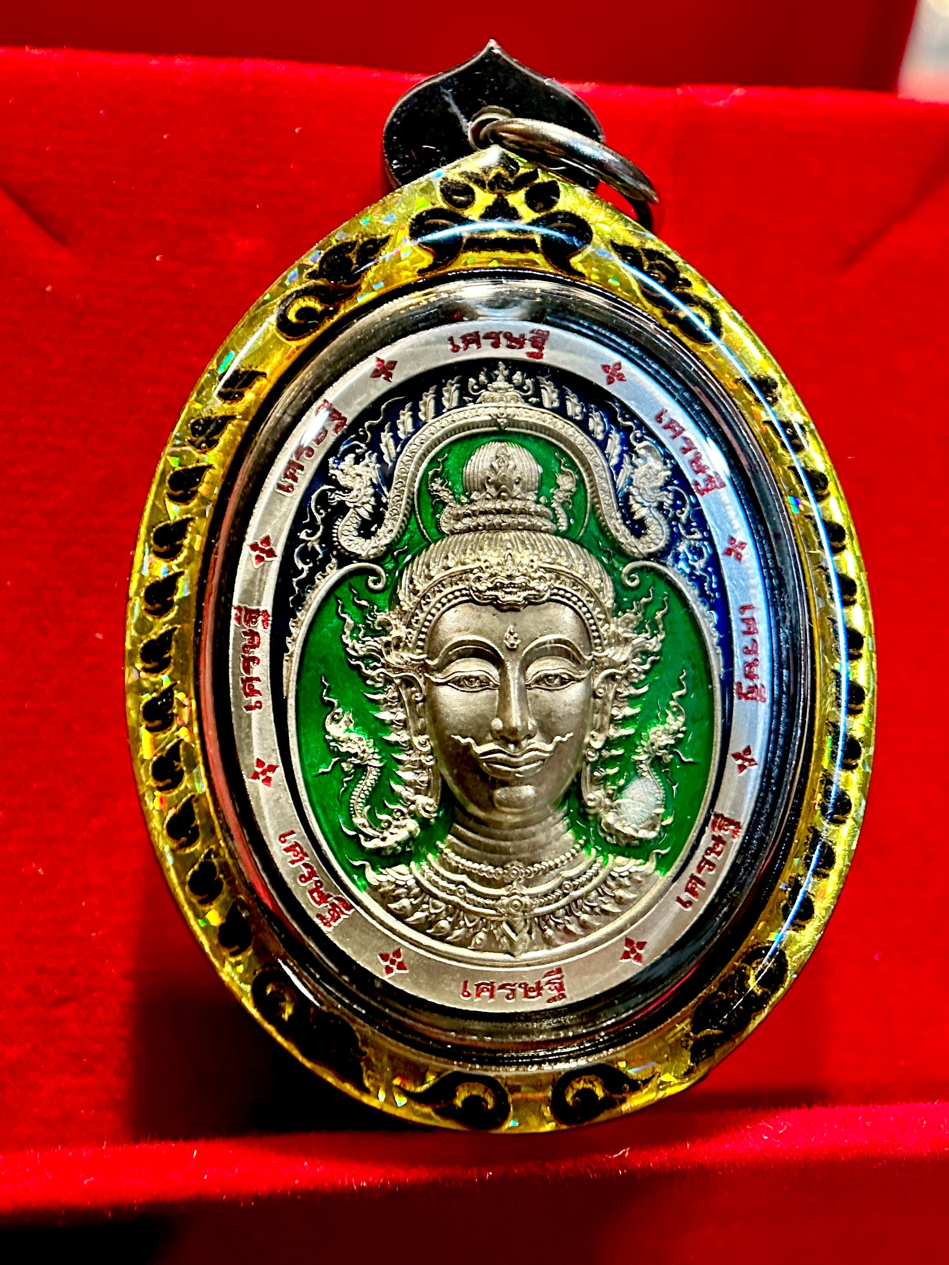 The front features a finely detailed Maha Setthi-style deity face, sculpted in silver with elaborate crown and flame motifs.