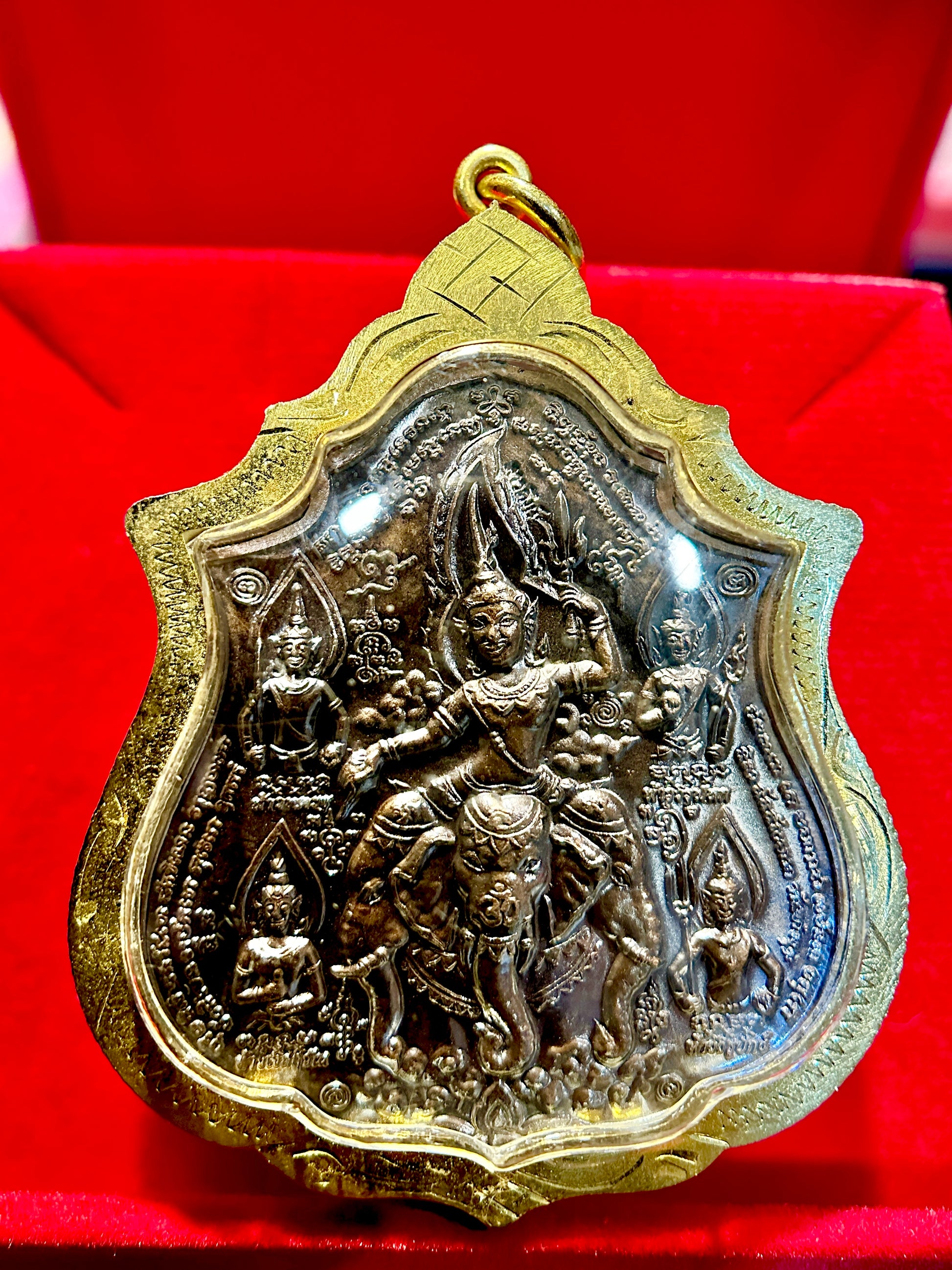 On the reverse, Phra Narai is depicted mounted on the three-headed elephant Erawan, a revered symbol of power, stability, and royal authority in Thai and Hindu mythology. Surrounding him are additional divine beings and protective deities, reinforcing this amulet’s significance as a source of both divine guidance and formidable defense.