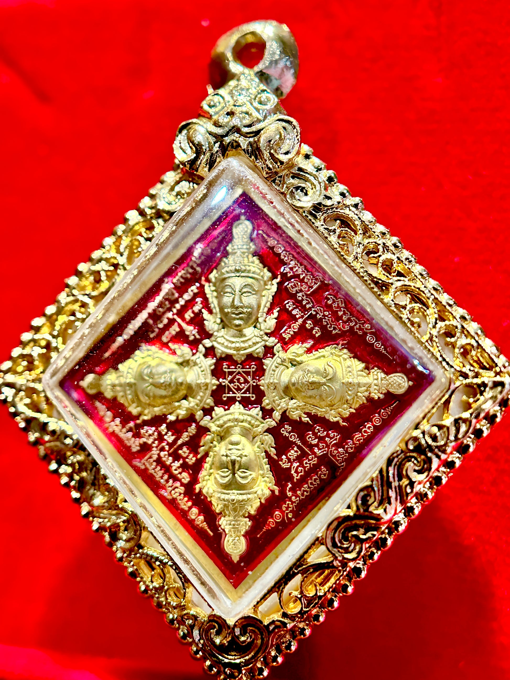 This striking diamond-shaped amulet radiates divine presence and protective strength. On the front, four golden faces of Phra Phrom (the Thai Brahma) are arranged in a cross formation, symbolizing wisdom and blessings in all directions. Each face shines against a rich red enamel backdrop, surrounded by sacred yantra inscriptions, representing clarity, prosperity, and universal compassion.