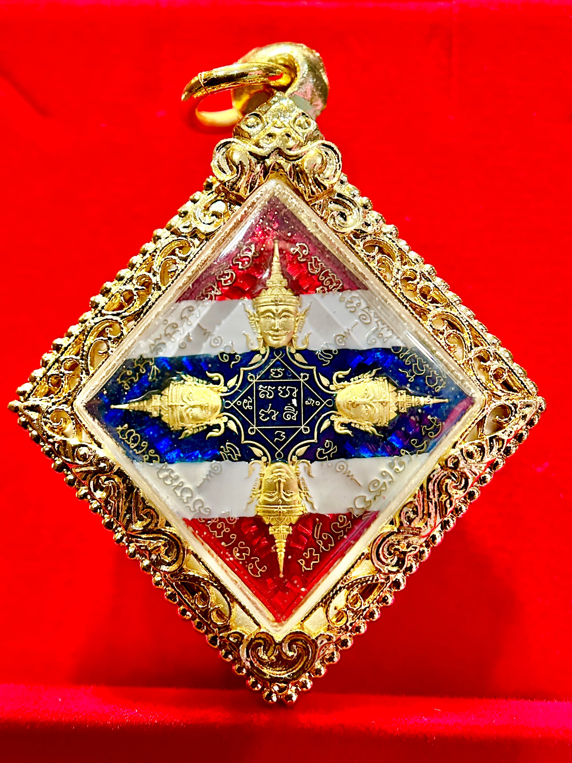 This radiant amulet showcases Phra Phrom (พระพรหม), the four-faced deity of wisdom, prosperity, and protection, set within a striking diamond-shaped design. The front features four golden faces of Phra Phrom arranged around a central yantra, symbolizing guidance and blessings from all directions. Behind them is the bold backdrop of the Thai national flag in red, white, and blue enamel, representing faith, purity, and strength. Delicate sacred inscriptions encircle the design, amplifying its spiritual energy.