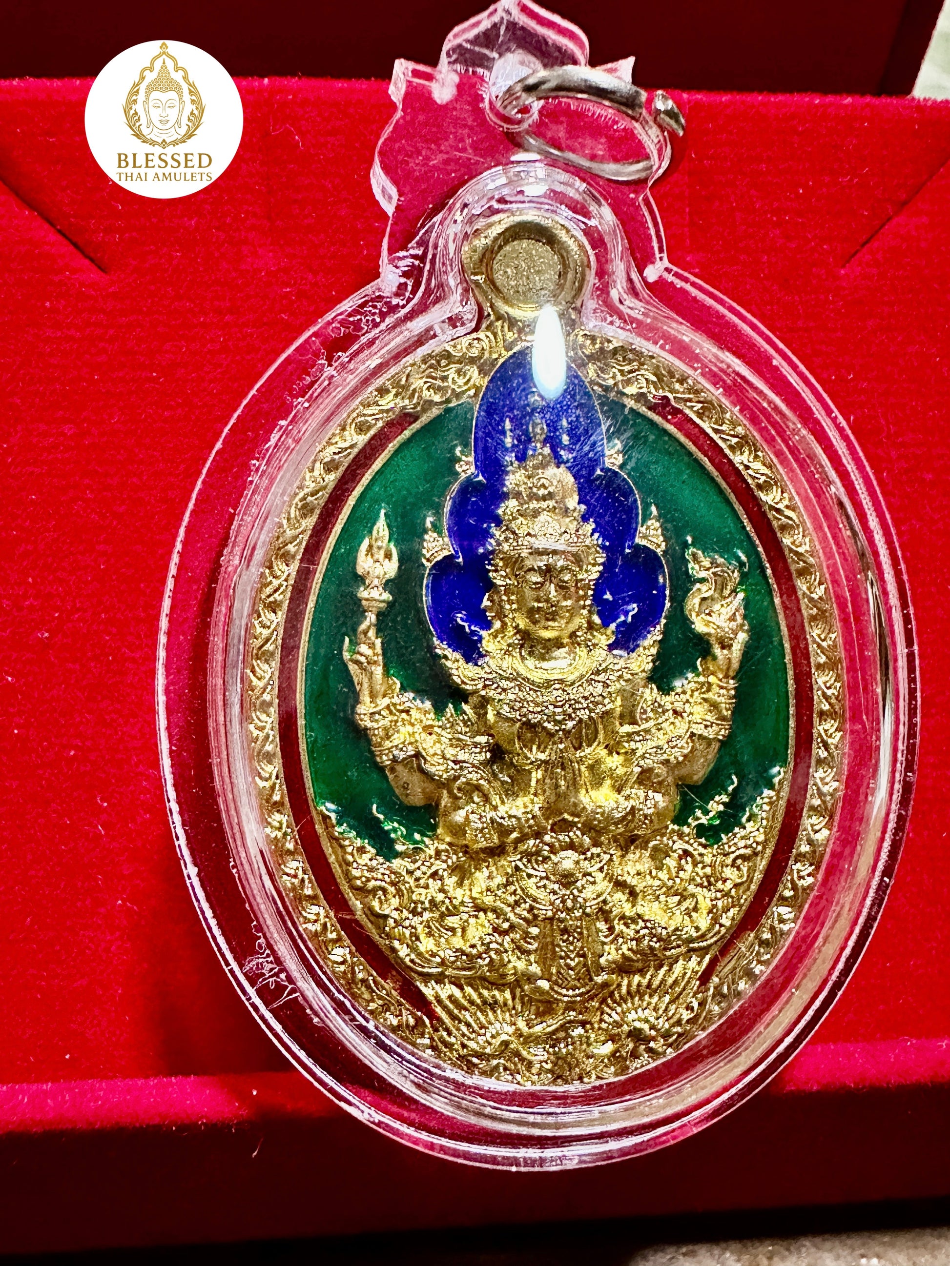 🔸 Front: Phra Phrom sits in majestic meditation, surrounded by a brilliant gold finish and crowned with a radiant blue flame aura. Each of his four faces represents a sacred divine virtue: kindness, compassion, empathy, and equanimity. With eight arms holding sacred objects, he blesses the wearer with divine support from all directions. The lush emerald green backdrop and ornate gold detailing amplify the amulet’s elegance and spiritual radiance.