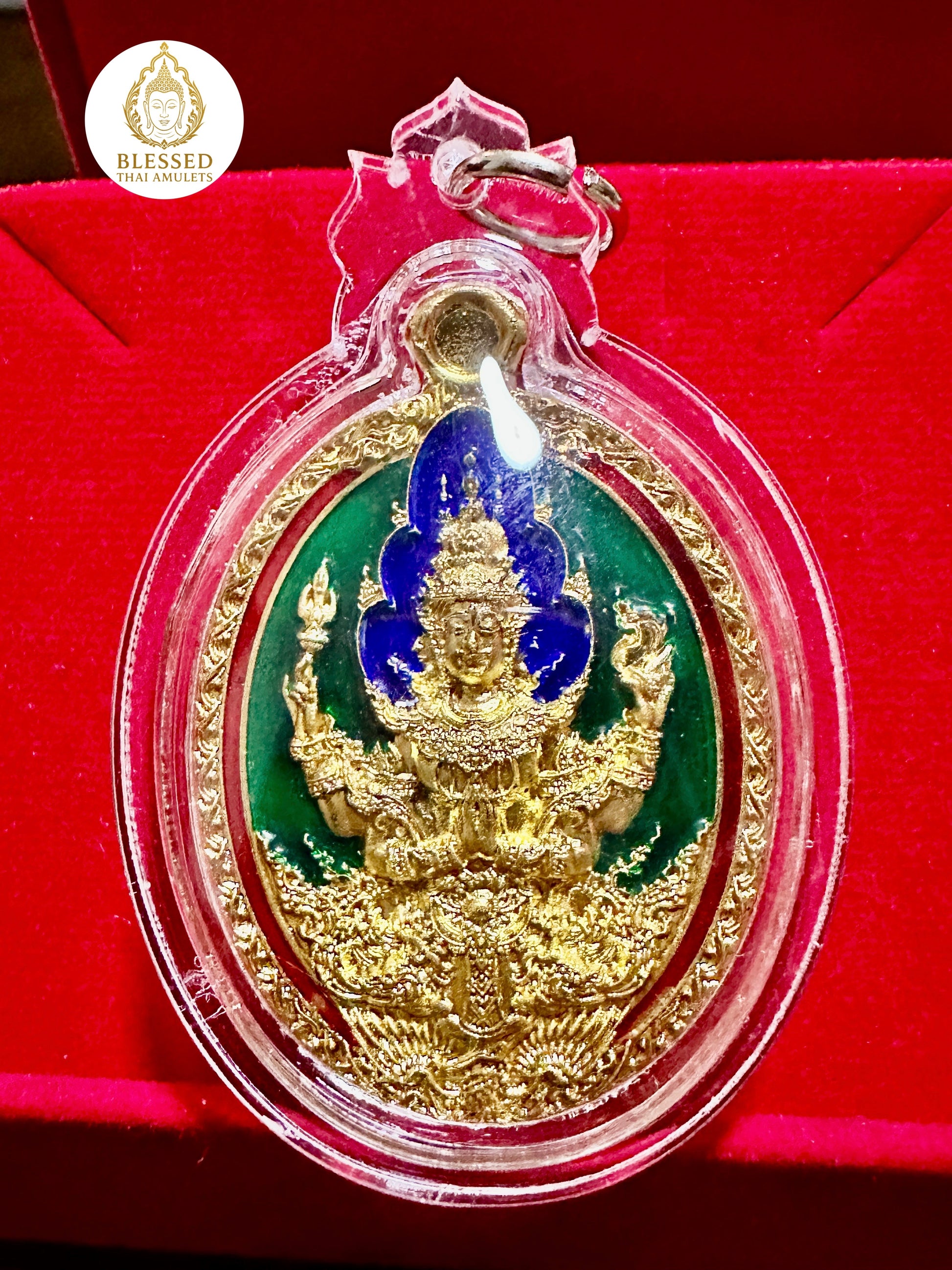 This exquisite Thai amulet features Phra Phrom, the Four-Faced Brahma deity, revered across Thailand and Southeast Asia for granting powerful blessings in all areas of life—wealth, health, love, success, and protection.