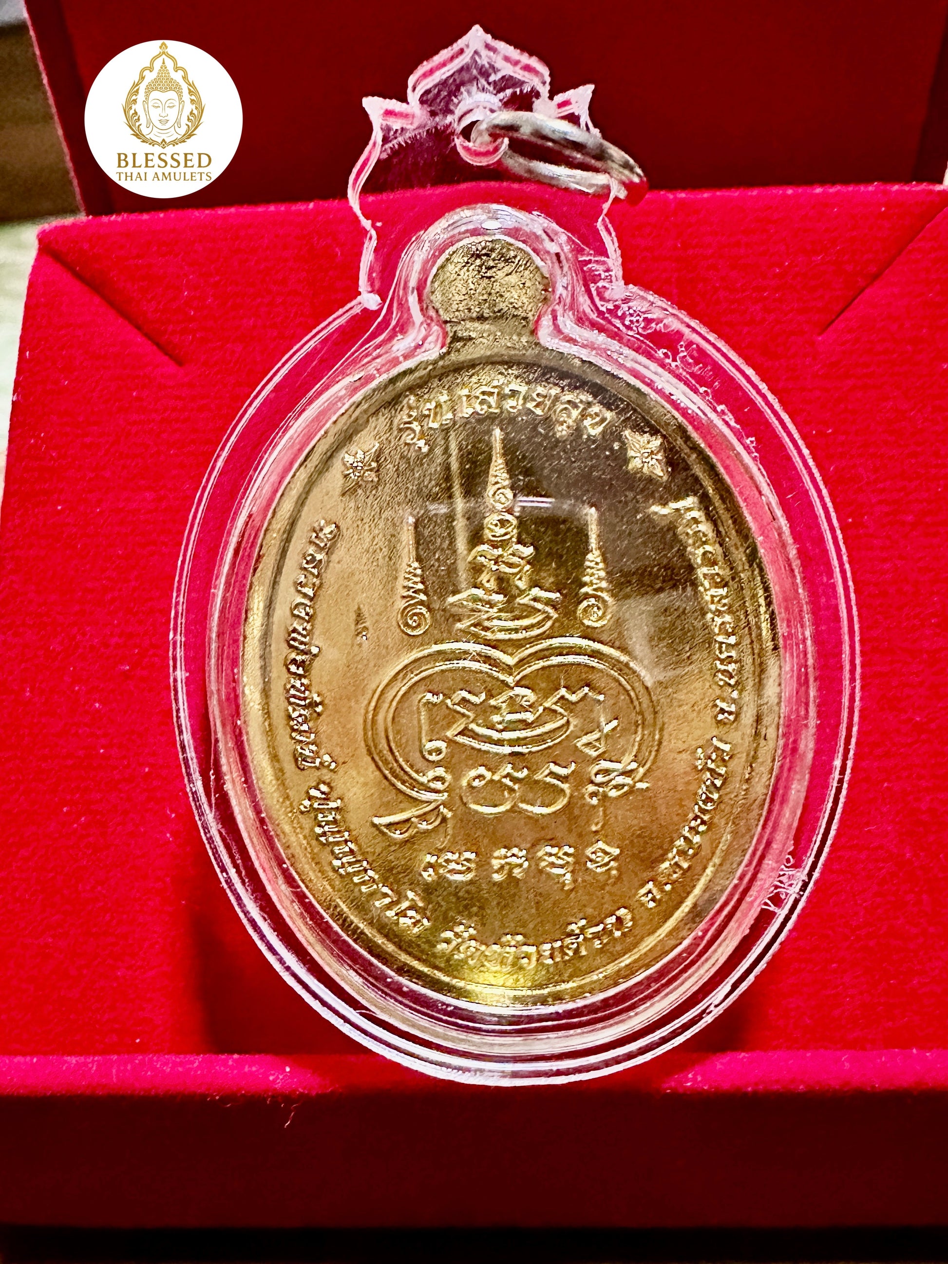🔸 Back: The reverse features a sacred yantra inscription with a crowned stupa and heart-shaped design, surrounded by ancient Khmer script and invocations. This particular batch is marked with “รุ่นเศรษฐีรวย” (“Millionaire Wealth Edition”)—enhancing its power for abundance, fortune, and favorable destiny.