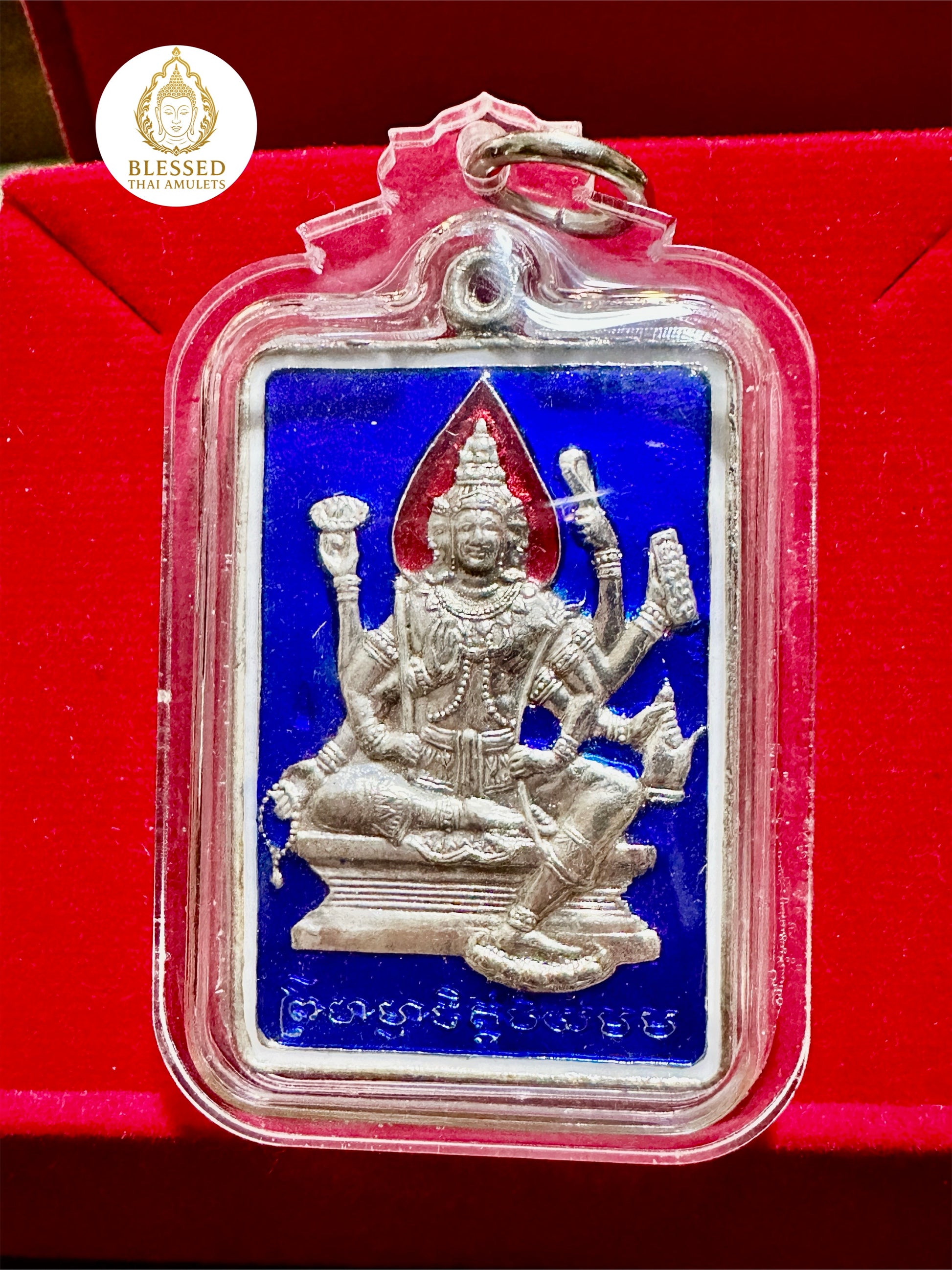 🔹 Front: Phra Phrom is shown seated gracefully with four serene faces, representing compassion, kindness, sympathy, and impartiality. His eight arms hold sacred items like a scepter, conch, chakra, and scriptures—each symbolizing a specific form of divine assistance. The vivid sapphire blue enamel backdrop adds celestial brilliance and spiritual clarity to the design.