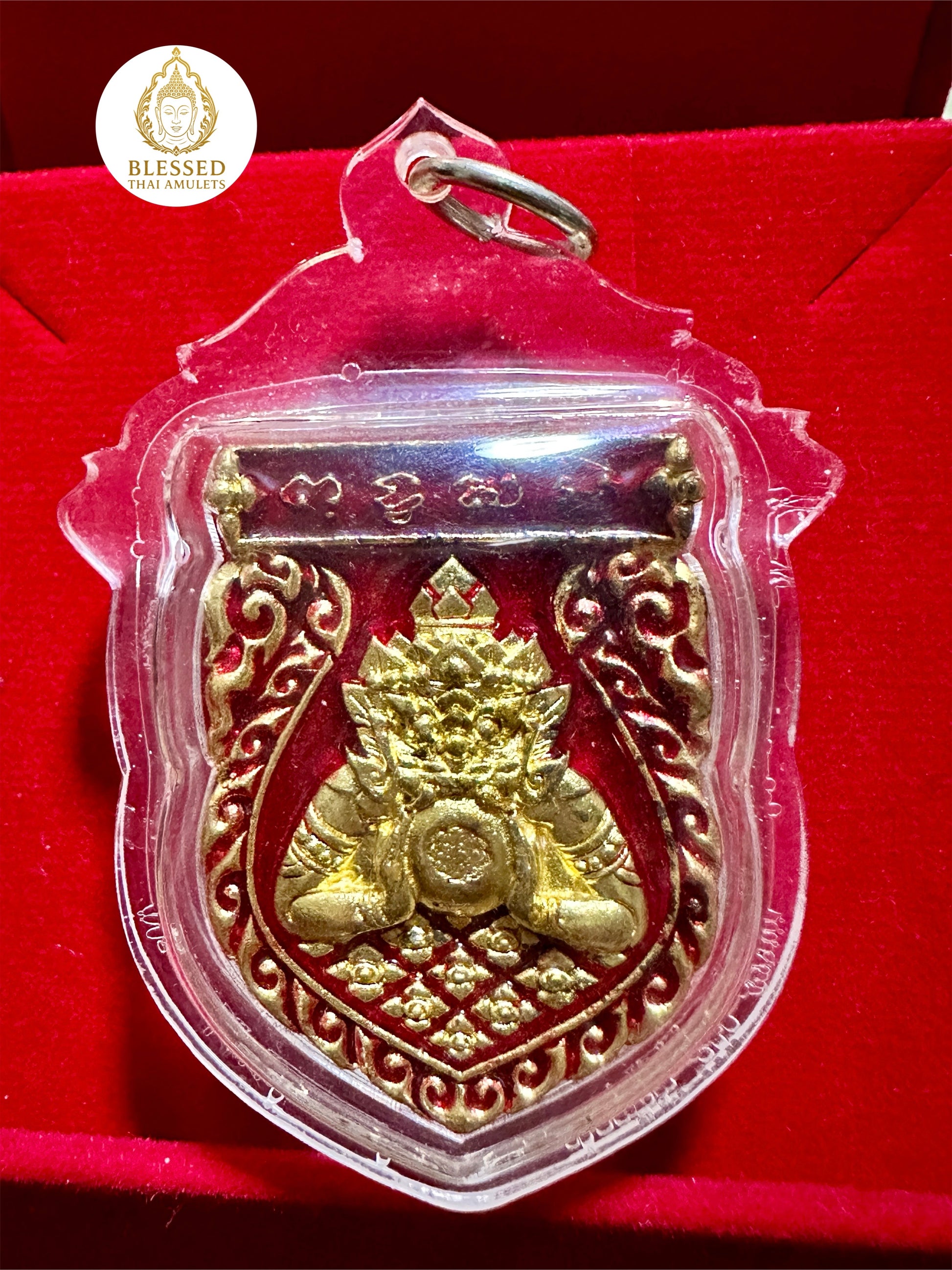 On the reverse, the amulet displays a fierce two-faced Rahu deity gripping the moon, a rare depiction that enhances its potency in repelling misfortune and dark energy. Set on a striking red backdrop with gold ornamental trim, this amulet channels both light and shadow forces for complete spiritual defense and prosperity.