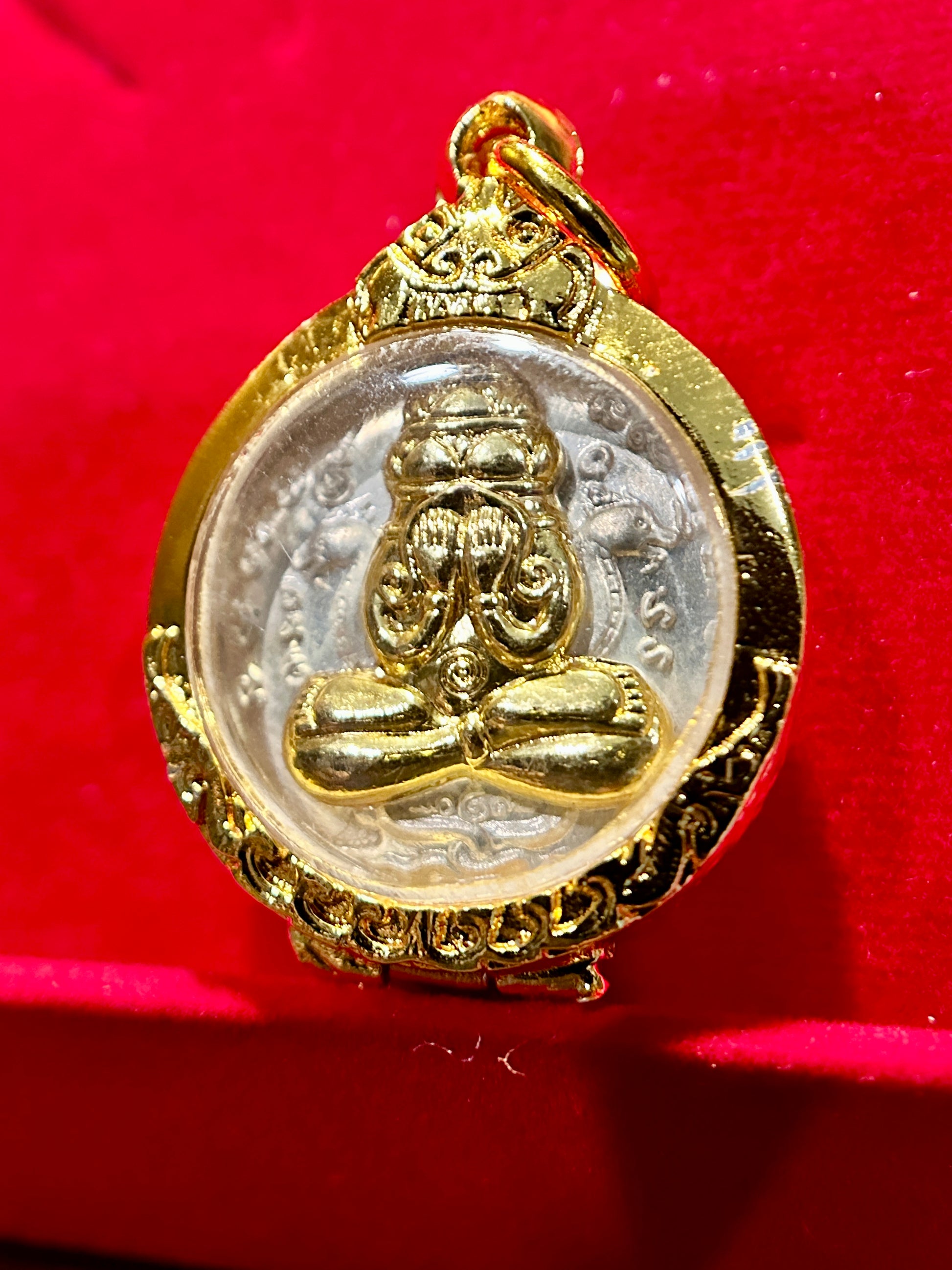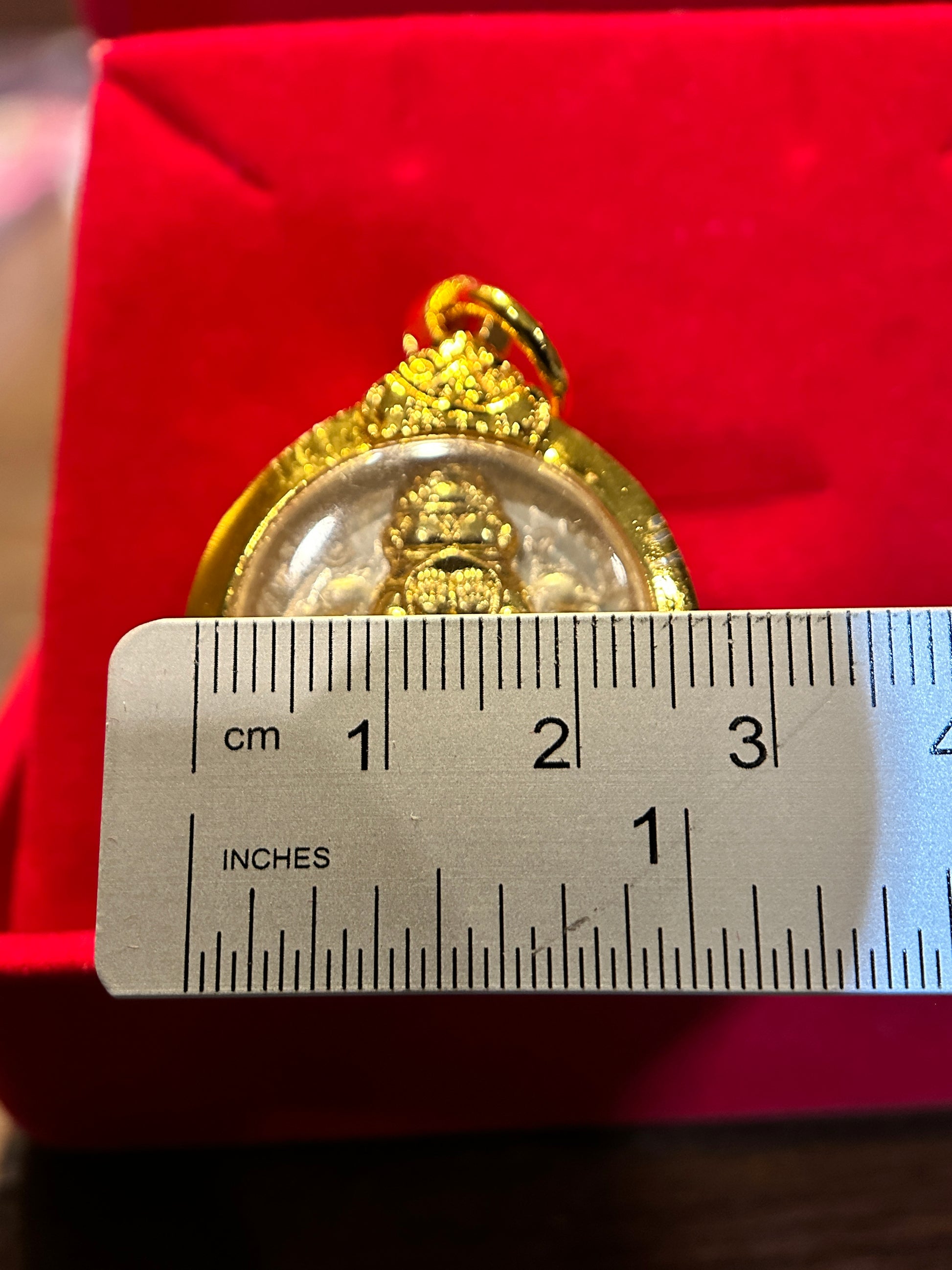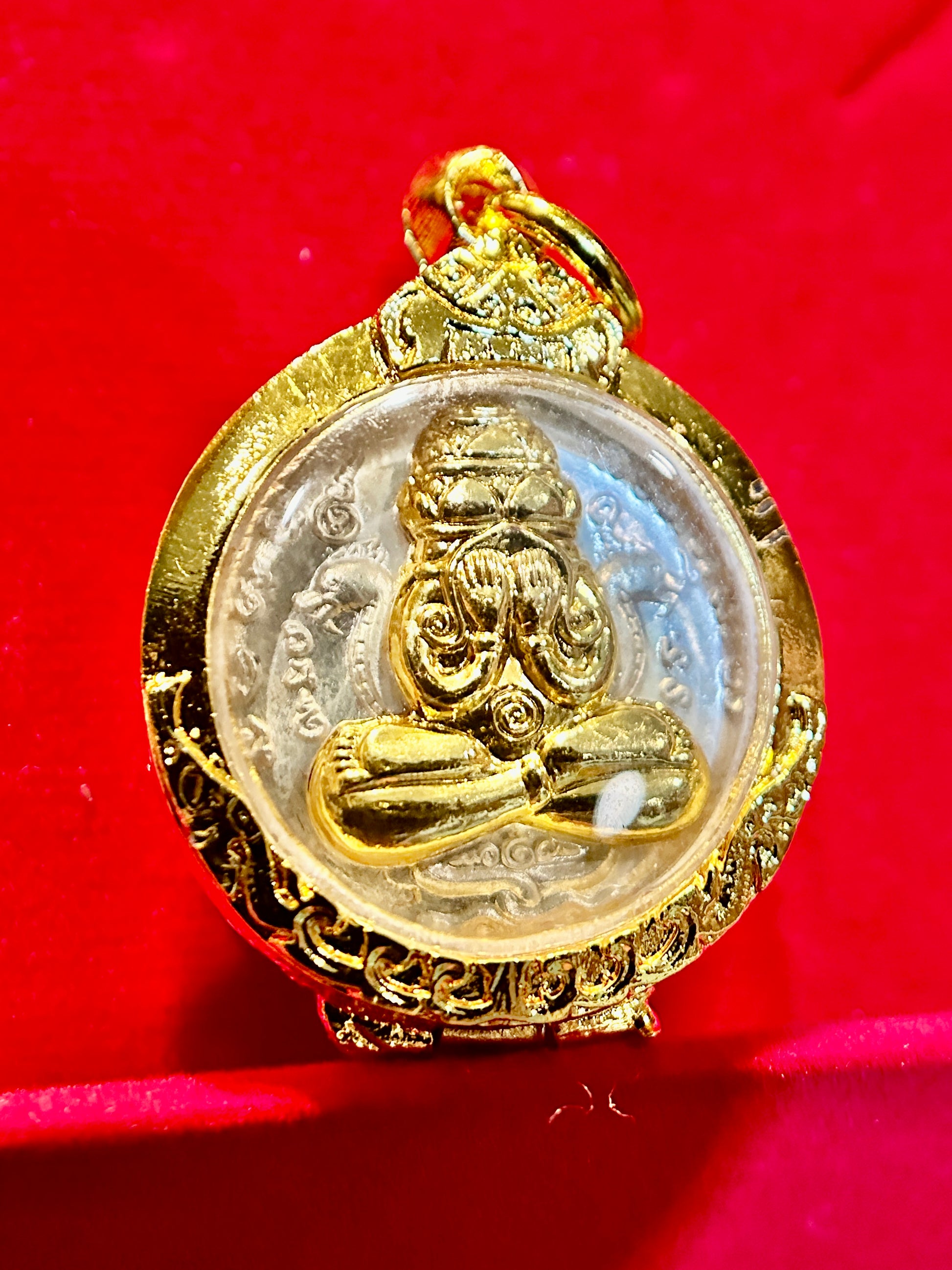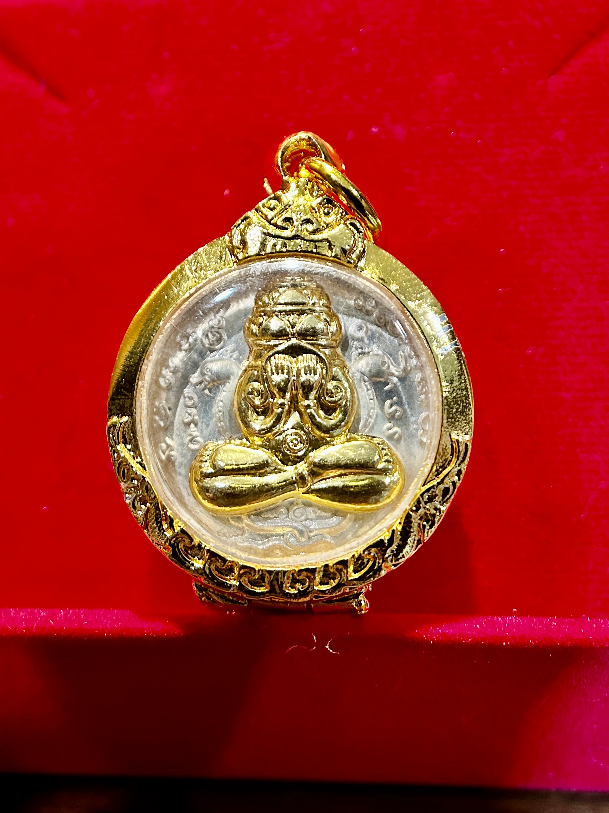 This finely crafted amulet features Phra Pidta on the front, the revered “Closed Eyes” Buddha known for warding off misfortune, concealing the wearer from danger, and attracting wealth. Cast in radiant gold-tone against a circular sacred backdrop, Phra Pidta’s meditative pose channels deep spiritual focus and protective blessings.