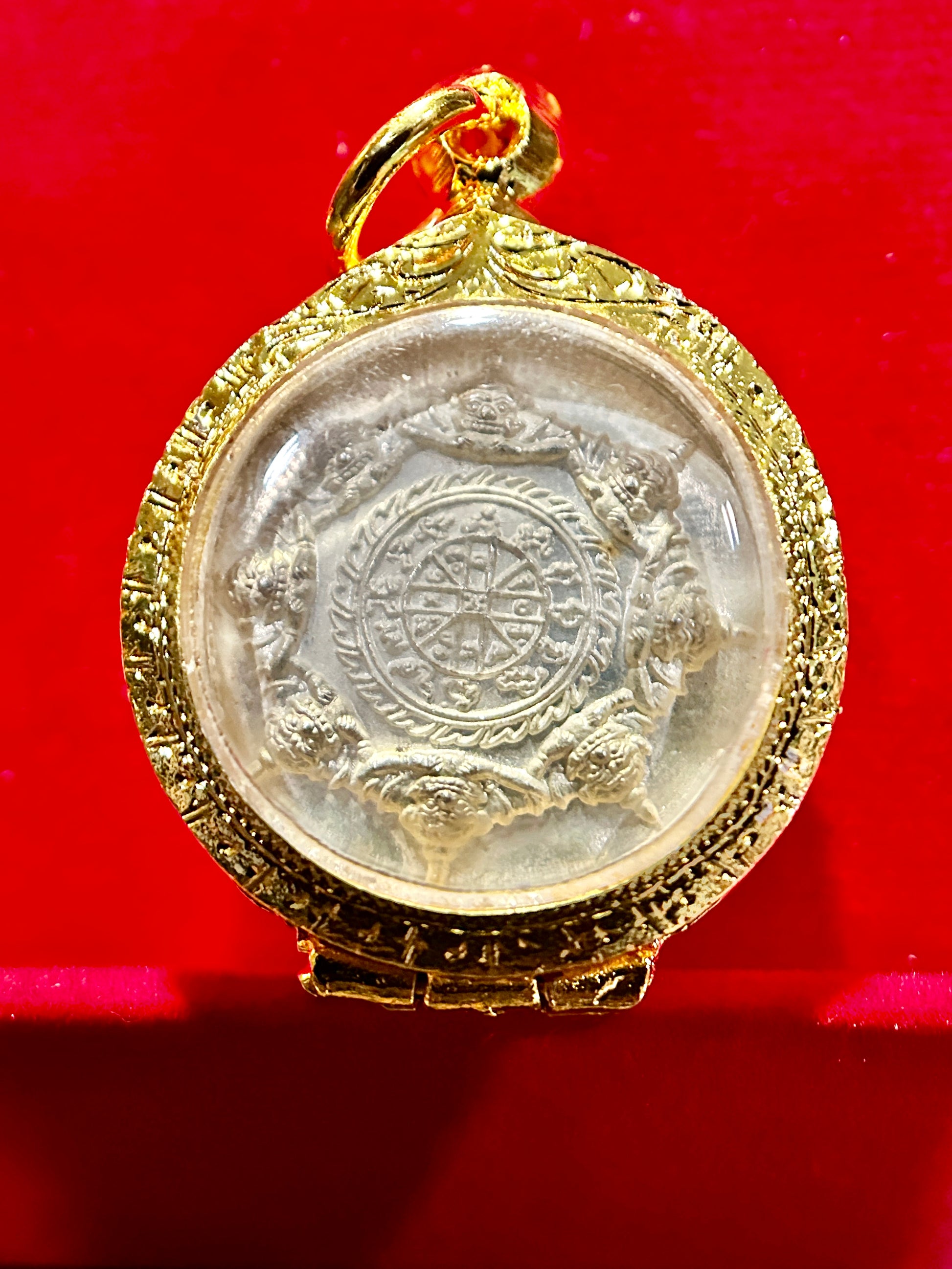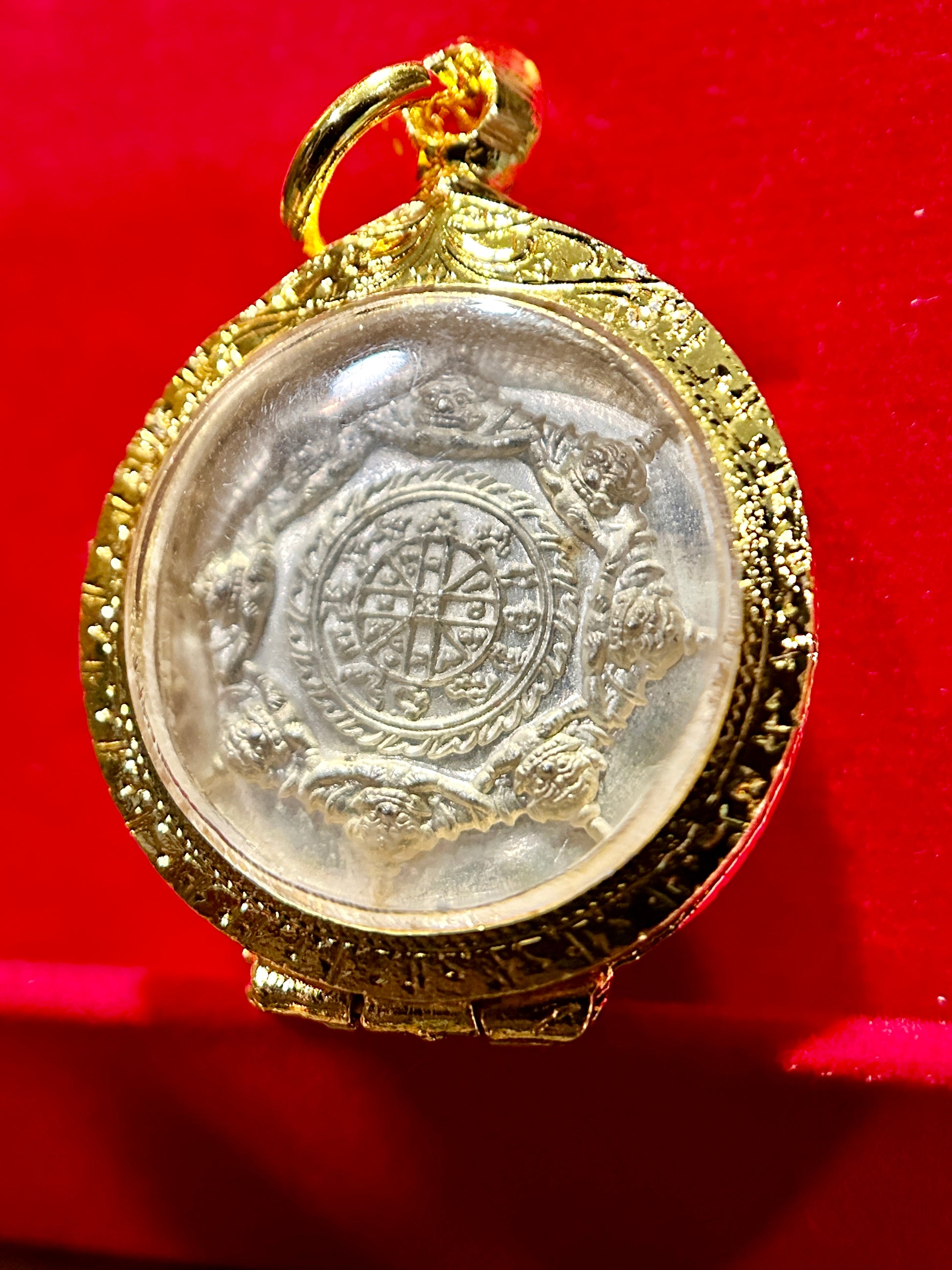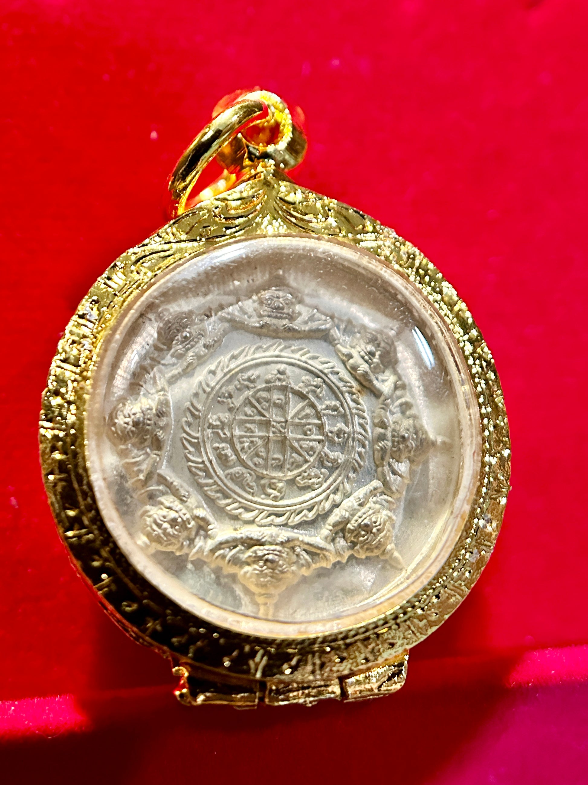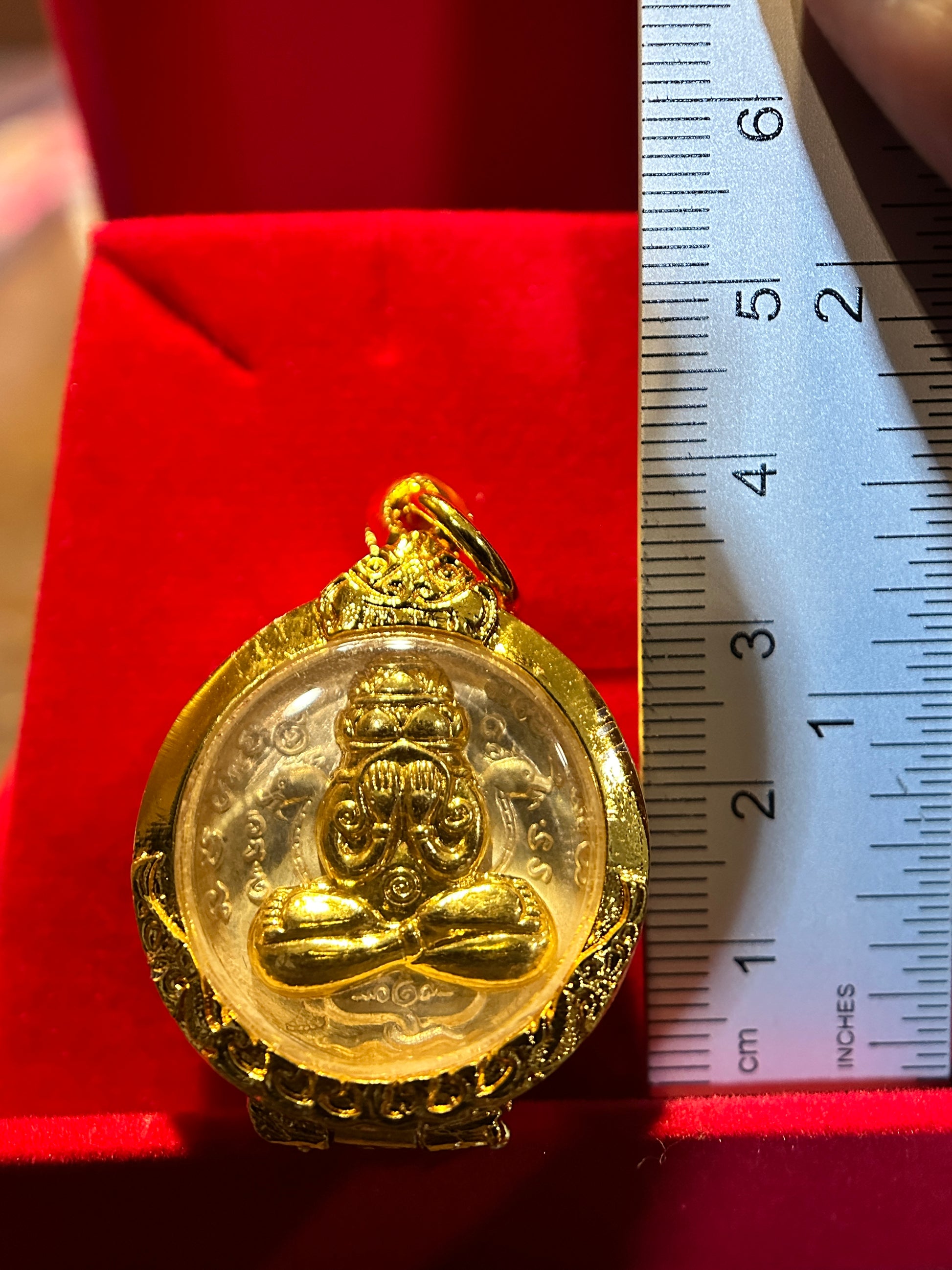 This finely crafted amulet features Phra Pidta on the front, the revered “Closed Eyes” Buddha known for warding off misfortune, concealing the wearer from danger, and attracting wealth. Cast in radiant gold-tone against a circular sacred backdrop, Phra Pidta’s meditative pose channels deep spiritual focus and protective blessings.
