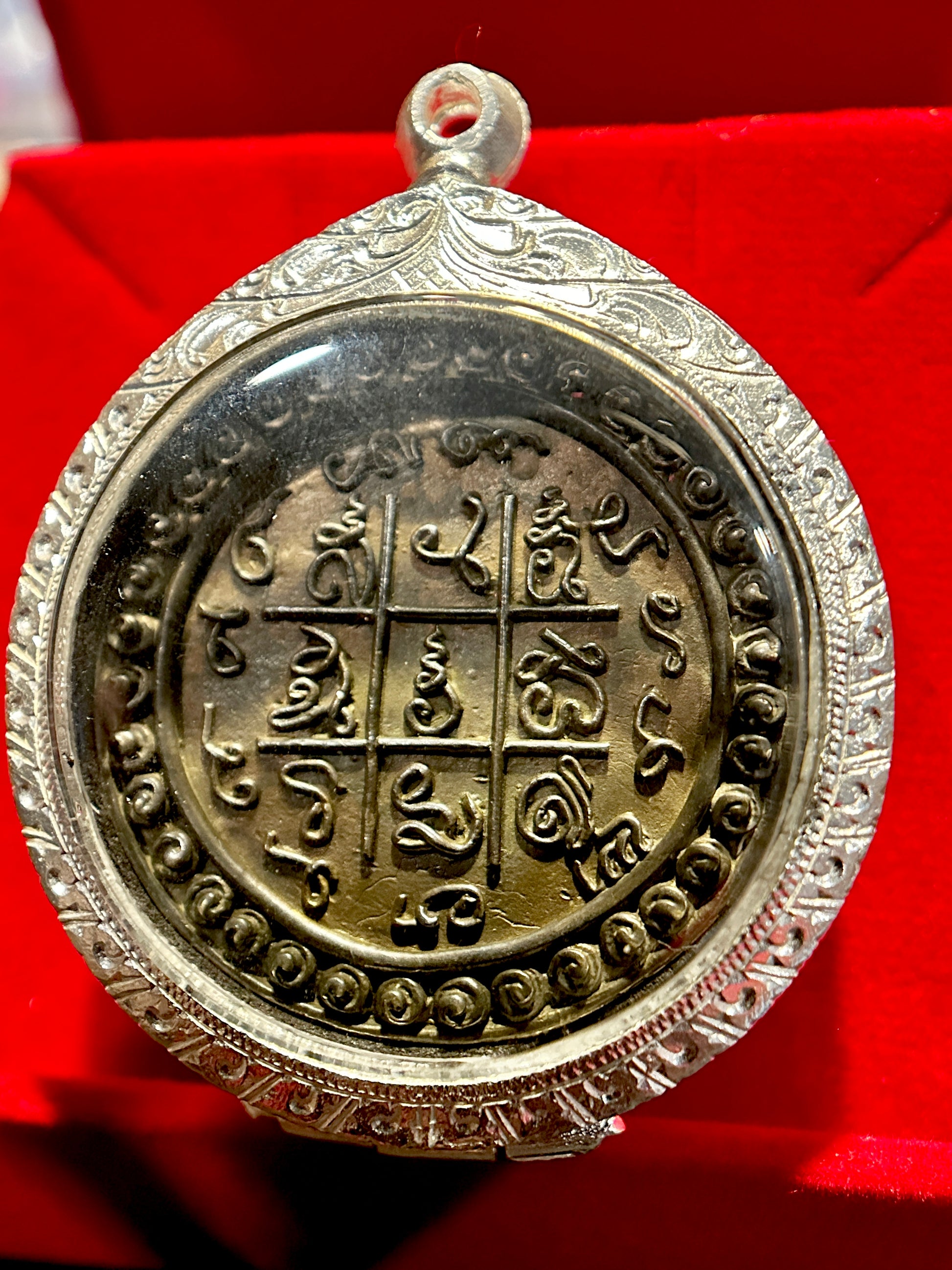 On the back is a traditional 9-square yantra surrounded by sacred Khmer/Thai script, commonly used for protection, invincibility, fortune, and removing obstacles.