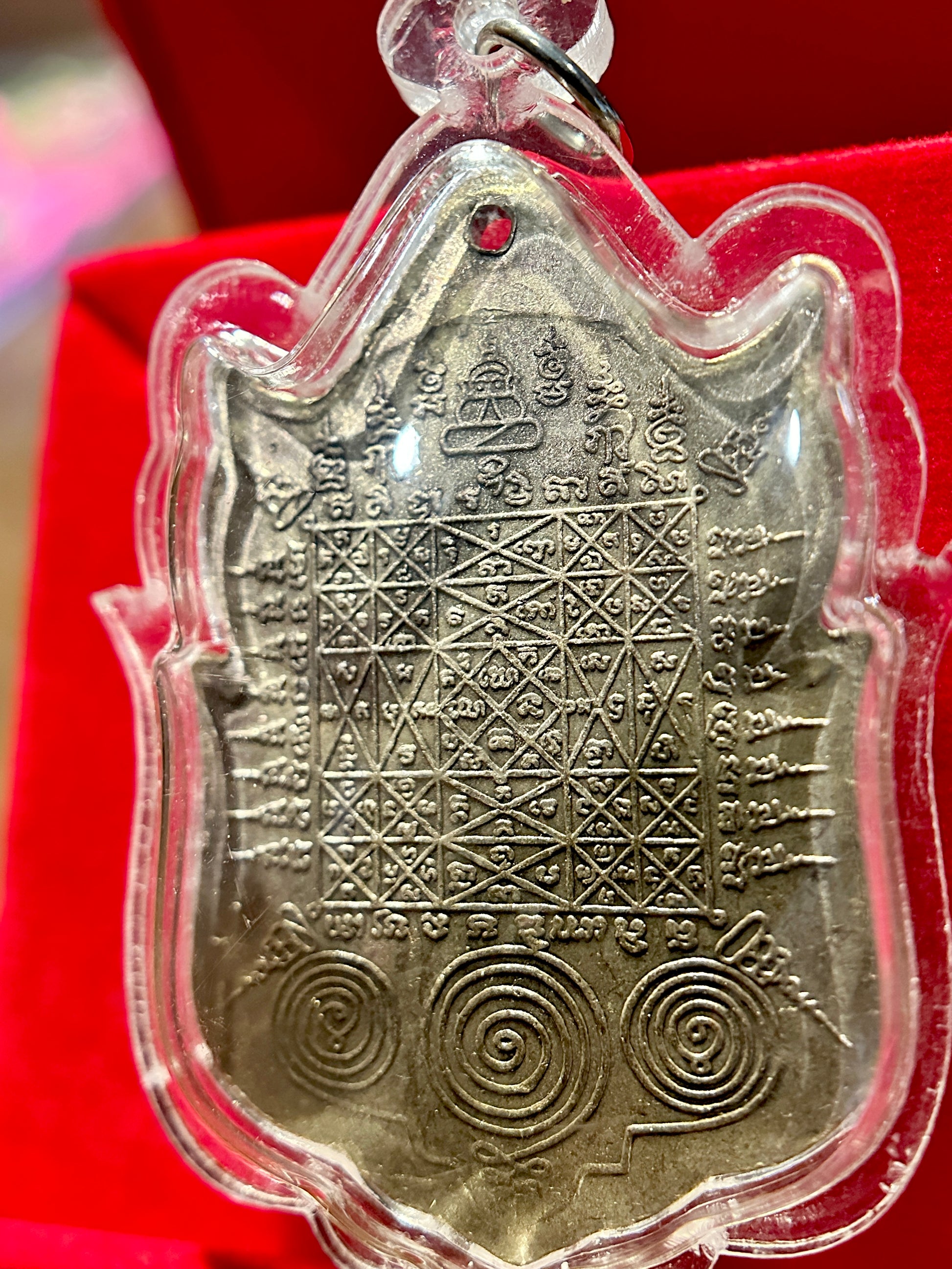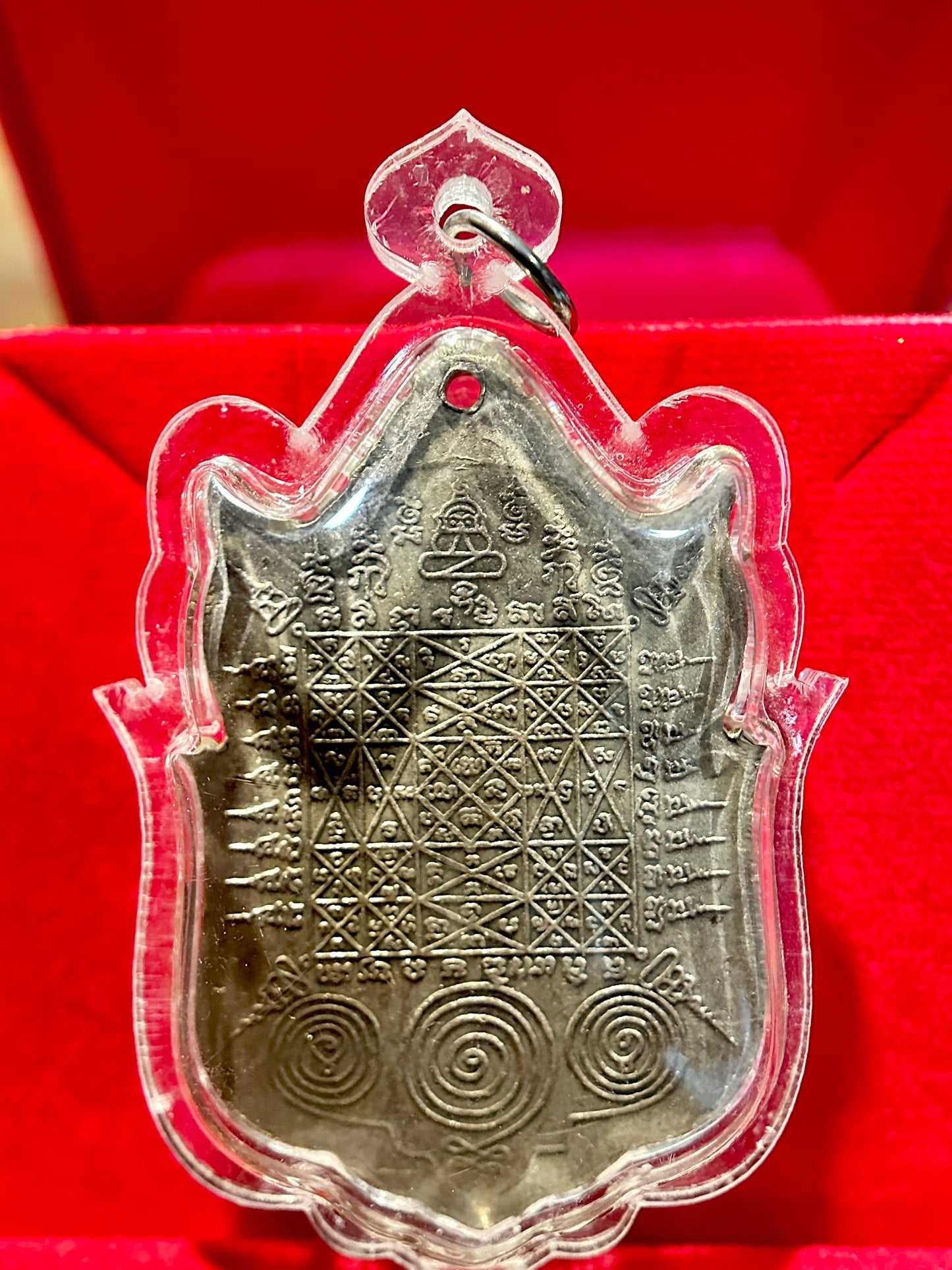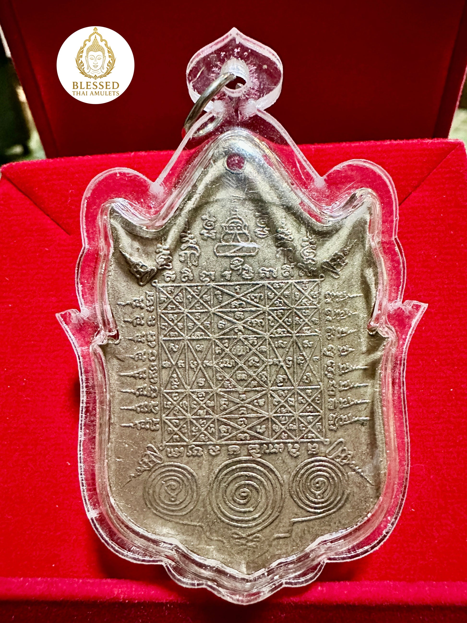 Surrounding the central image are detailed sak yant inscriptions, each enhancing the spiritual potency of the piece. The reverse side is engraved with an intricate yantra grid containing ancient numerological and sacred scripts, topped with protective symbols and spirals that promote harmony, defense against harm, and clarity in one’s path.