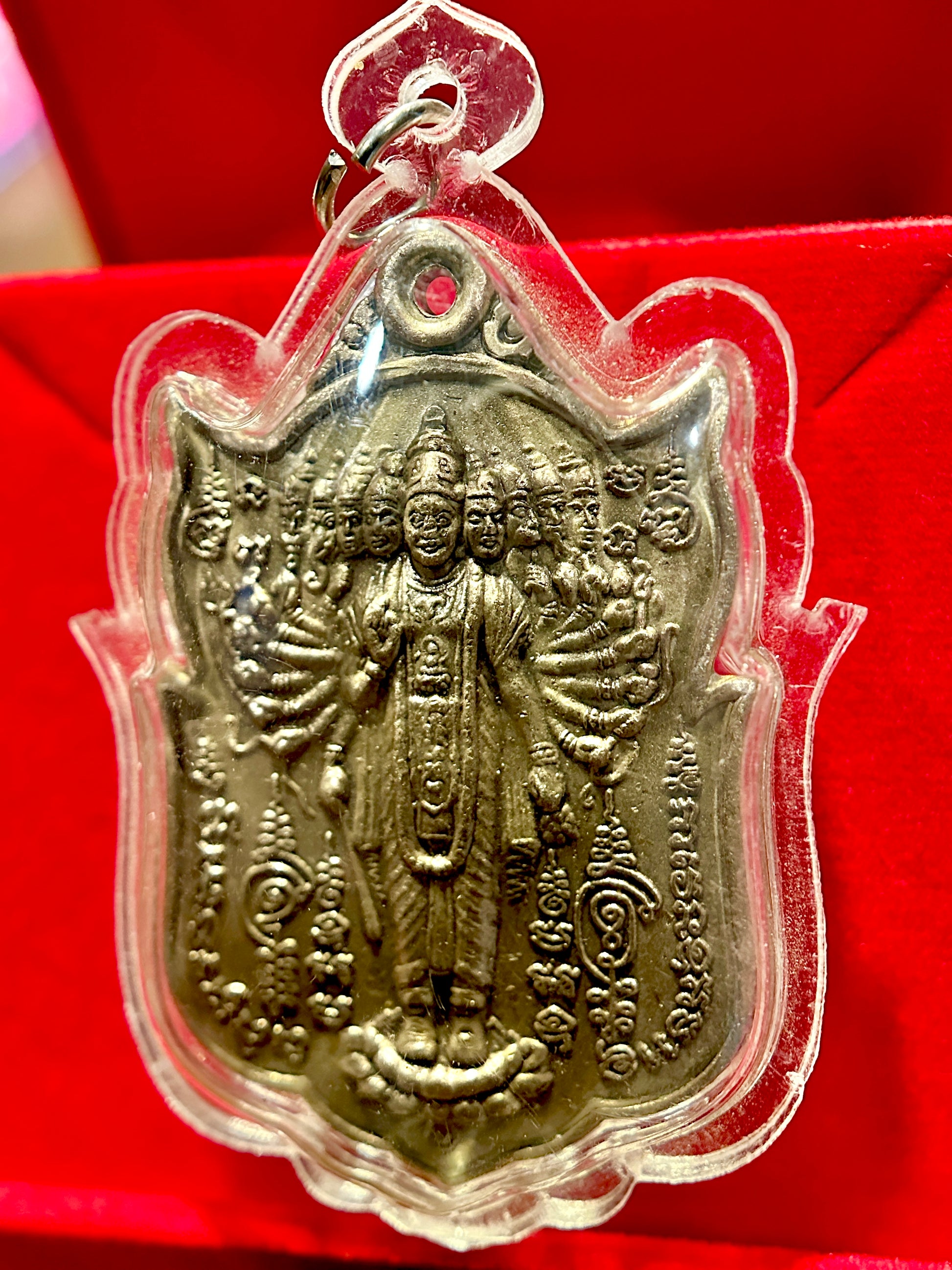 This sacred amulet features Phra Vishvarupa, the many-armed form of Vishnu, known in Thai and Hindu traditions as a powerful cosmic protector and manifestation of divine omnipresence. Depicted with multiple heads and arms, each bearing a unique weapon or symbol, Vishvarupa represents mastery over all realms—earthly, spiritual, and celestial.