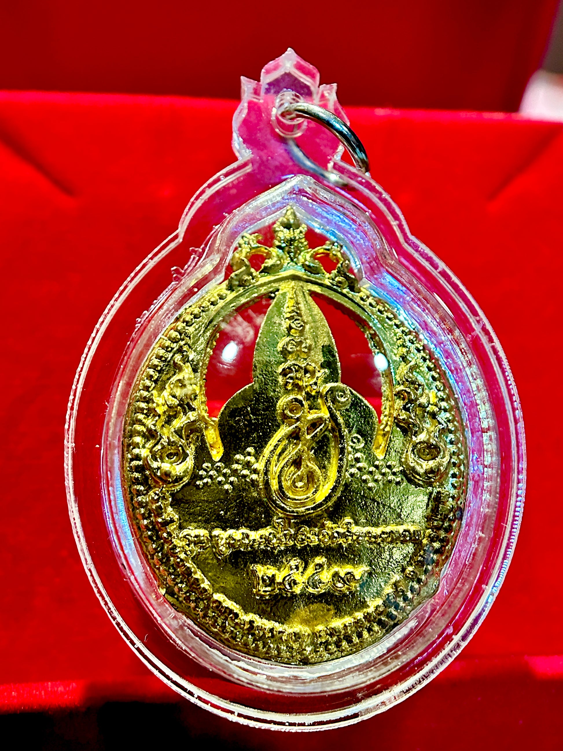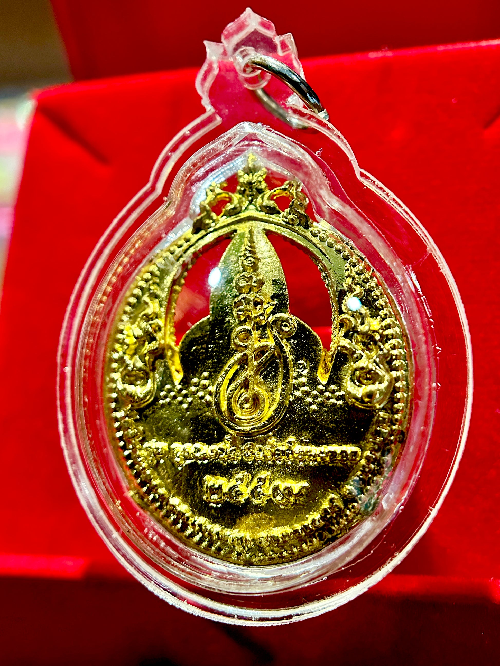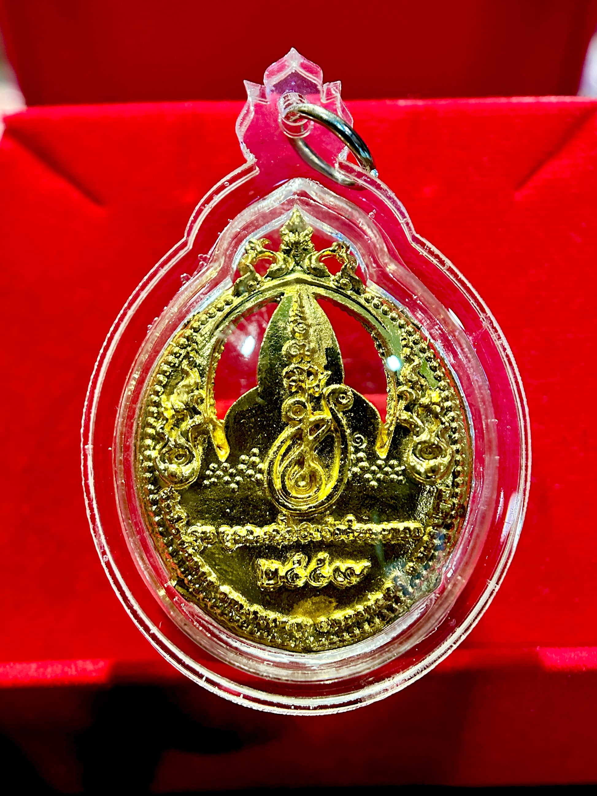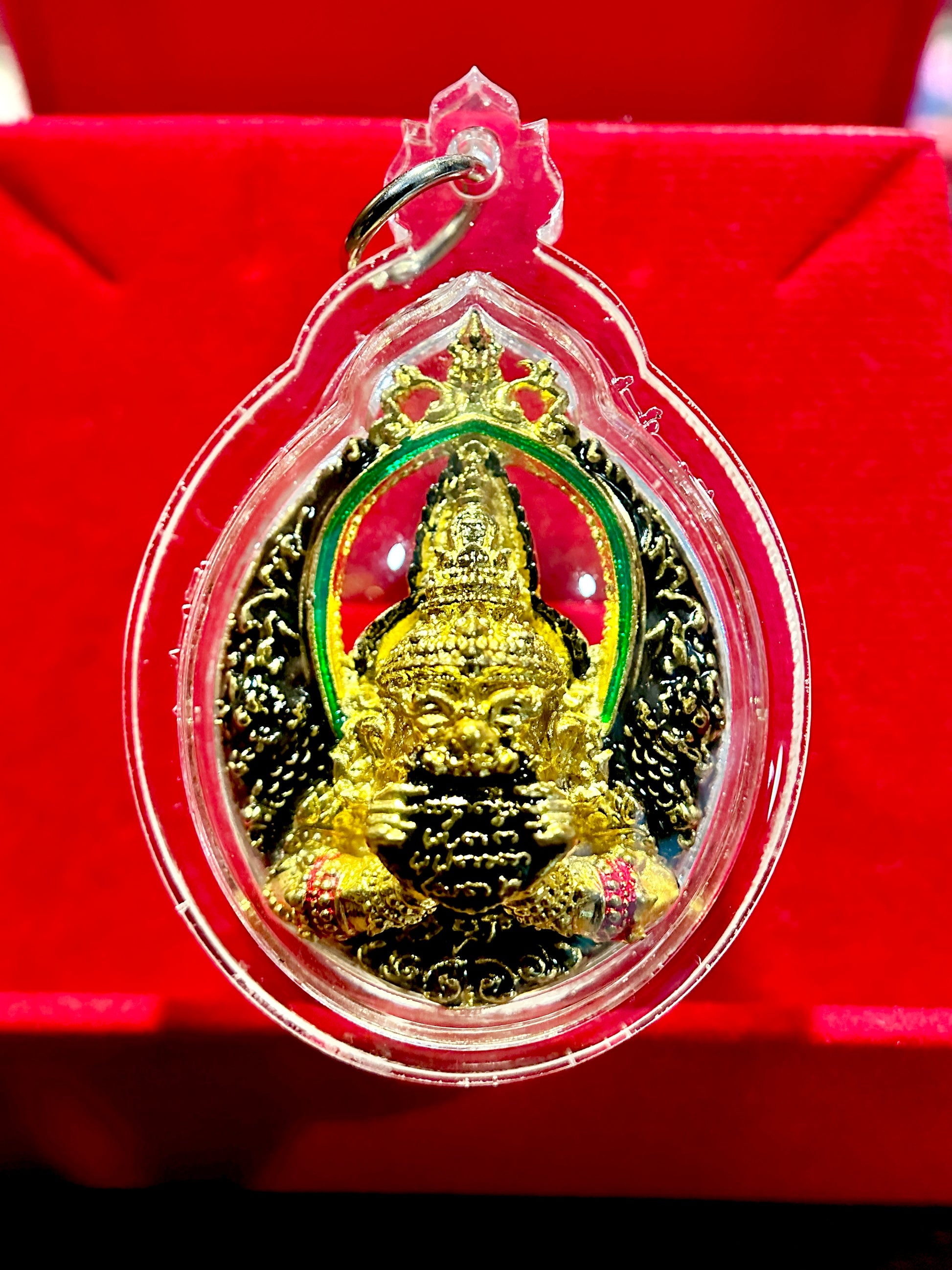 This striking Thai amulet features the powerful deity Rahu, the celestial god of eclipses and shadow energy, depicted in high relief gold enamel with vivid black contrast. He is shown in his iconic pose devouring the moon—an ancient symbol of absorbing negativity and transforming misfortune into strength.