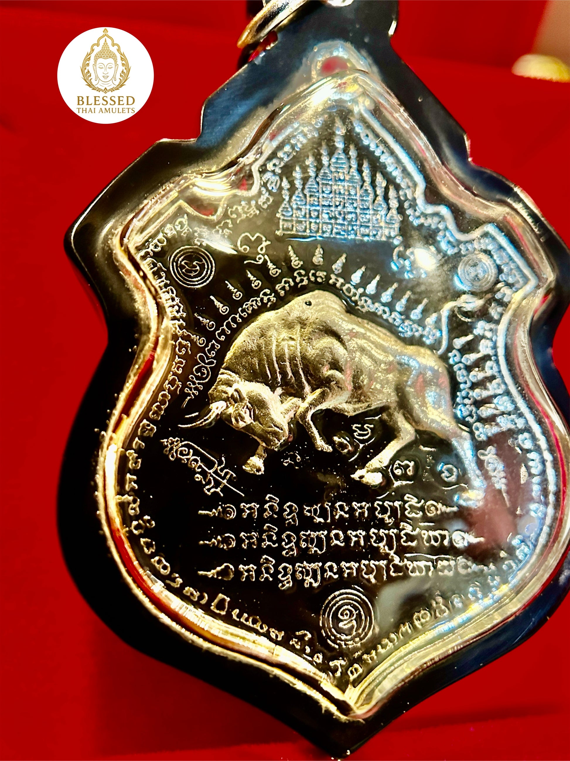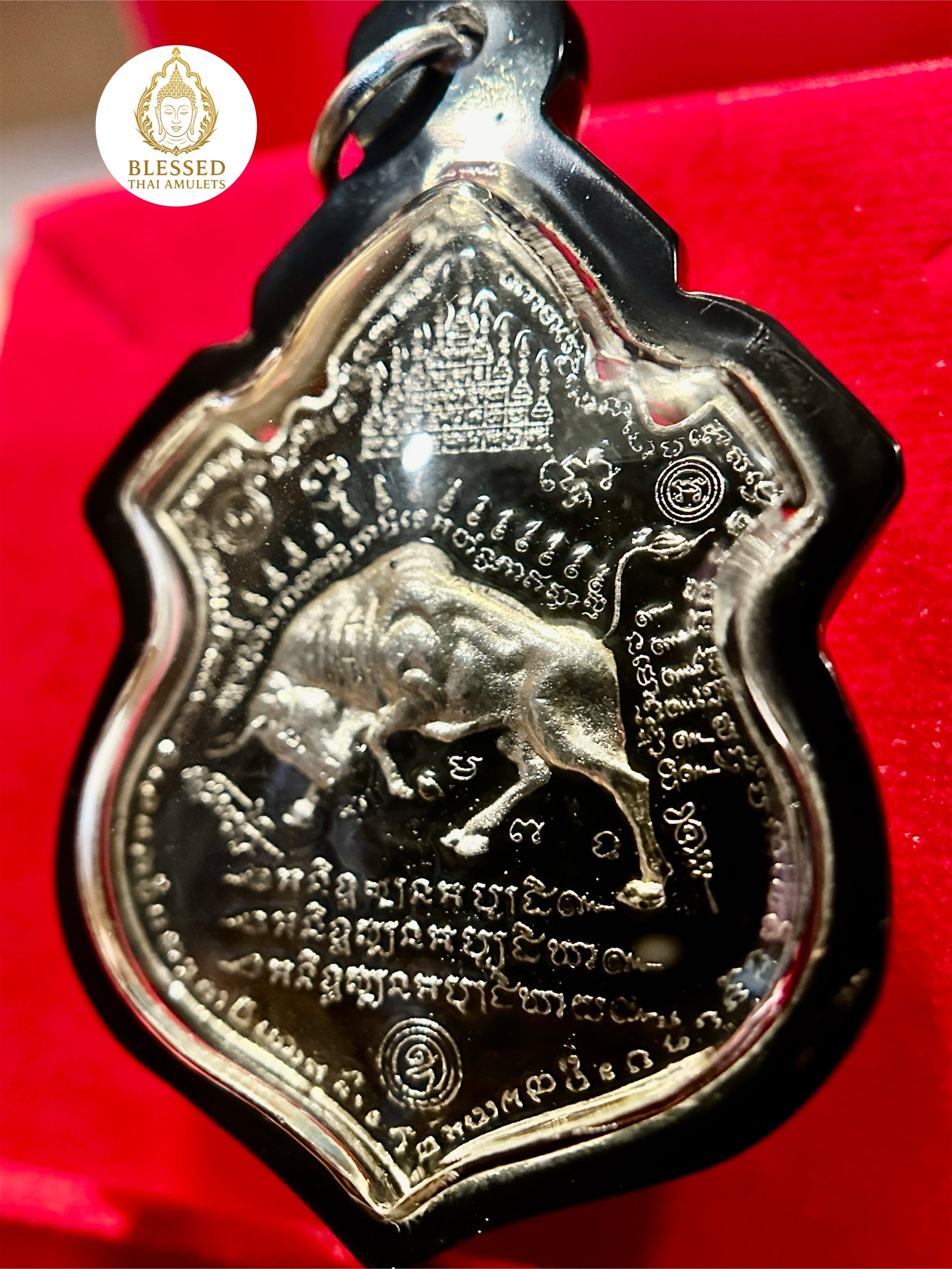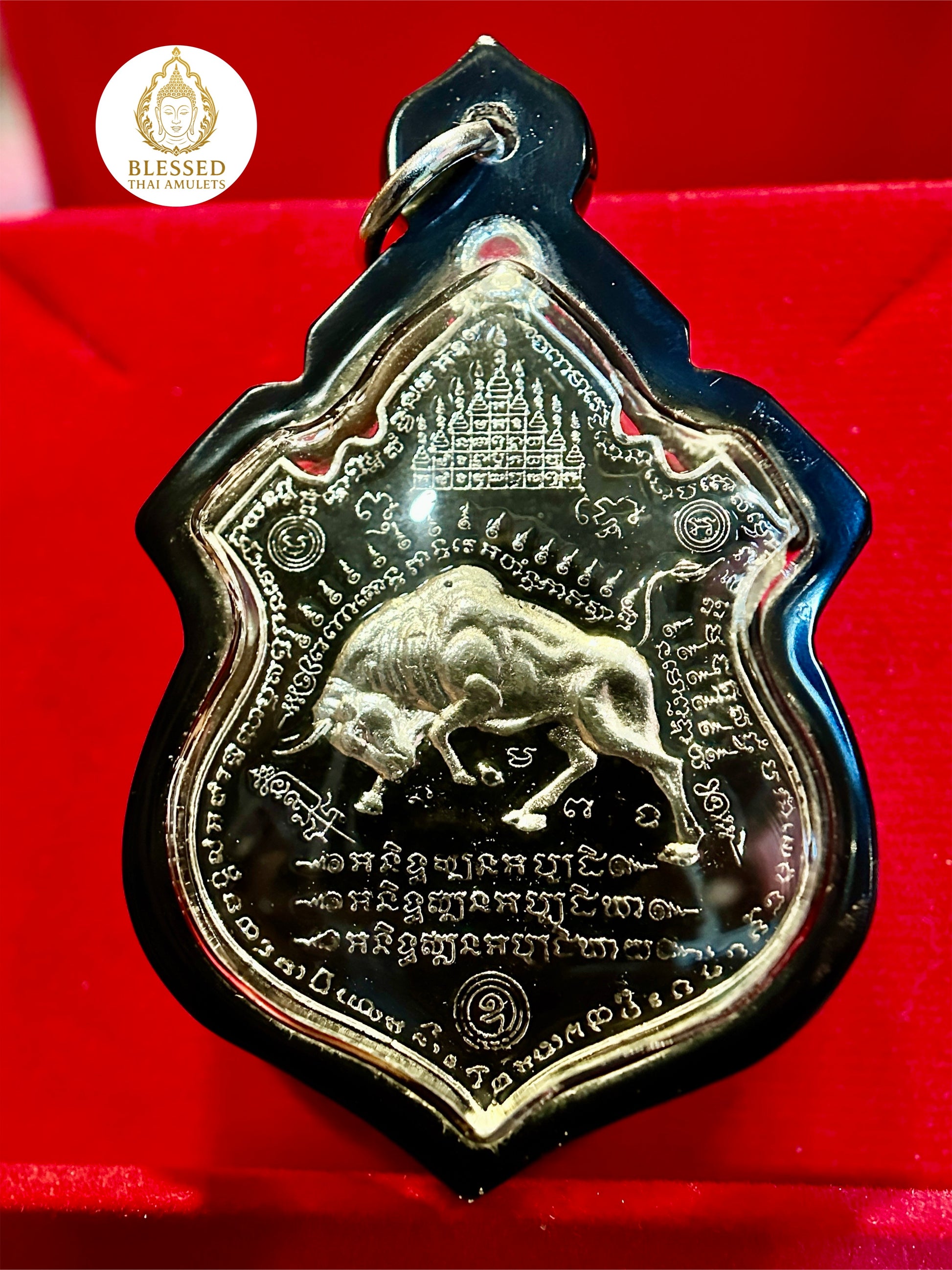 This sleek and striking Thai amulet features a silver bull mid-charge, powerfully set against a rich black background. The contrast of silver on black evokes a sense of precision, resilience, and quiet authority. The bull stands as a symbol of focused ambition, strength in adversity, and enduring success.
