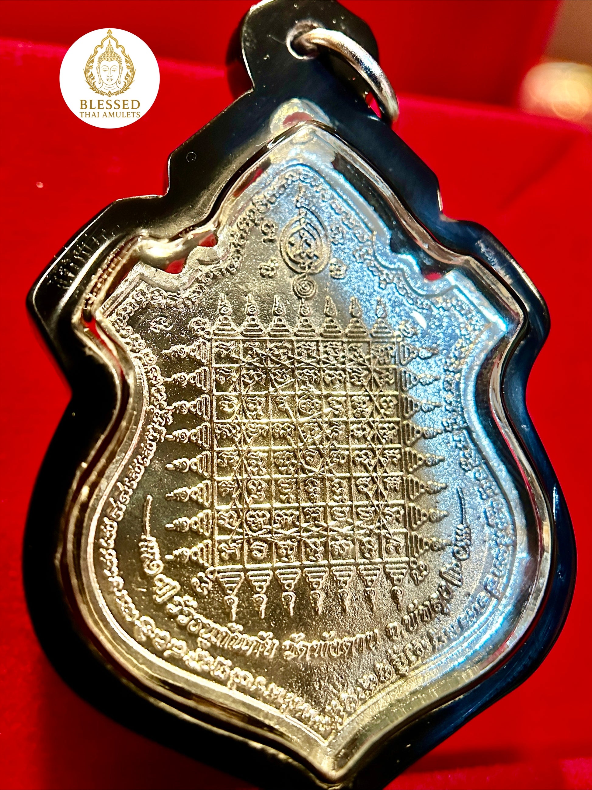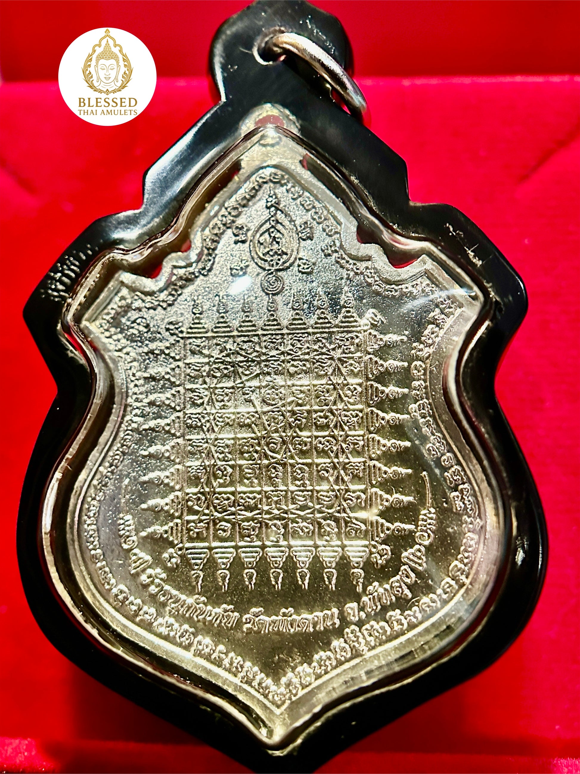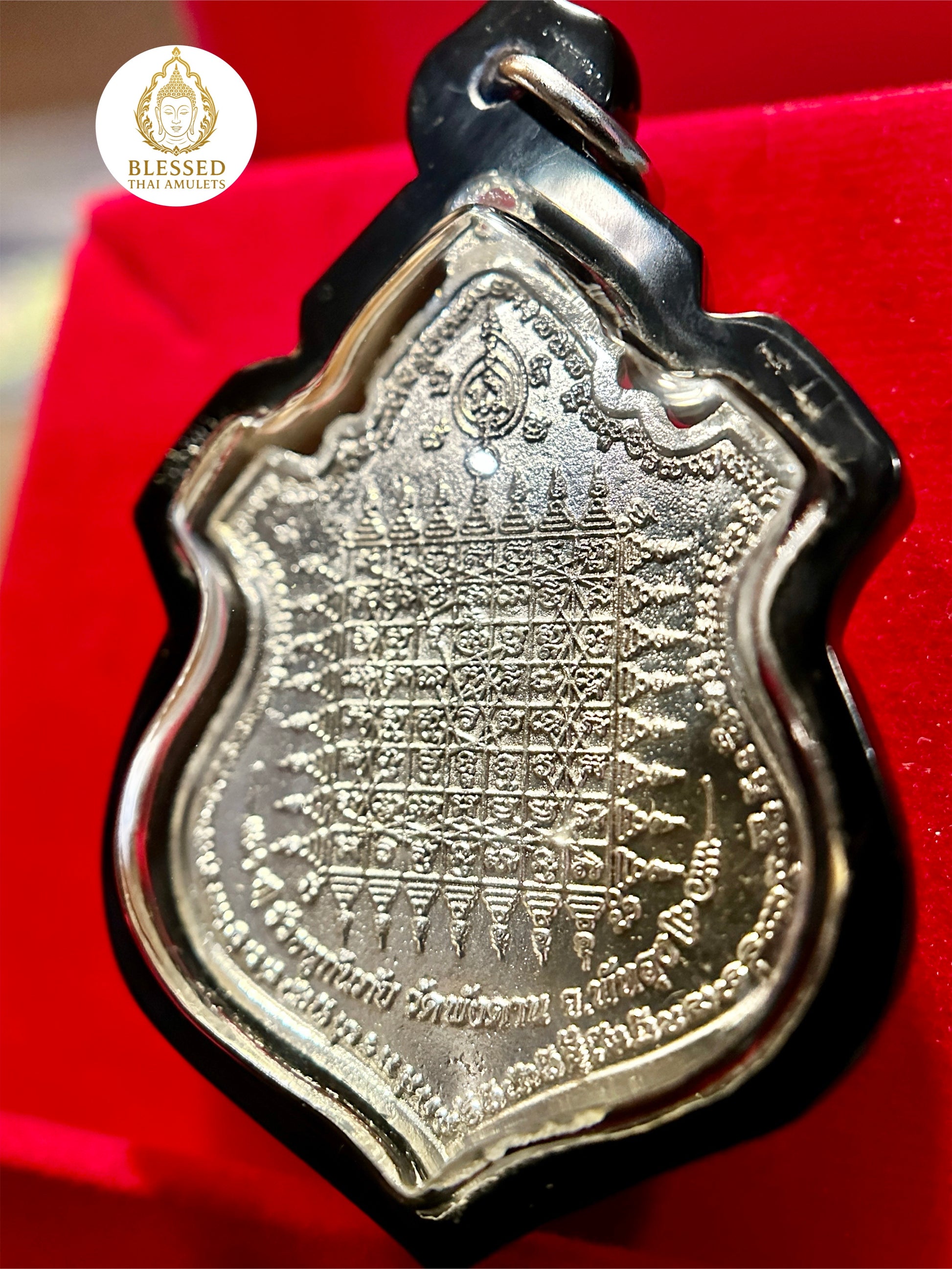 This sleek and striking Thai amulet features a silver bull mid-charge, powerfully set against a rich black background. The contrast of silver on black evokes a sense of precision, resilience, and quiet authority. The bull stands as a symbol of focused ambition, strength in adversity, and enduring success.