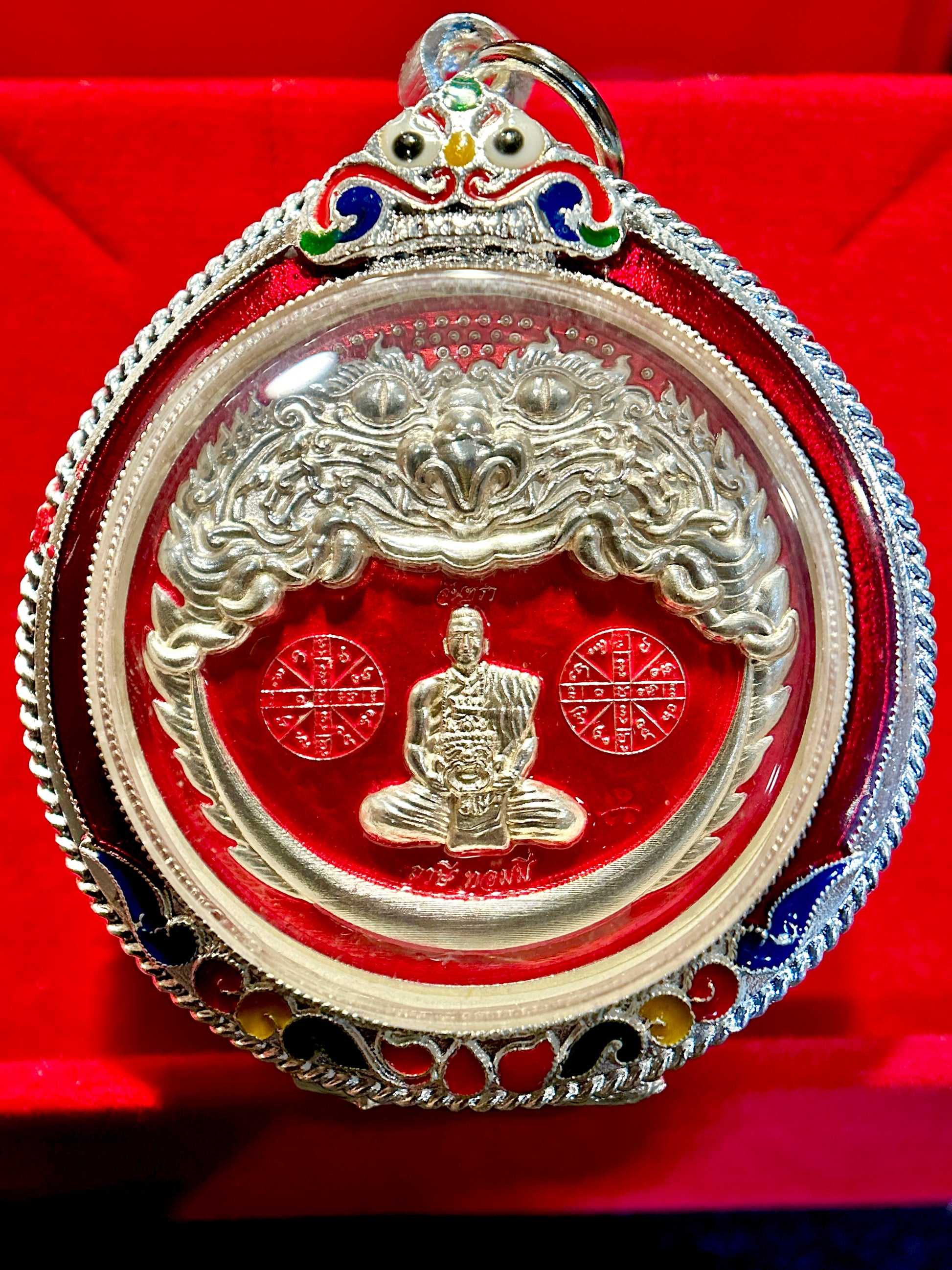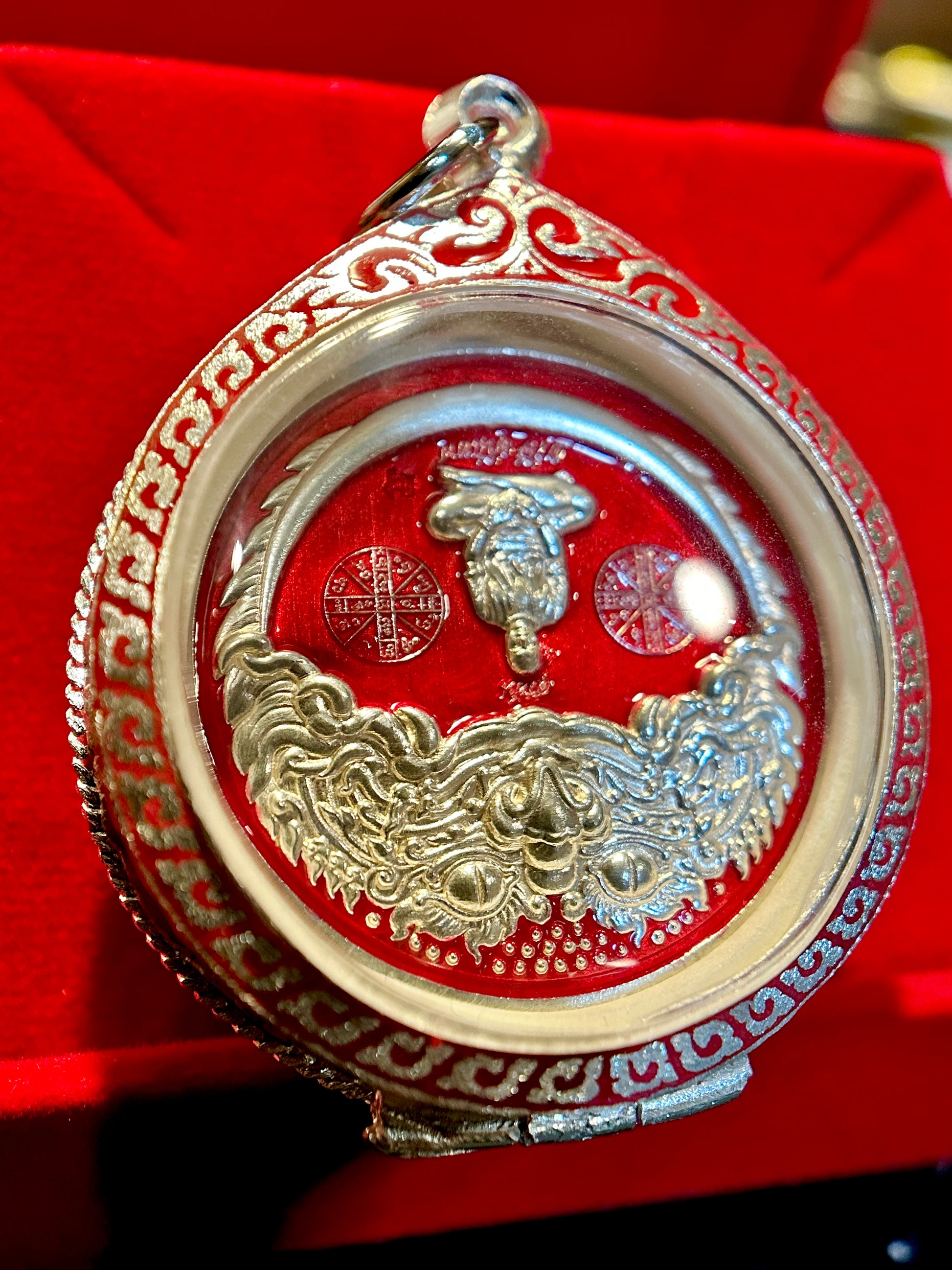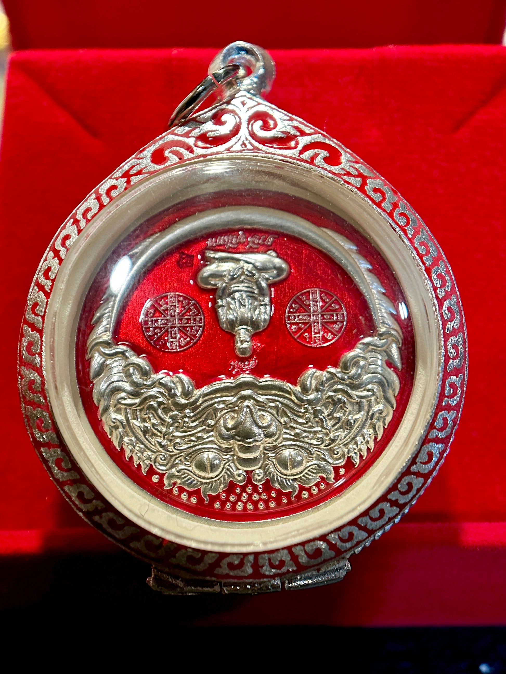 Encased in a silver frame with vibrant red enamel backdrop, this amulet radiates both purity and power. It’s ideal for those seeking to dispel negativity, invite wealth, and strengthen spiritual focus through Rahu’s transformative force and the monk’s tranquil wisdom.