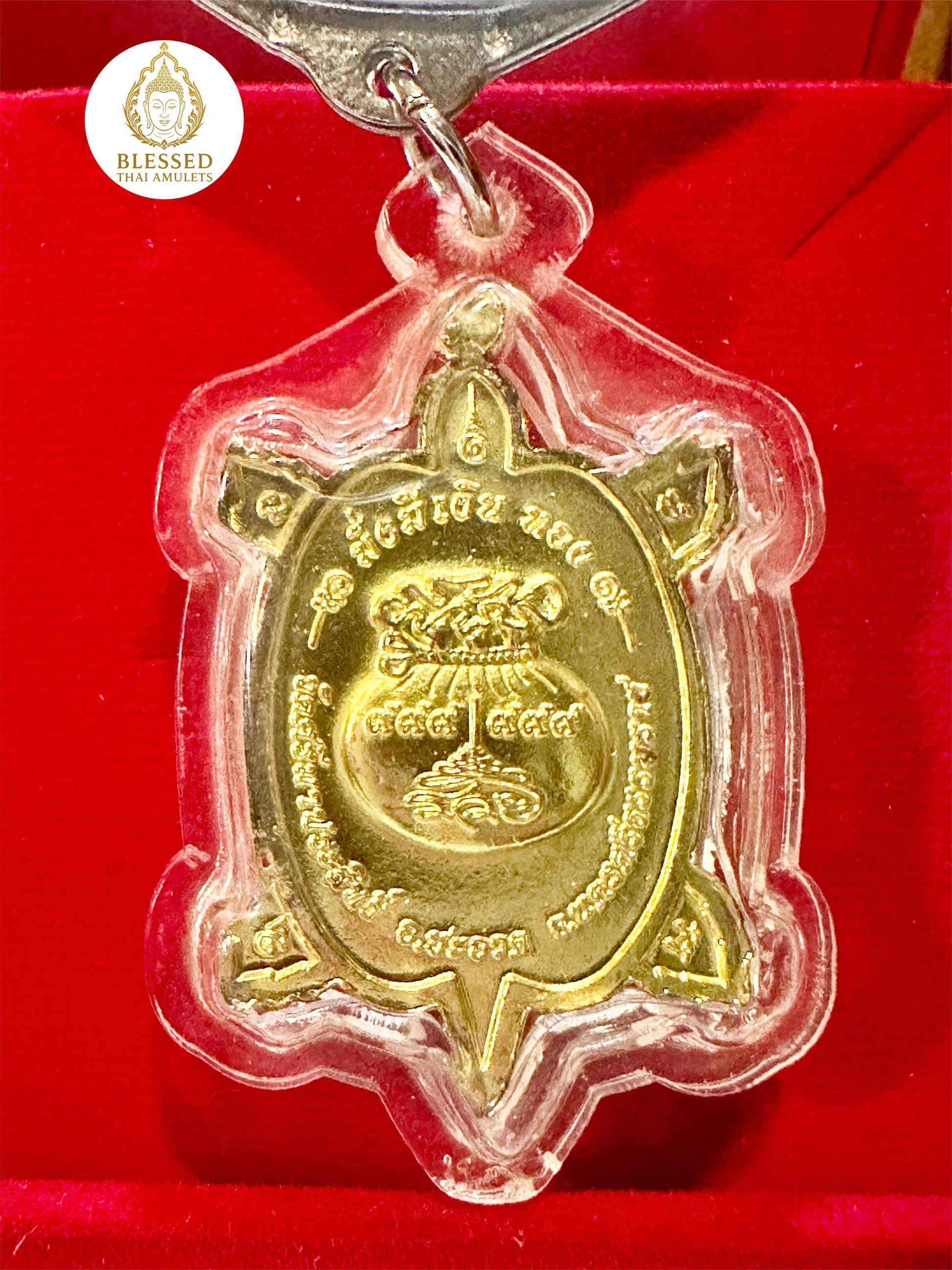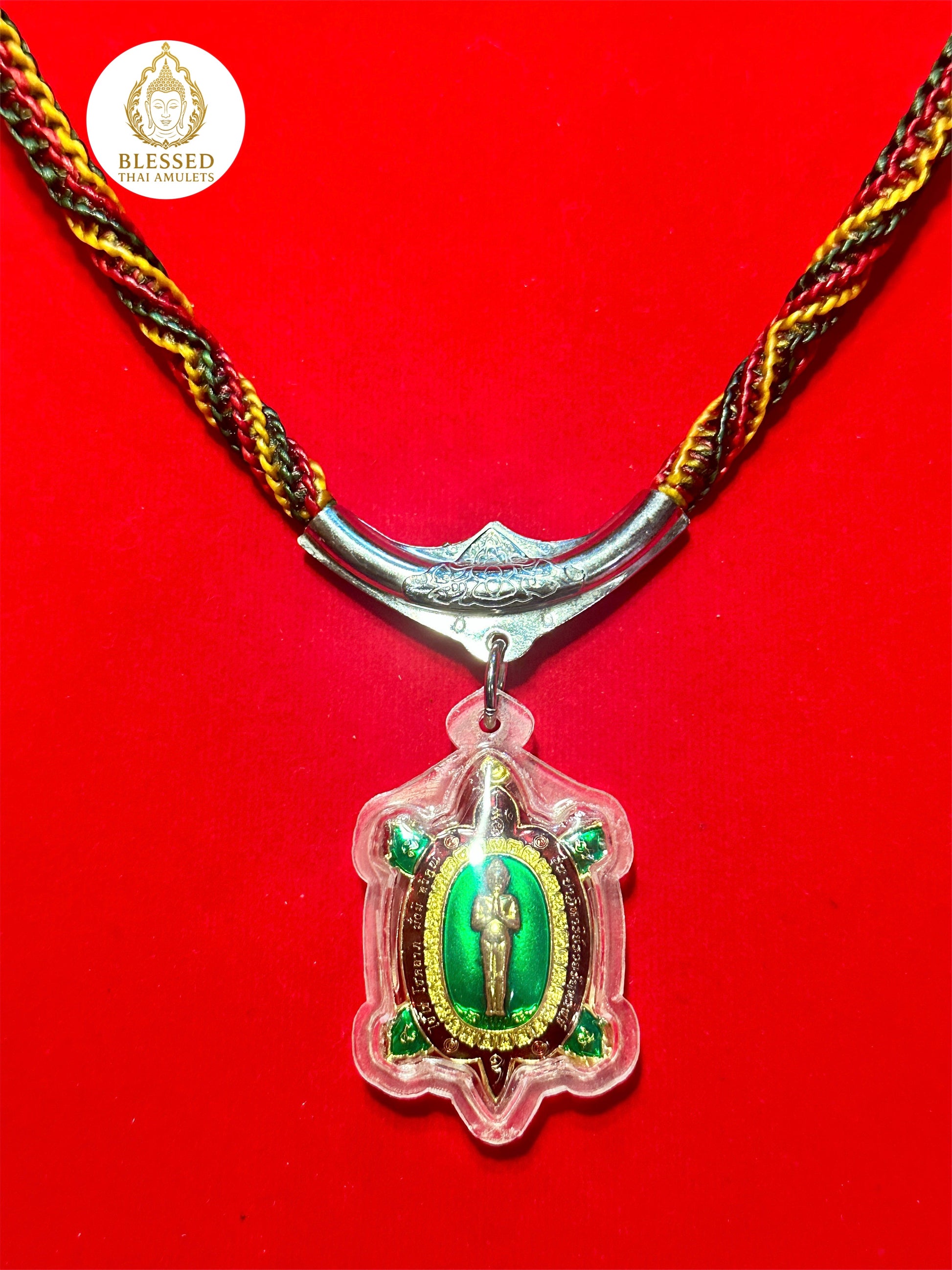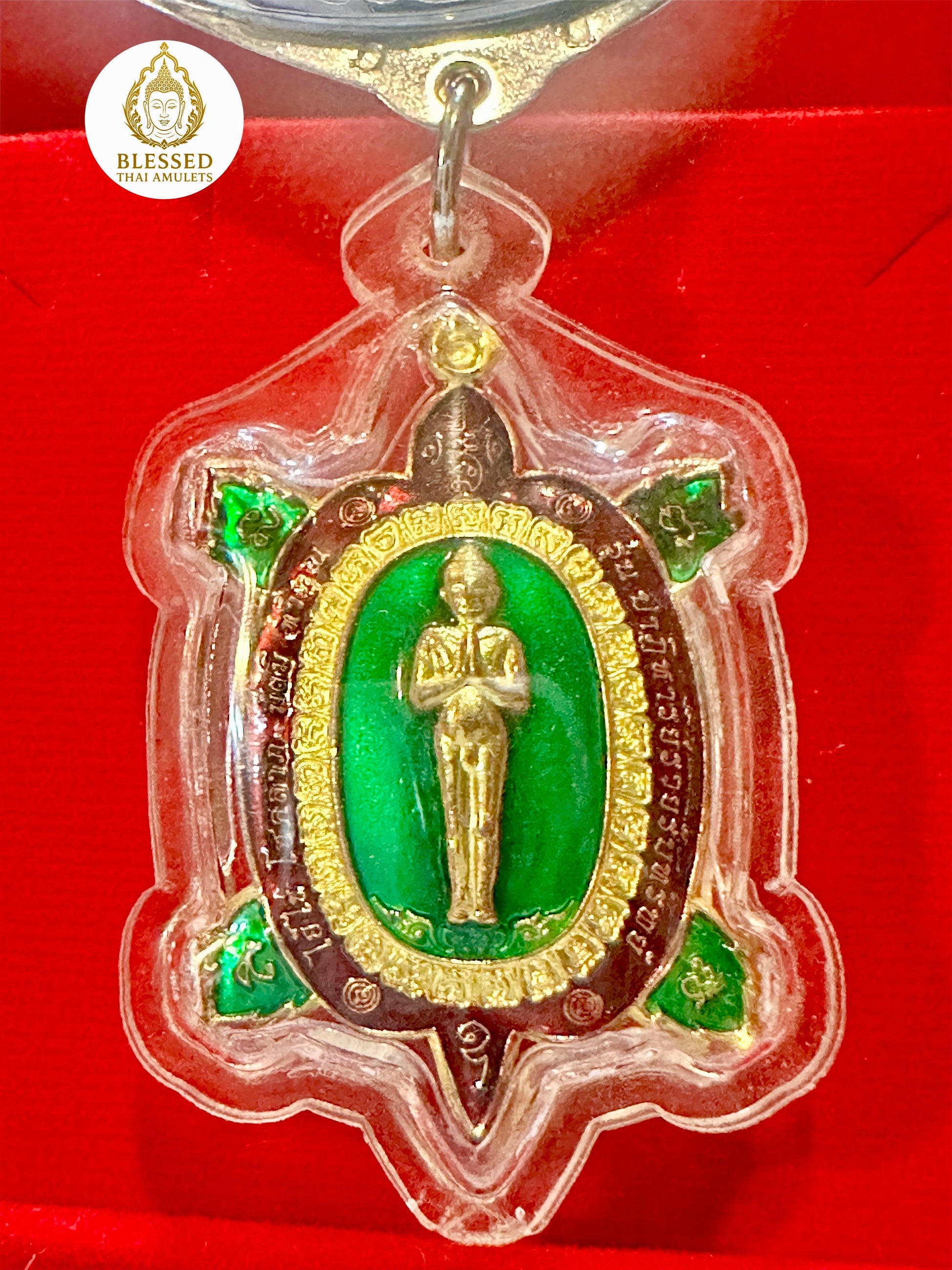 This vibrant turtle-shaped Thai amulet features a standing Buddha in Abhaya Mudra—the gesture of protection and reassurance. Set against a luminous green enamel background, the Buddha radiates serenity and spiritual strength. Golden inscriptions surround the central figure, bordered by four sacred green corner symbols representing harmony and balance.