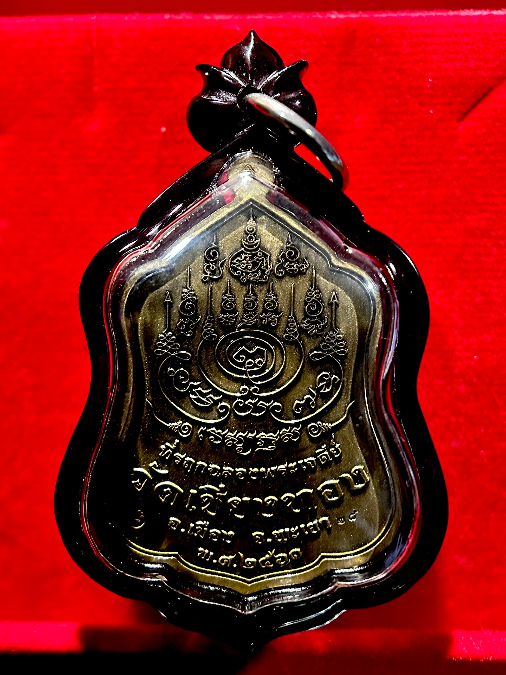 The back showcases an elaborate sak yant yantra, etched with protective mantras and temple inscriptions from Wat Chiang Khong, where the amulet was blessed. Enclosed in a custom black protective case, this piece carries a deeply rooted spiritual energy while honoring traditional Thai craftsmanship.