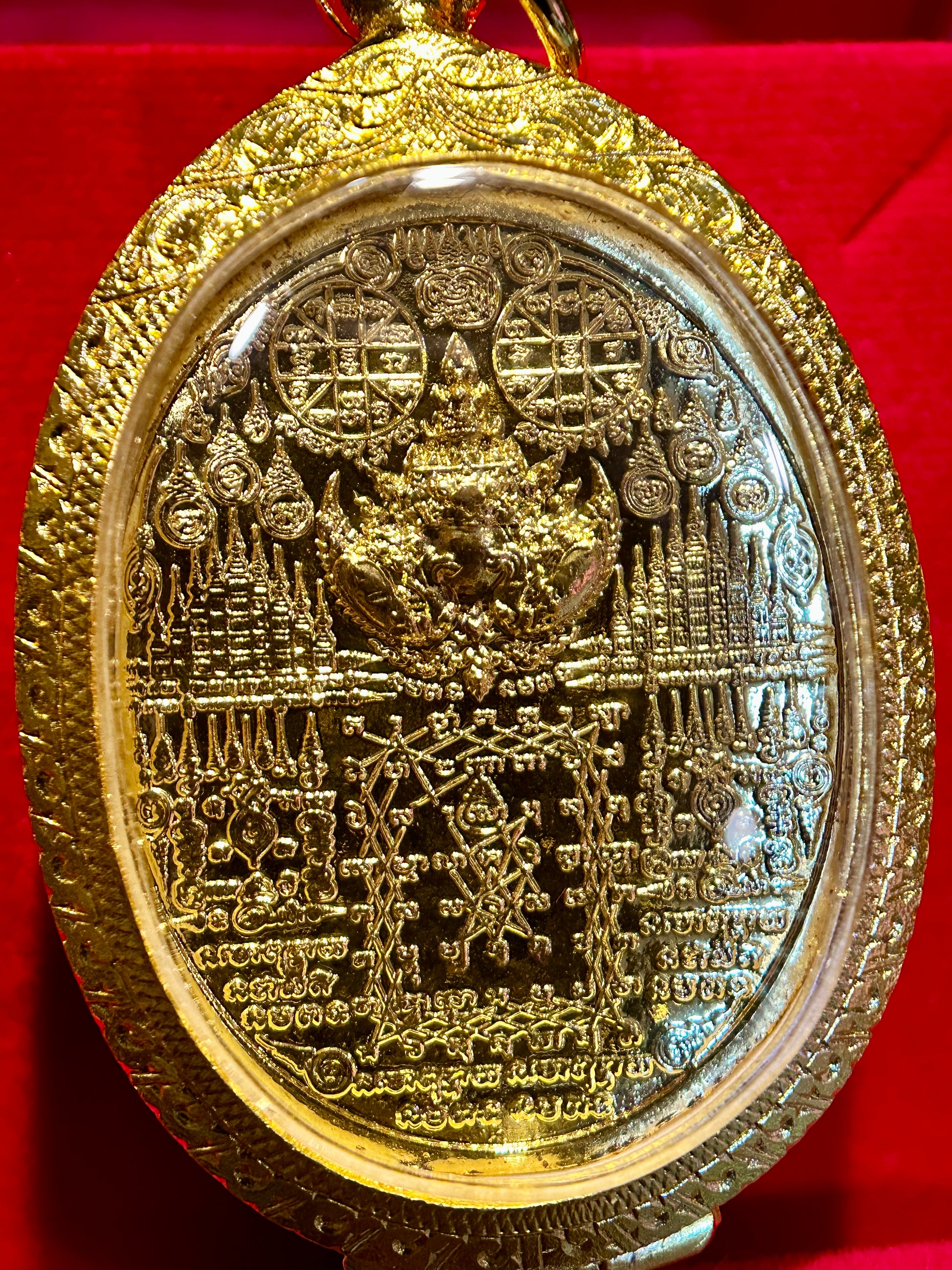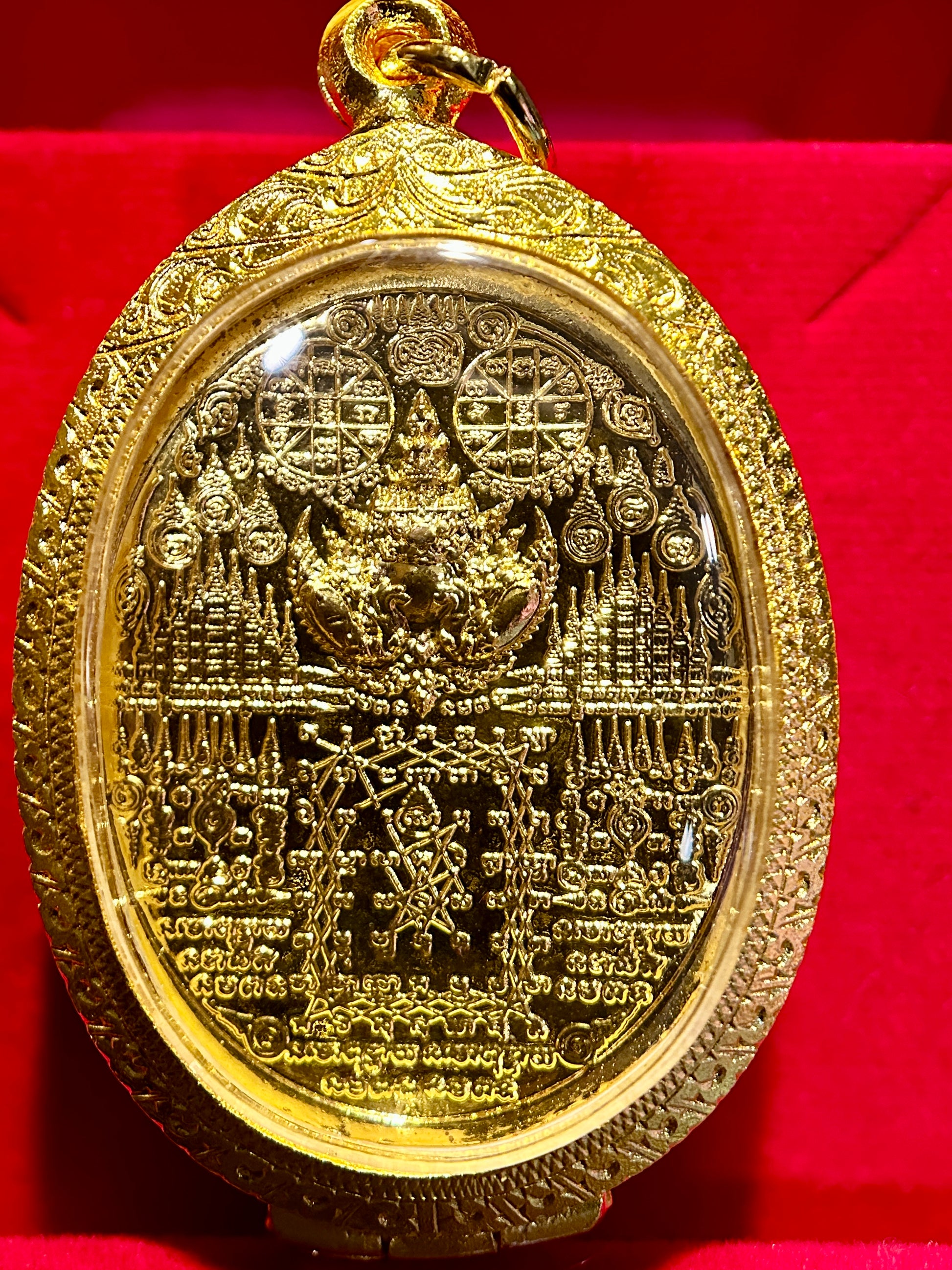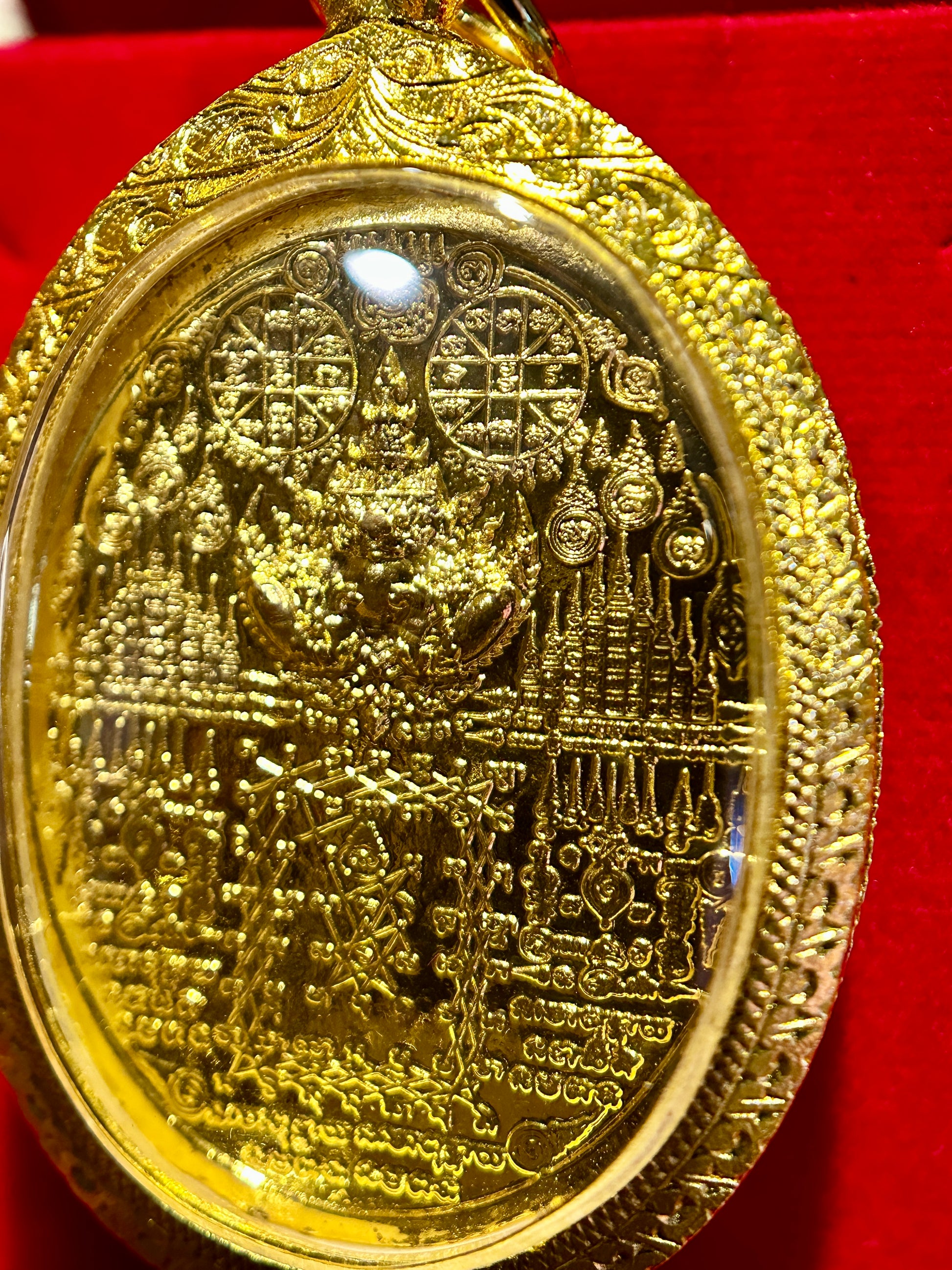 The back of the amulet unveils an intricate temple scene guarded by Tao Wessuwan and framed by dense yantric designs, including twin Gao Yord motifs, ancient Khmer script, and mythological elements. This side is designed to invoke high-level spiritual shielding, amplify blessings, and create a barrier against all forms of negativity and danger.