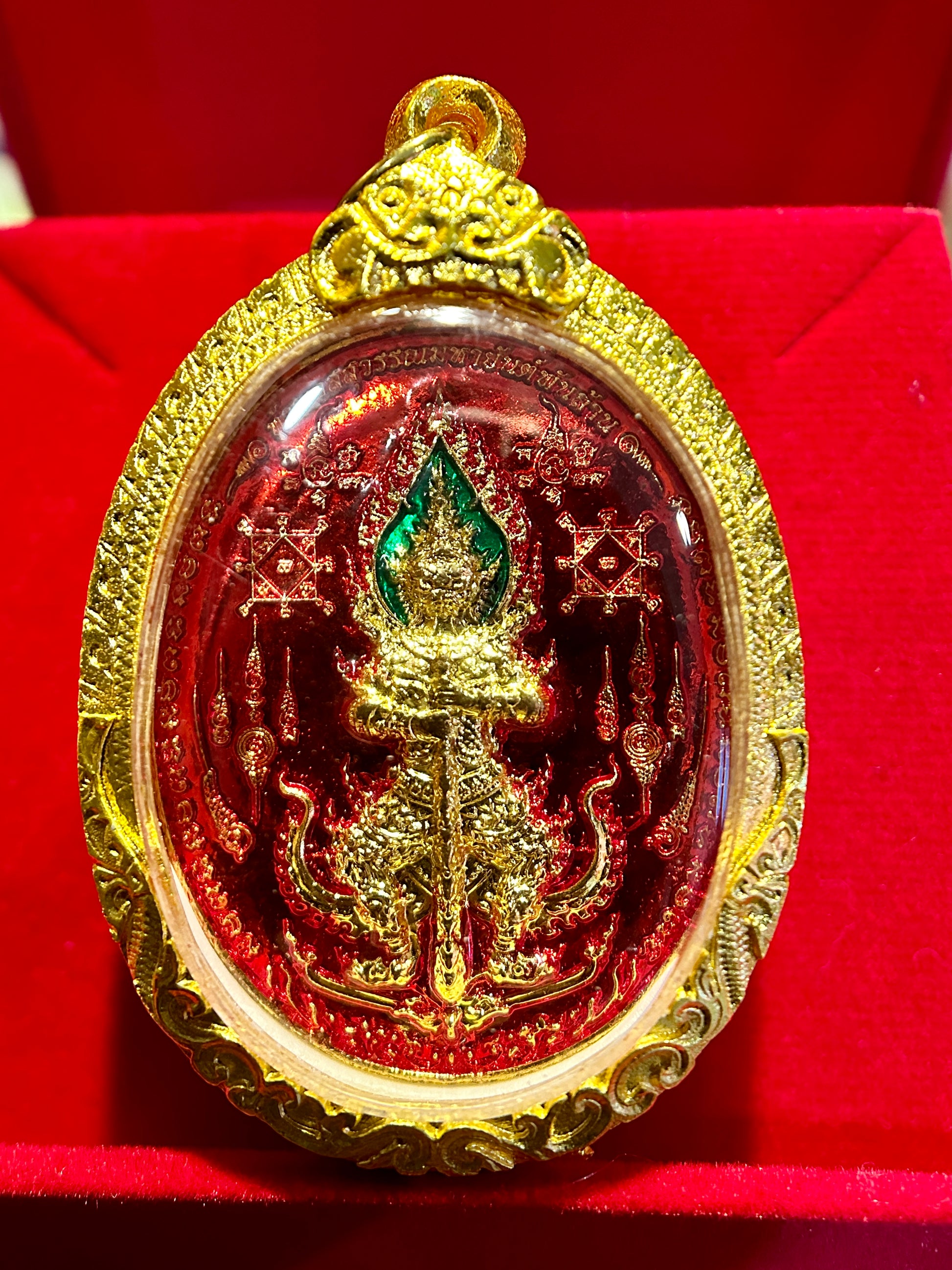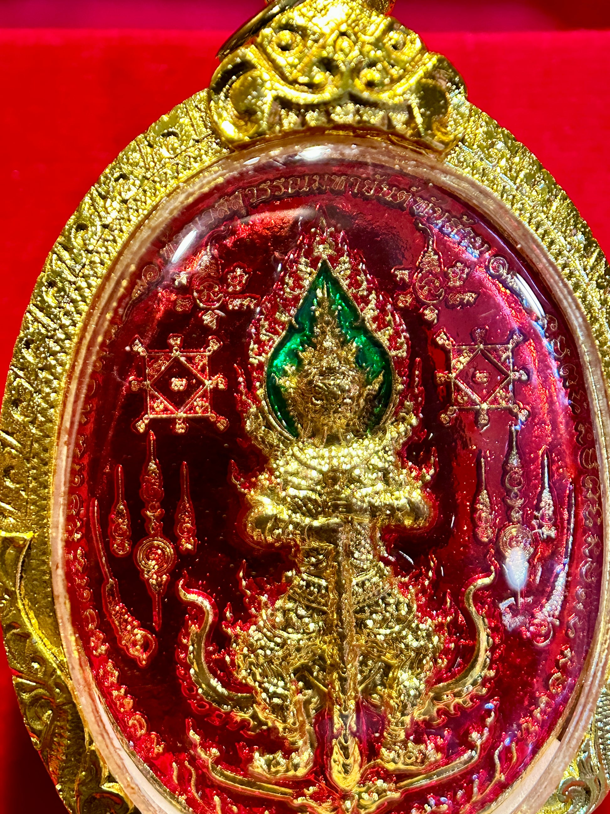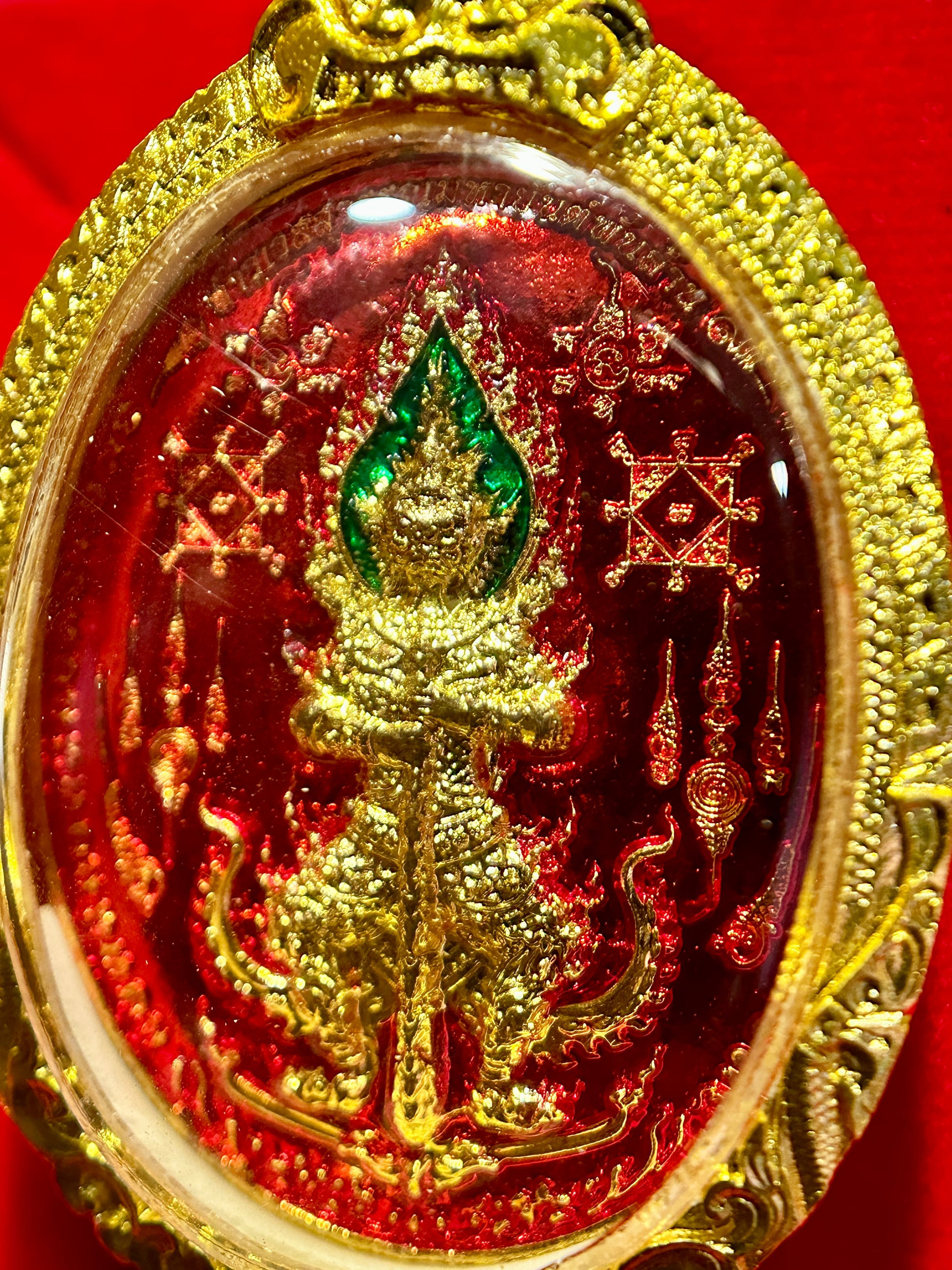 This stunning double-sided amulet features Tao Wessuwan, the revered guardian deity and fierce vanquisher of evil, standing boldly against a vibrant crimson red enamel background. Crowned in green and robed in gold, he is surrounded by sacred yantras, with particular emphasis on the double Gao Yord (nine-spire yantras)—symbols of supreme protection, authority, and spiritual mastery.