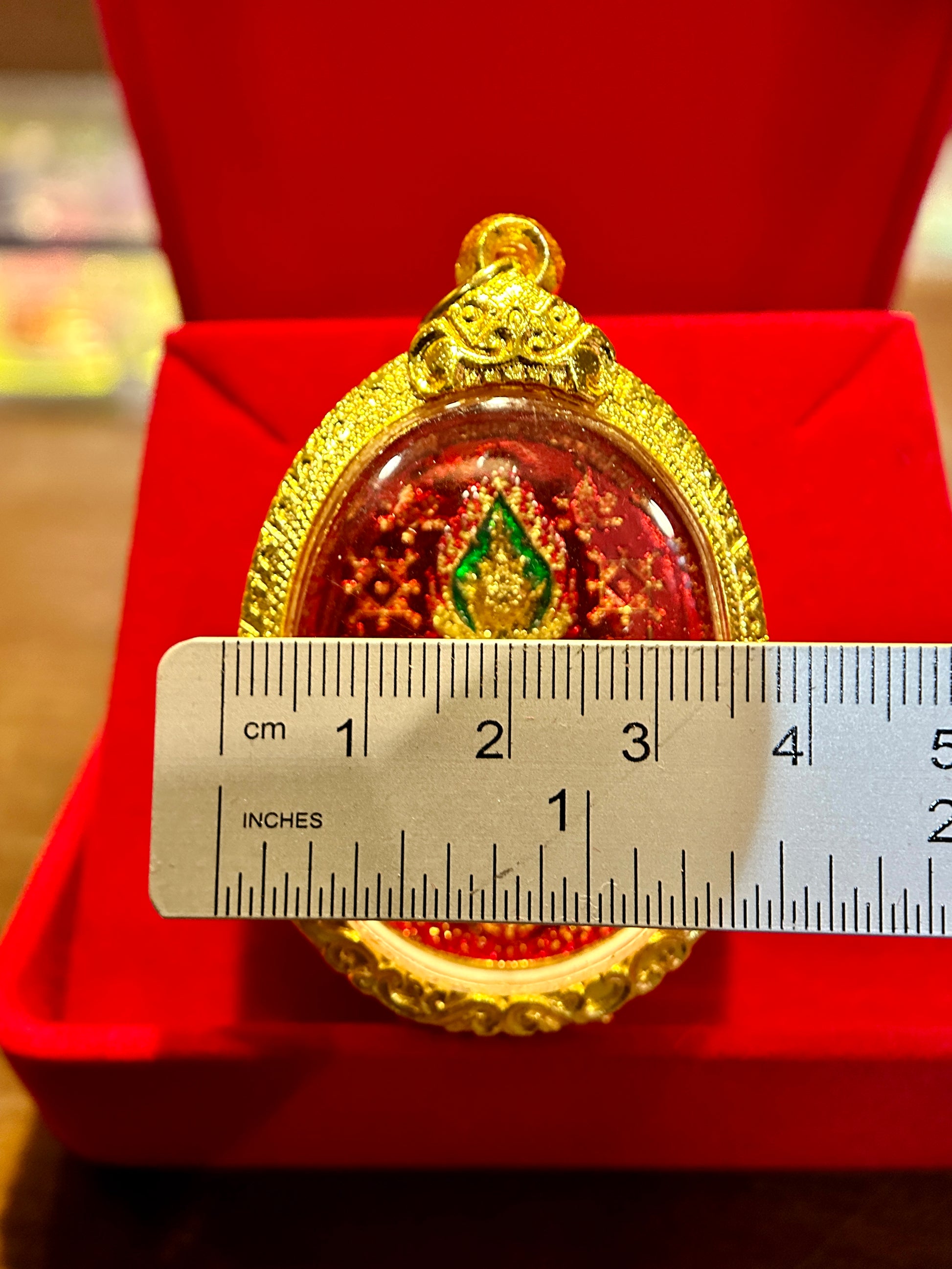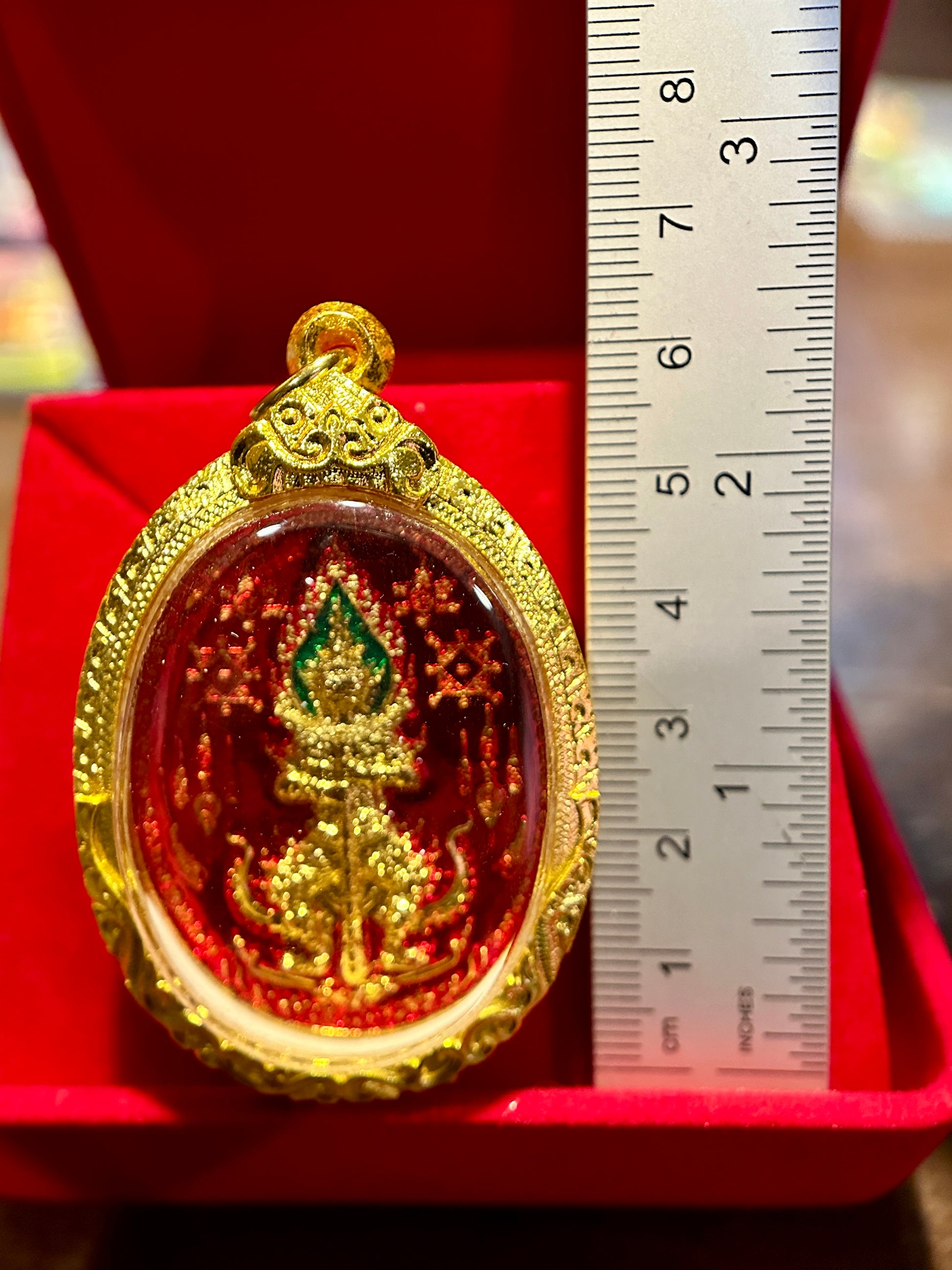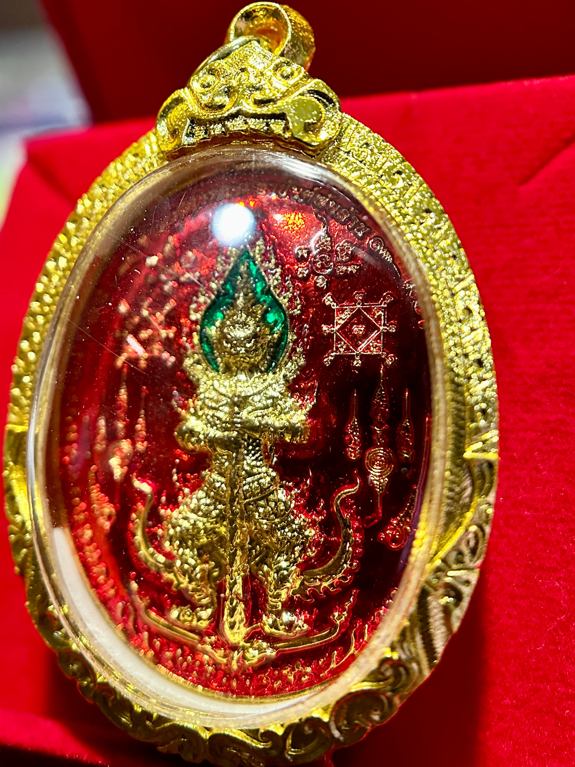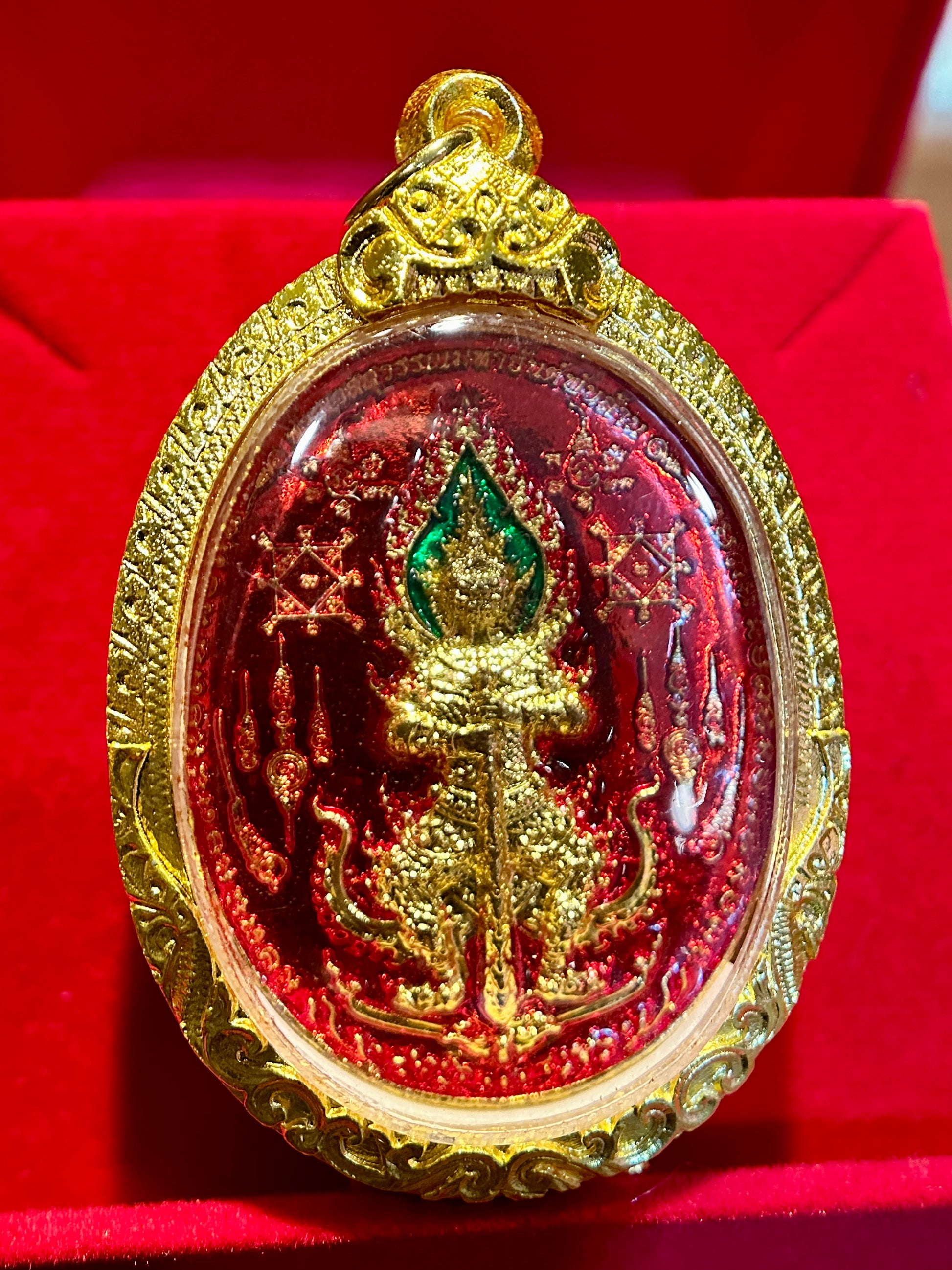 This stunning double-sided amulet features Tao Wessuwan, the revered guardian deity and fierce vanquisher of evil, standing boldly against a vibrant crimson red enamel background. Crowned in green and robed in gold, he is surrounded by sacred yantras, with particular emphasis on the double Gao Yord (nine-spire yantras)—symbols of supreme protection, authority, and spiritual mastery.