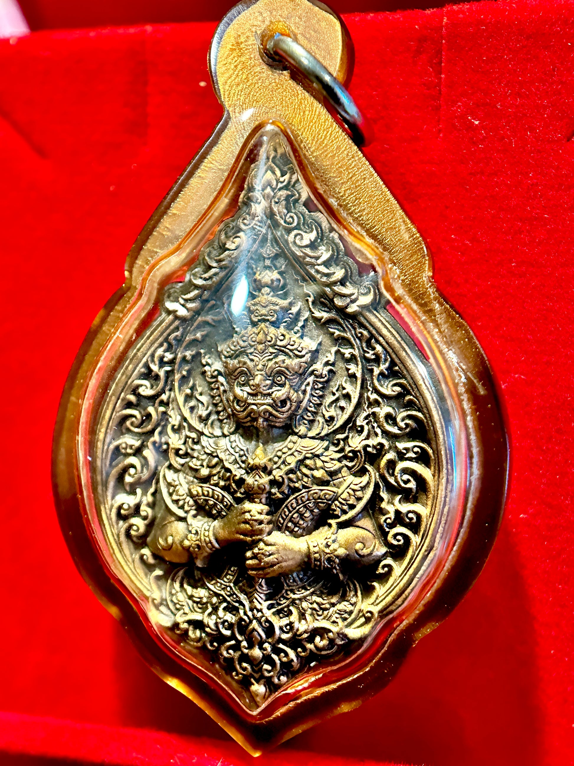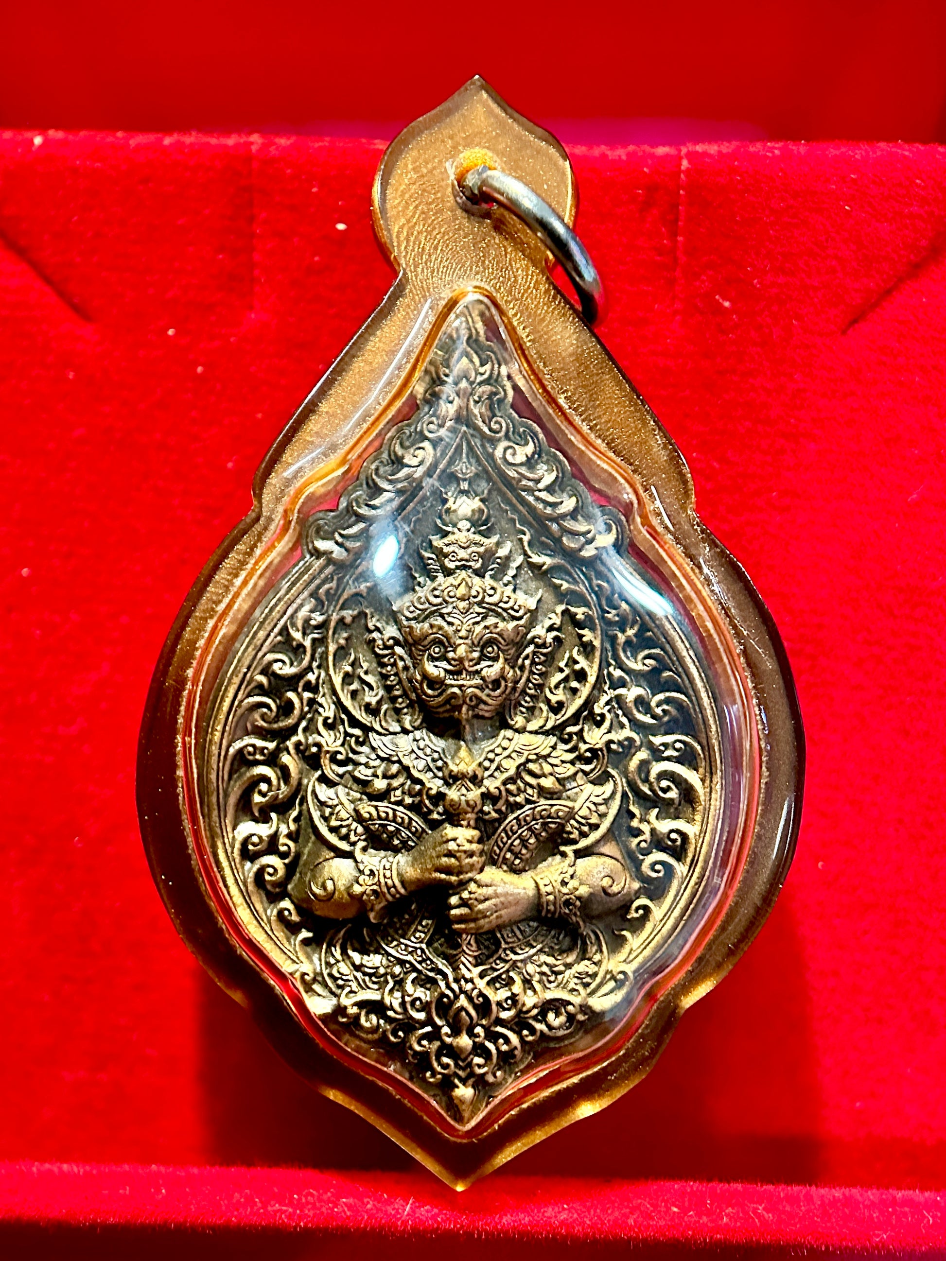 ๐ธ On the front, Tao Wessuwan is depicted in his iconic standing form, gripping his club with both hands in a posture of vigilance and unwavering command. Surrounded by detailed flame-like engravings and ornamental scrollwork, this side represents defensive might, spiritual protection, and resistance against evil forces.
