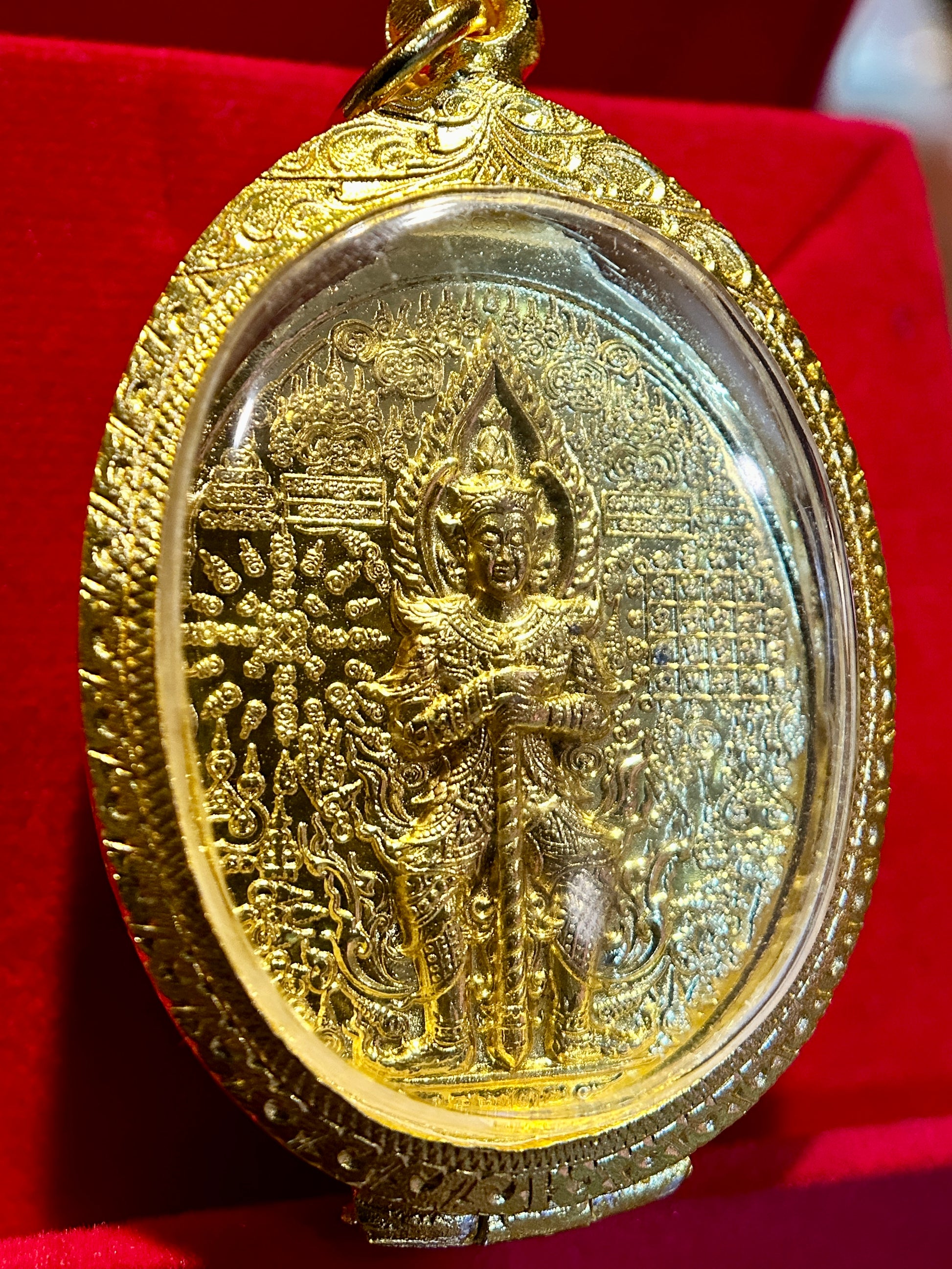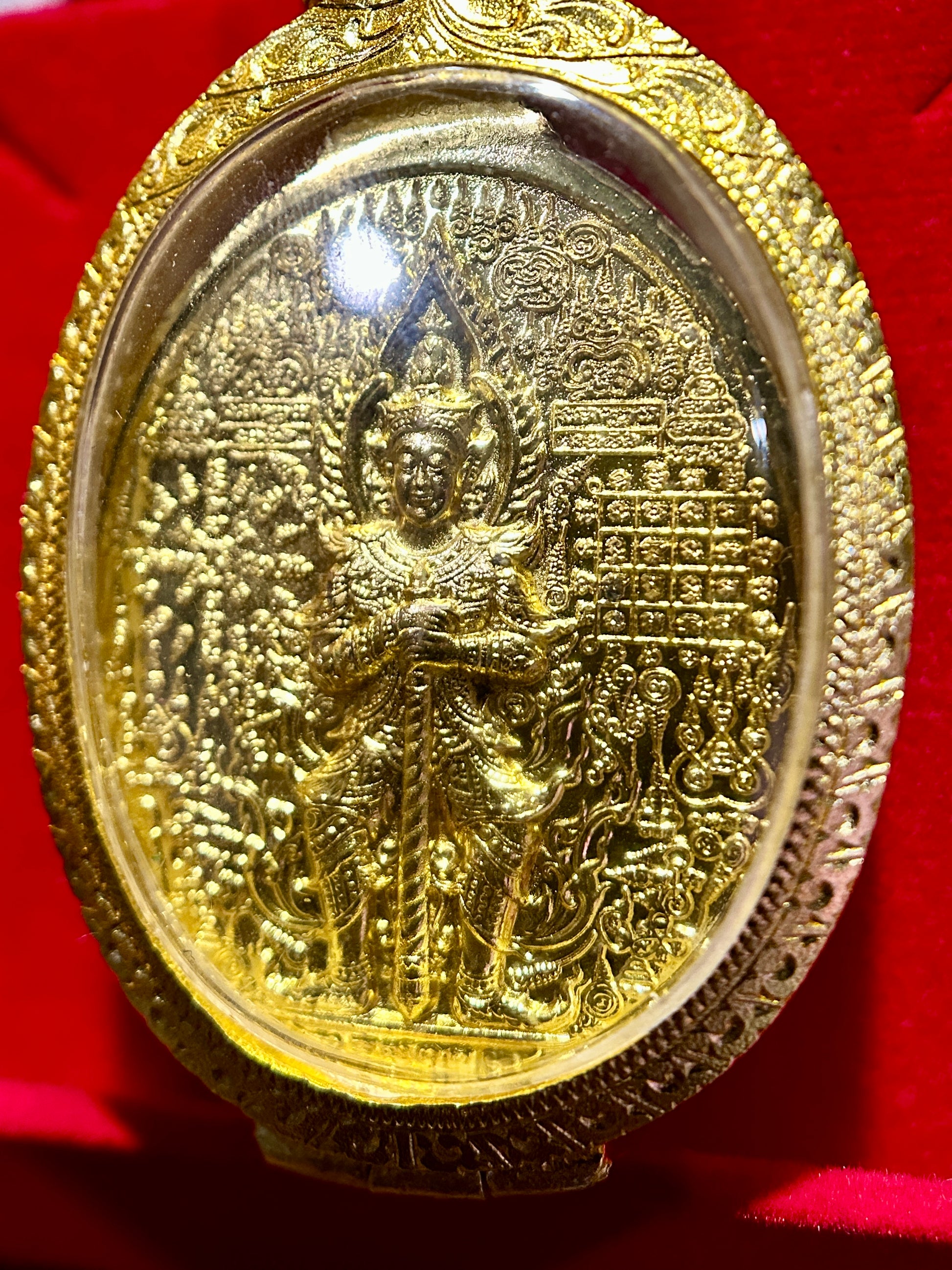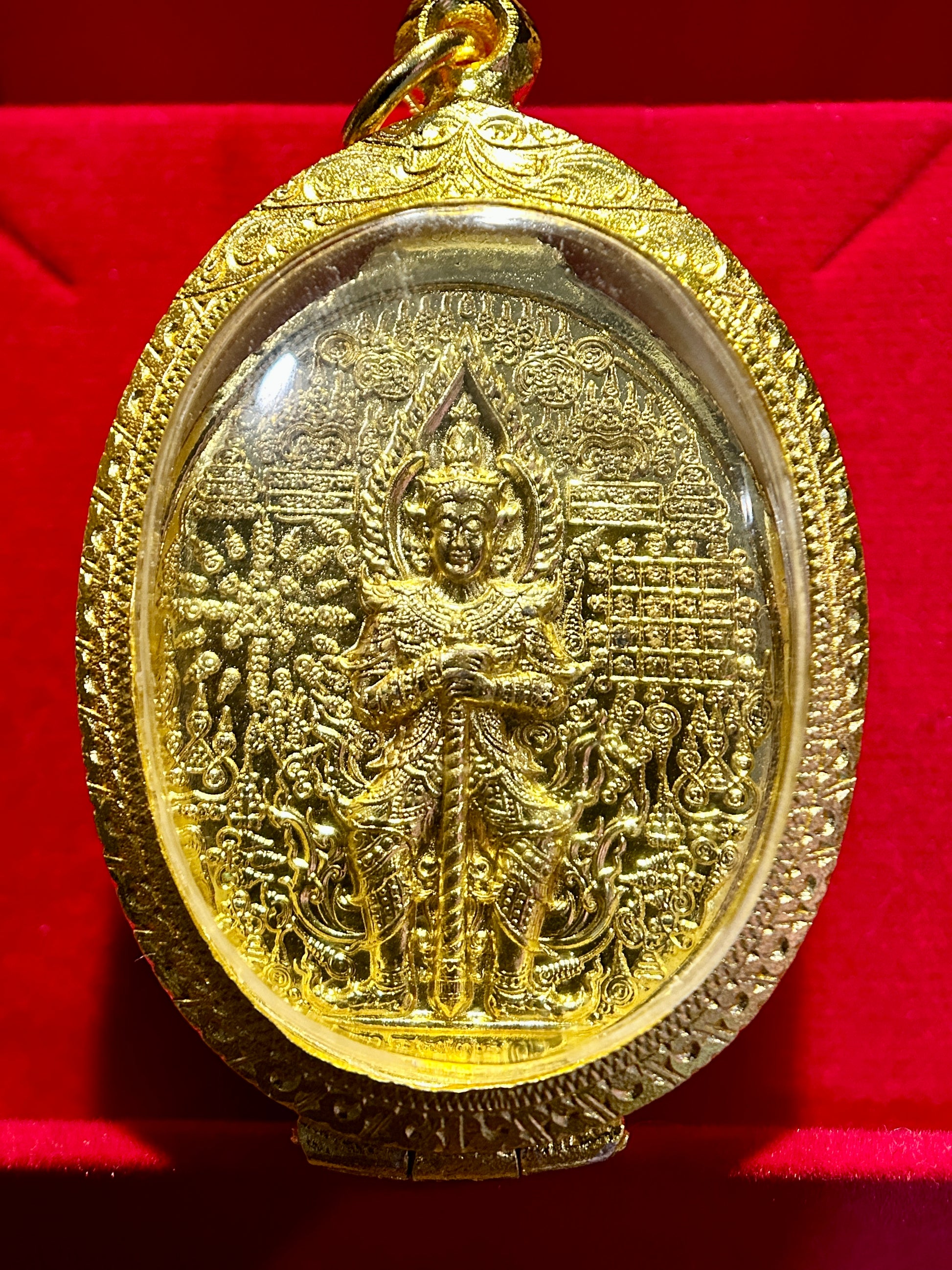 The reverse presents an all-gold depiction of Tao Wessuwan in high relief, surrounded by intricate temple imagery and dense yantra grids—amplifying its protective field and symbolic resonance. This side embodies divine order, vigilance, and the destruction of malevolent forces.