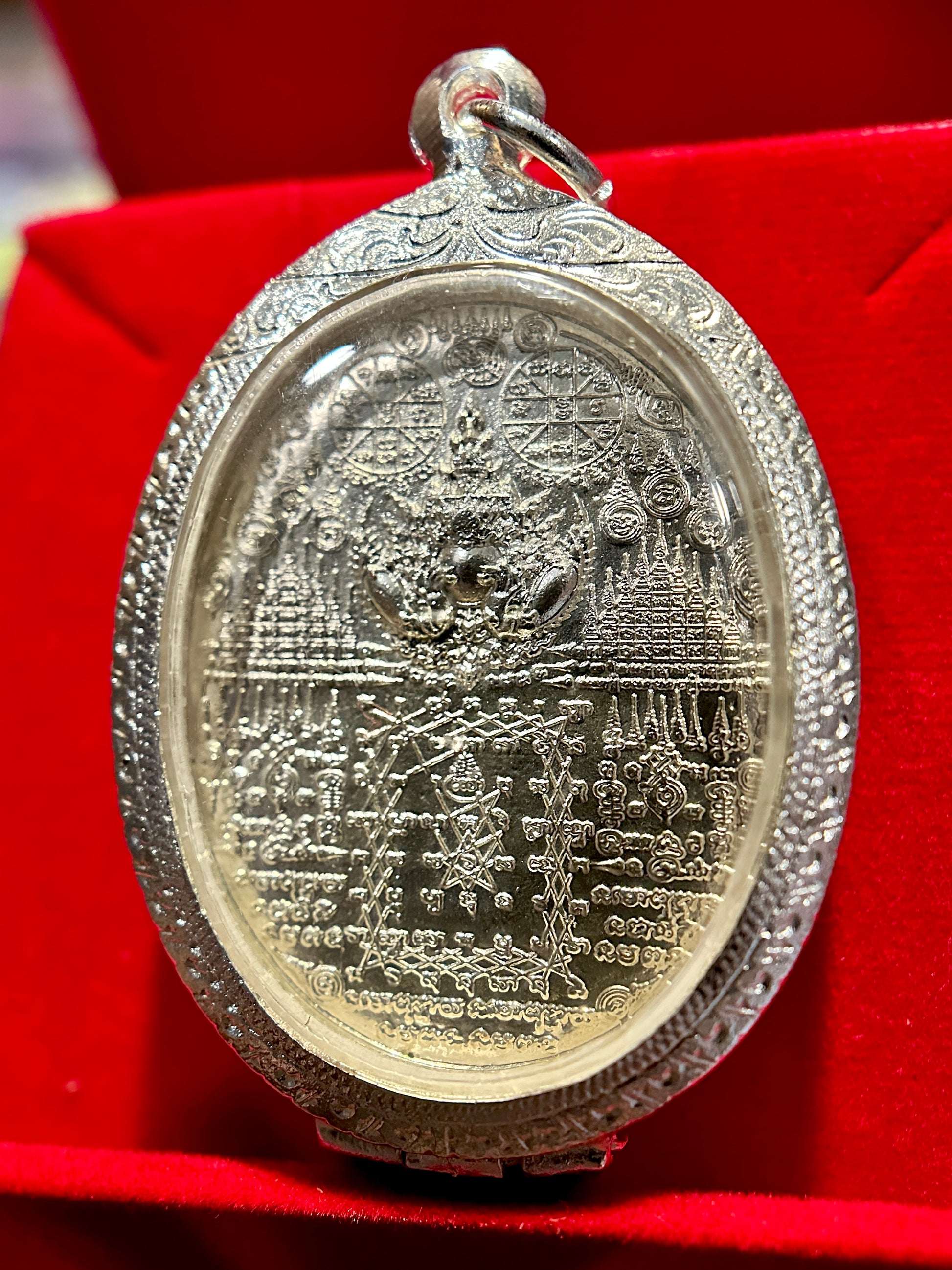 🔯 The reverse side is a masterwork of yantra design: an elaborate and densely packed sak yant plate, filled with sacred texts, celestial diagrams, temple motifs, and astrological wheels. These inscriptions are traditionally believed to shield against harm, attract good fortune, elevate spiritual awareness, and guide one on the path of truth and righteousness.