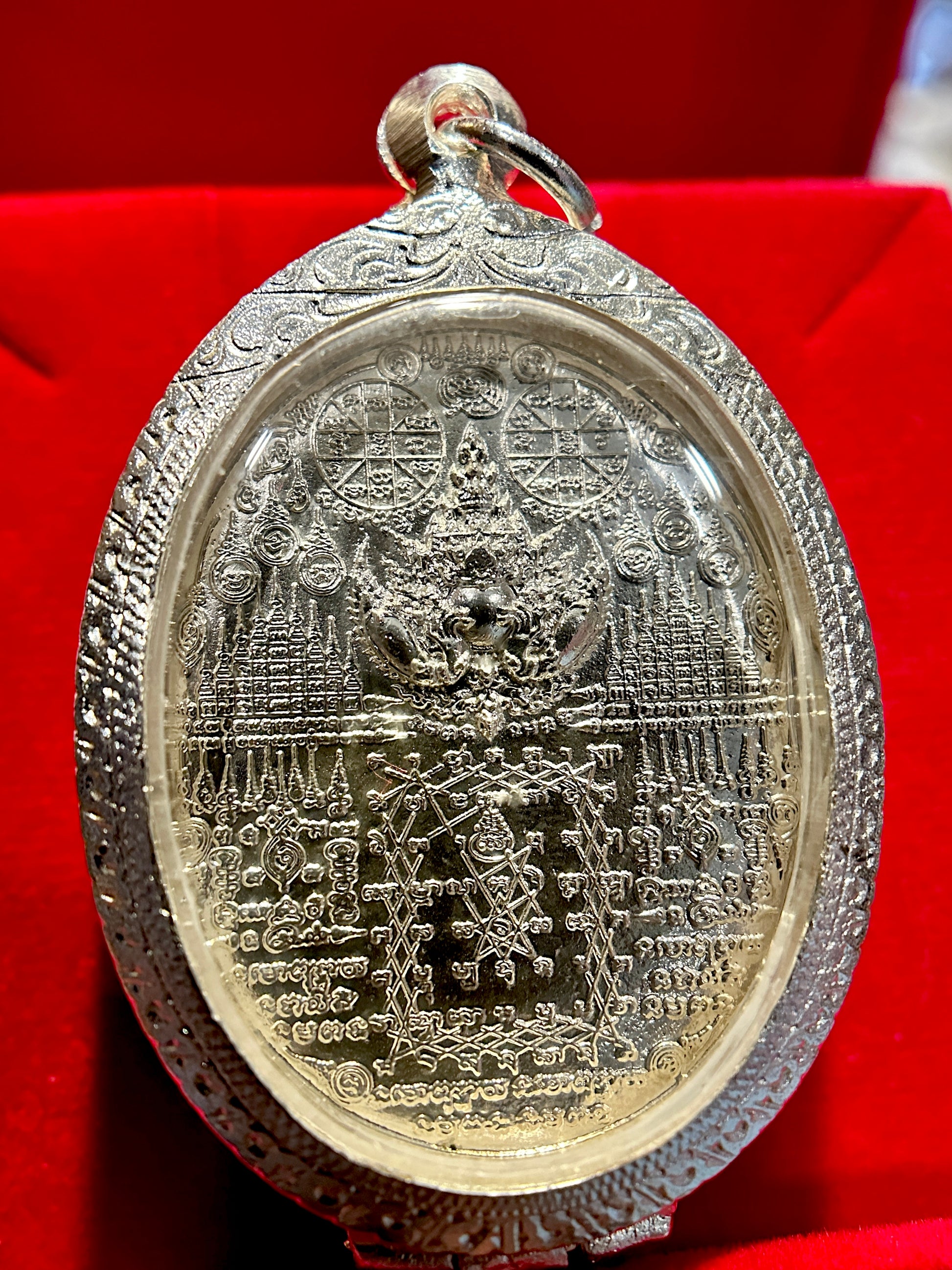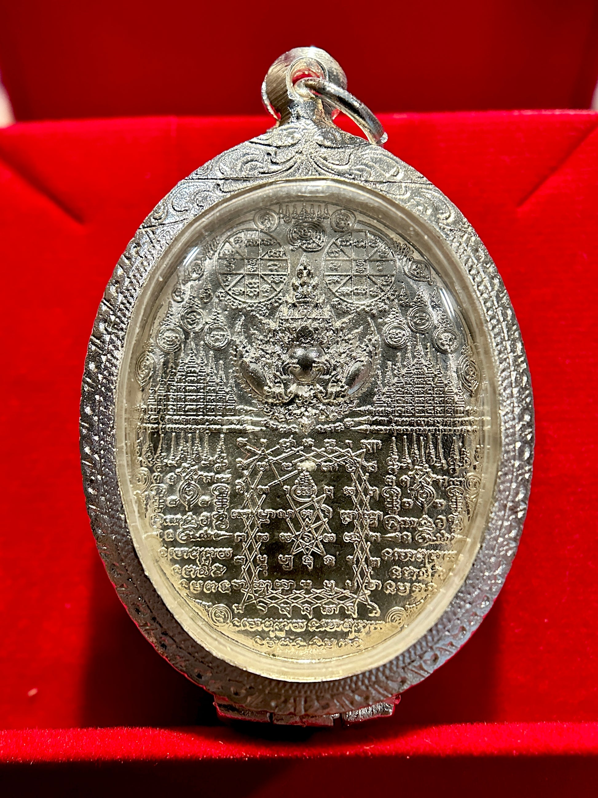 From Blessed Thai Amulets, this beautifully detailed oval-shaped amulet is a powerhouse of sacred energy and protection. At its center stands the mighty Tao Wessuwan — Guardian of the North, feared by evil spirits and revered as a protector of wealth, spiritual purity, and righteous power.