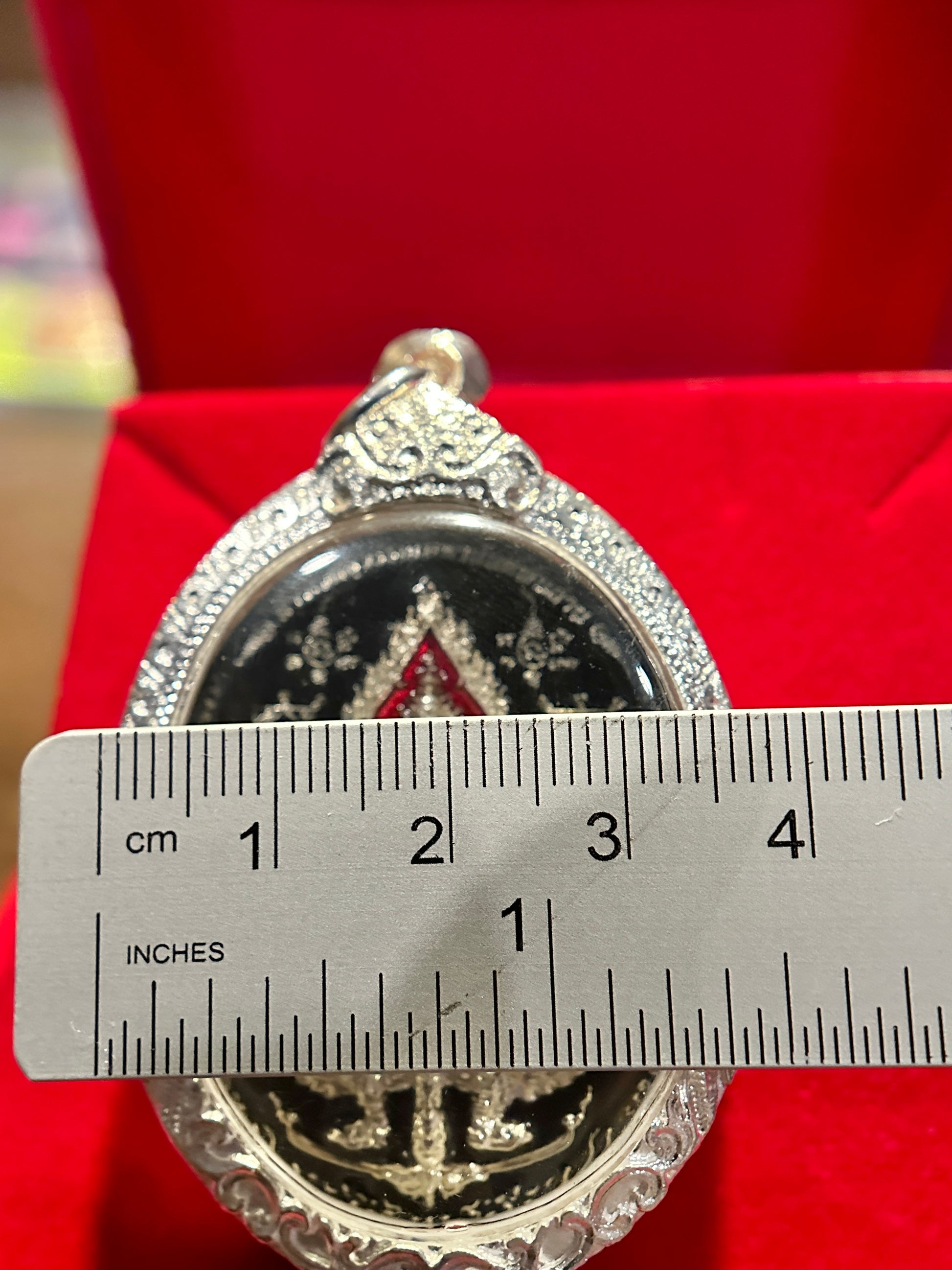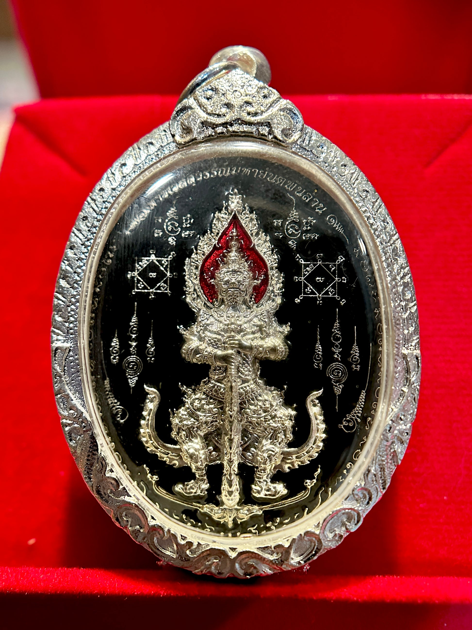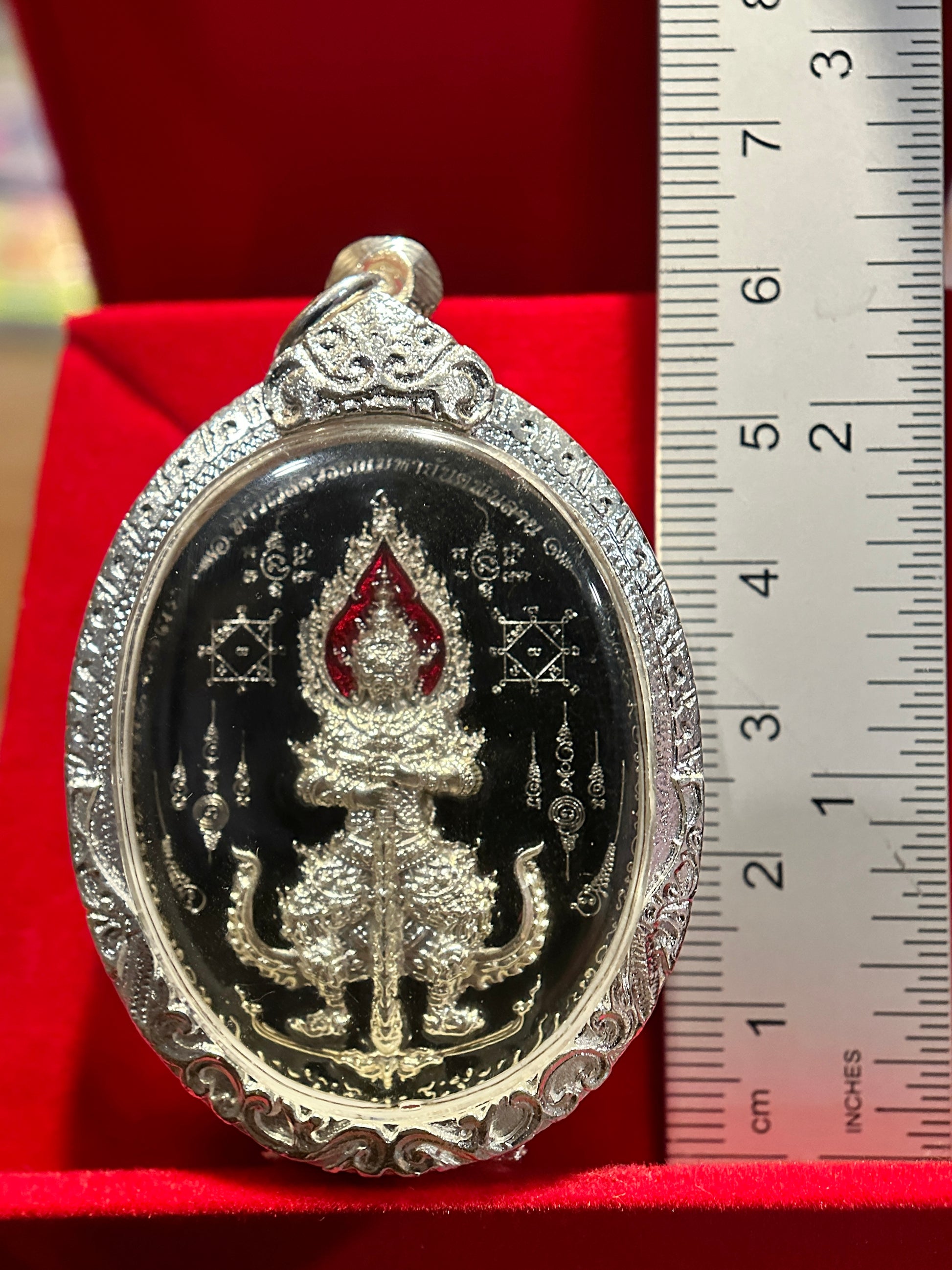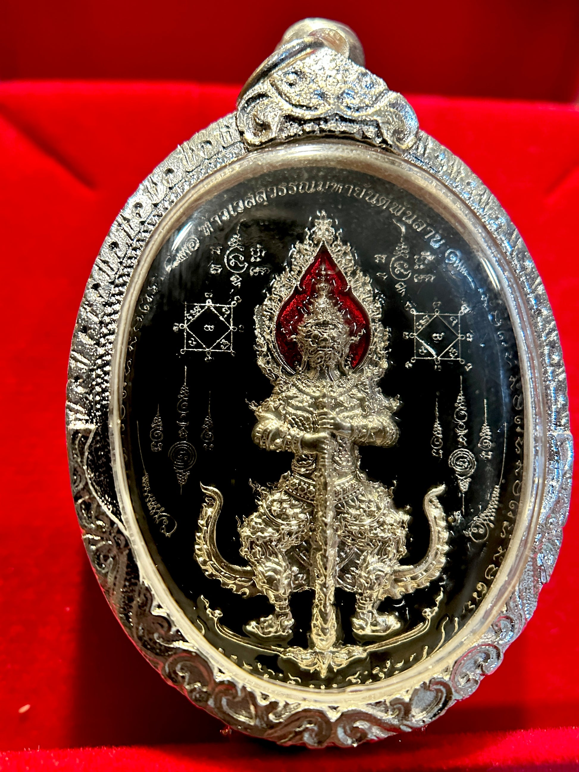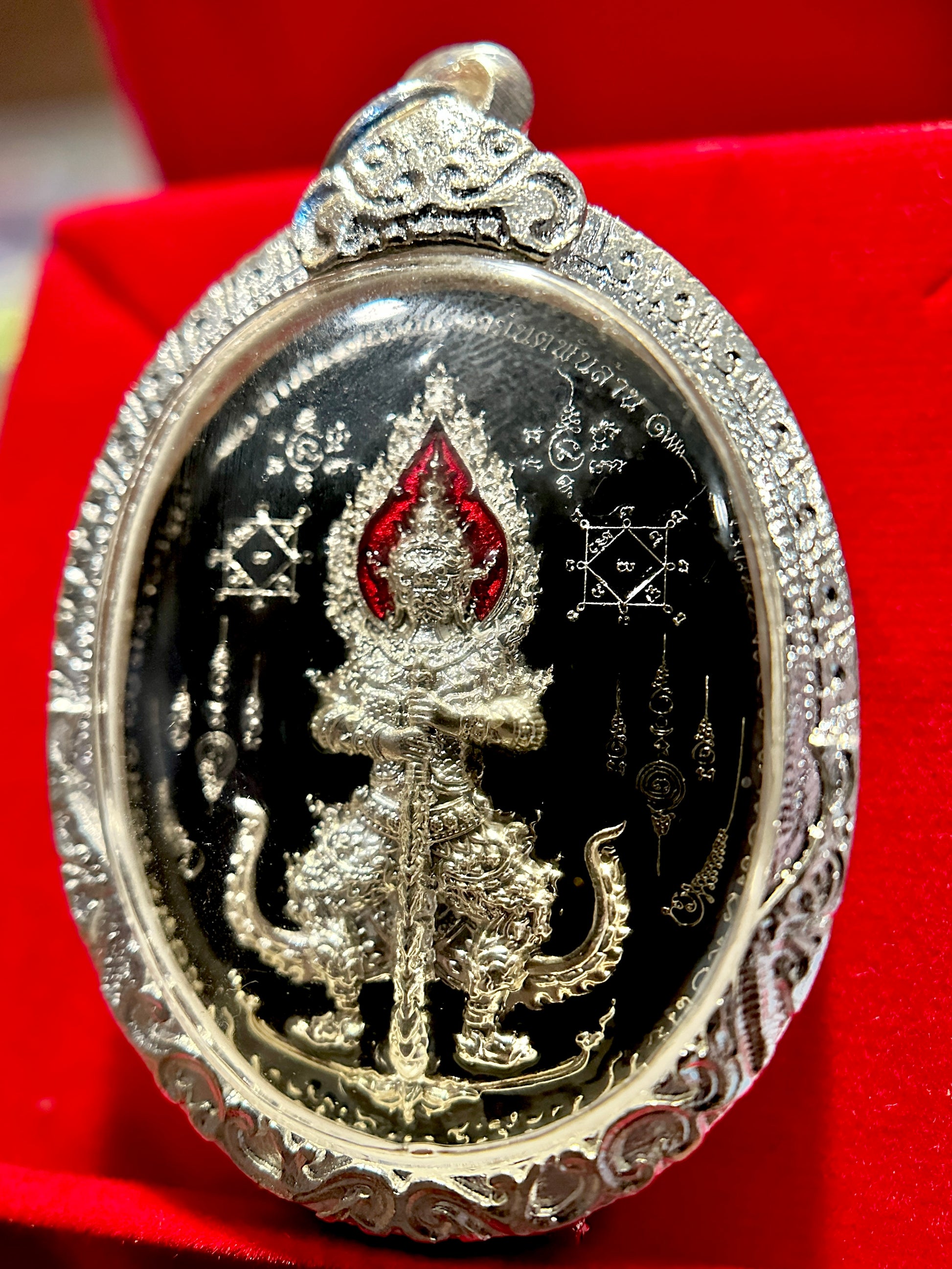 🔥 He is depicted in silver-tone relief, standing tall with his staff, backed by a brilliant black enamel symbolizing divine strength. Surrounding him are numerous sak yant inscriptions — protective mantras and symbols meticulously engraved in silver, offering layered spiritual defense and amplified energy for the wearer.