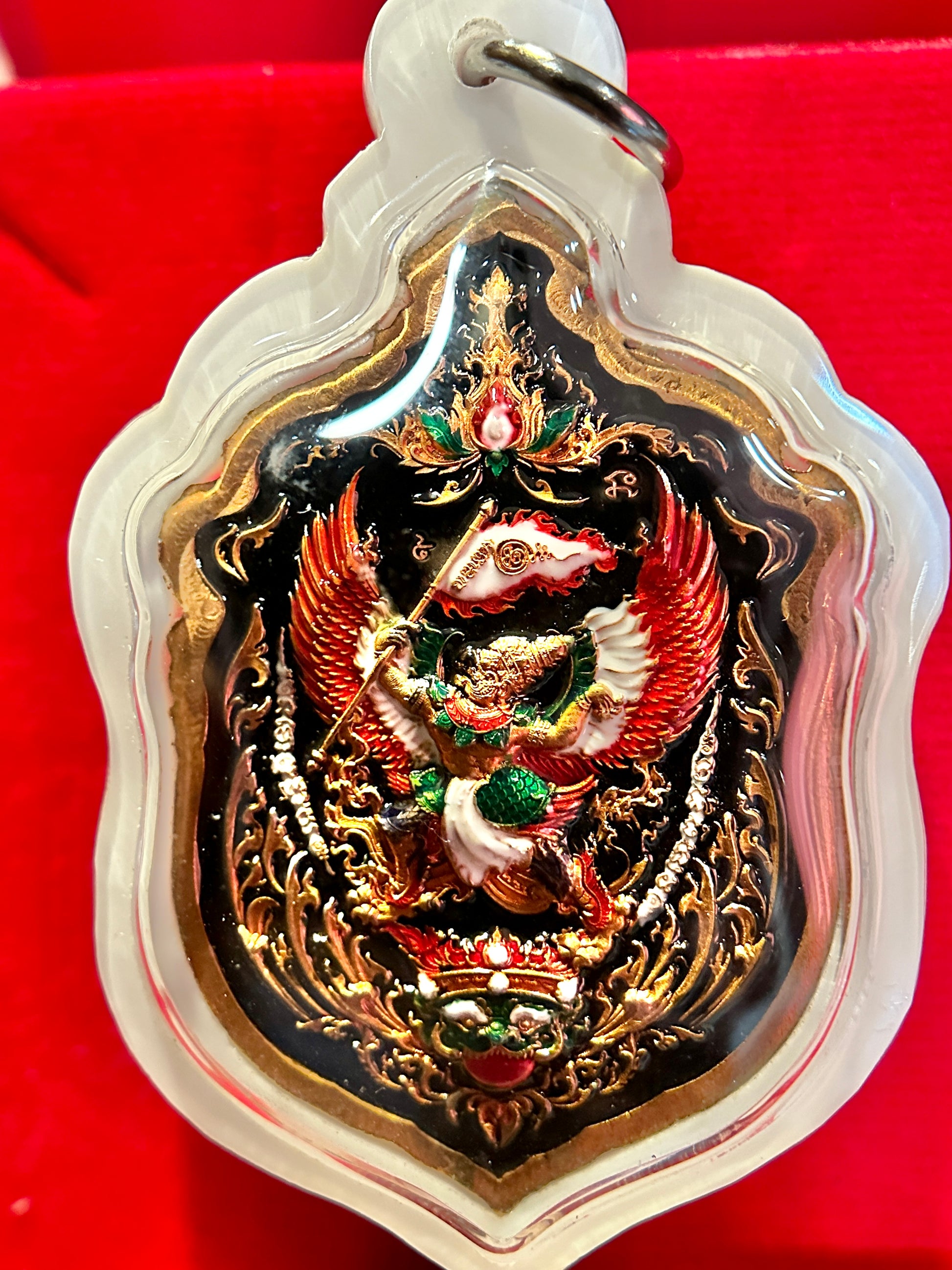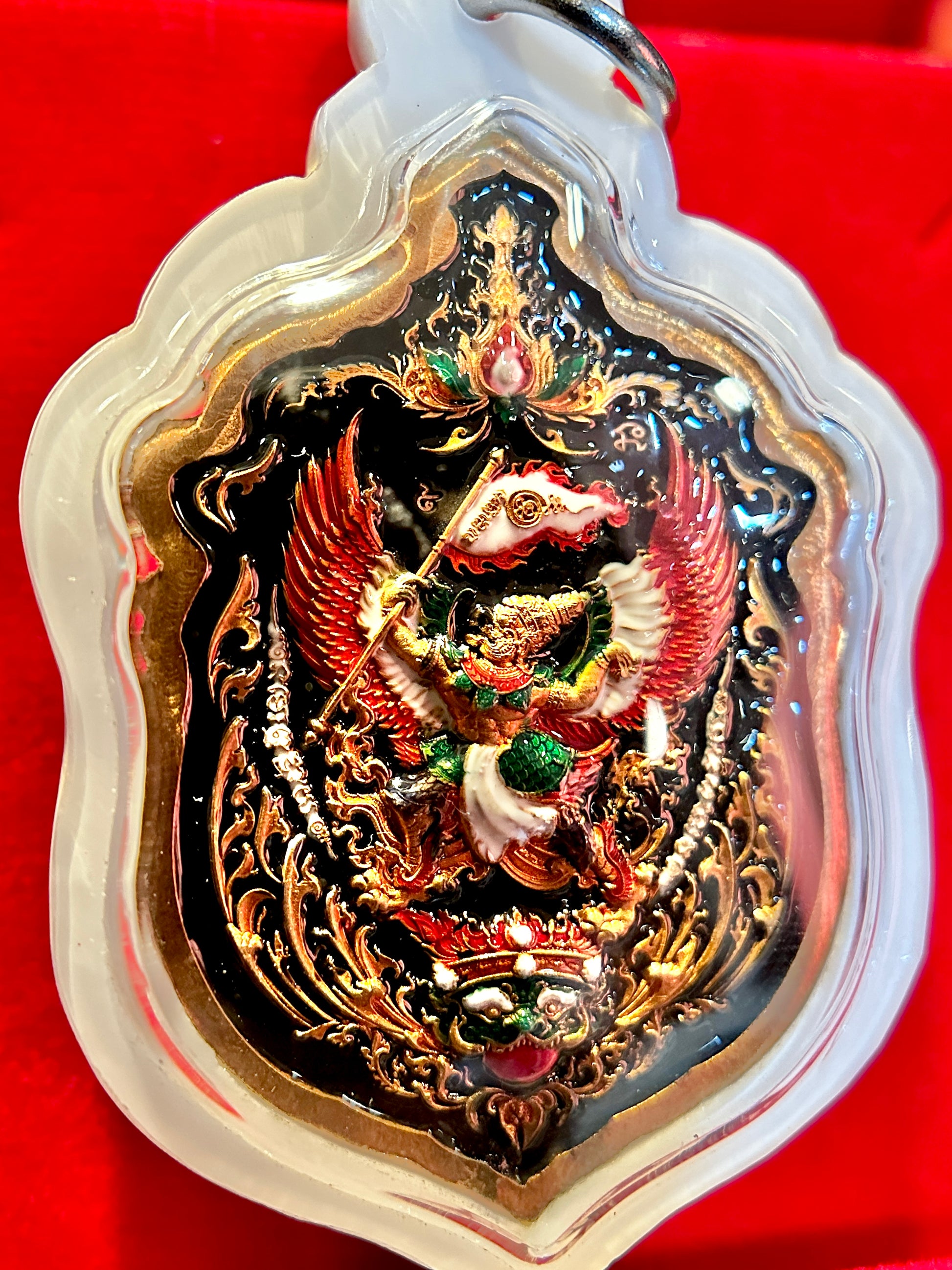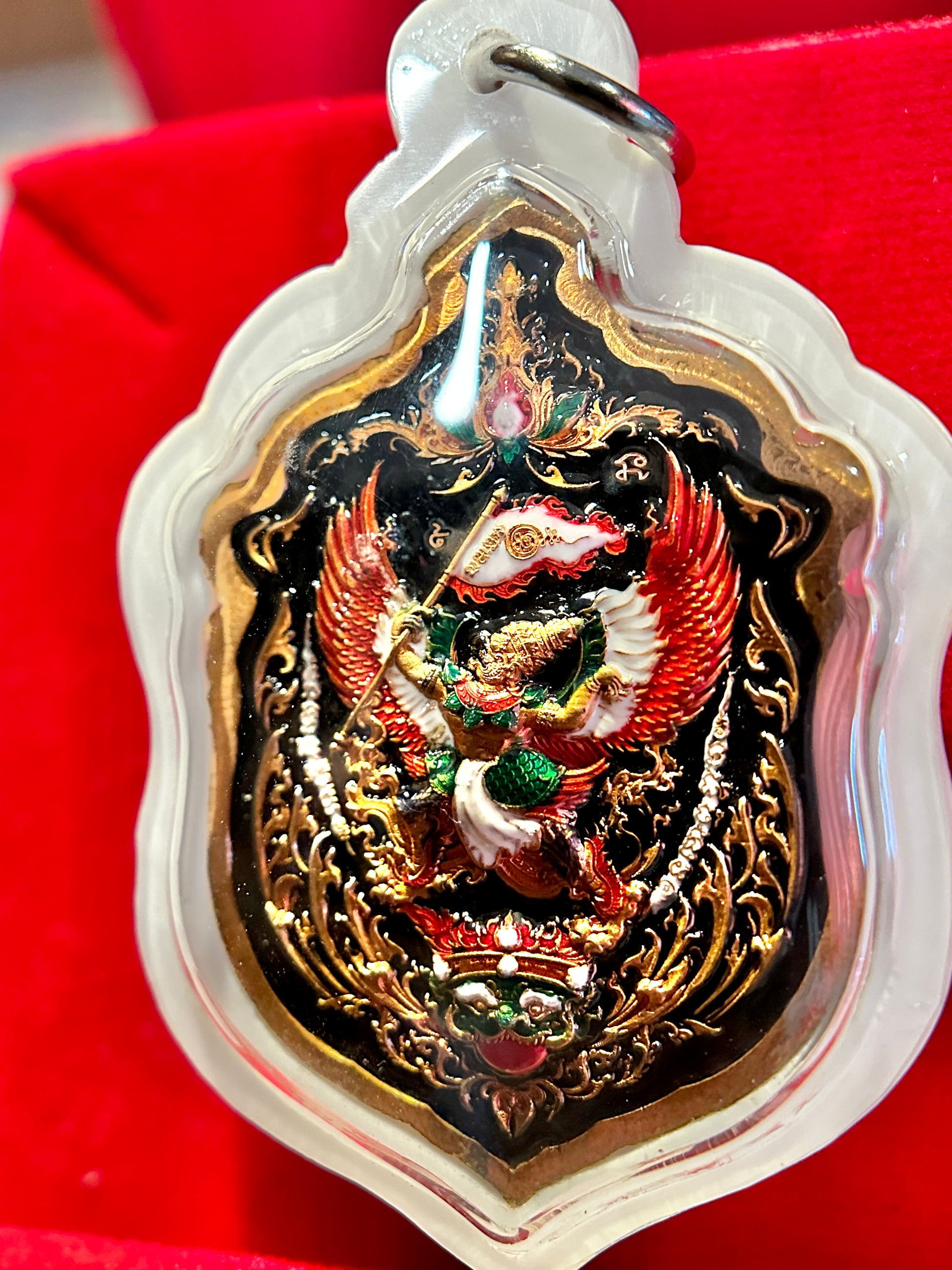 Set against a bold black enamel background, this version brings the gold and red detailing into powerful contrast. The amulet radiates intensity, with Tao Wessuwan symbolizing immovable power while Garuda bursts forth as a fiery force of liberation. Black is tied to protection from dark energies, courage, and commanding presence.