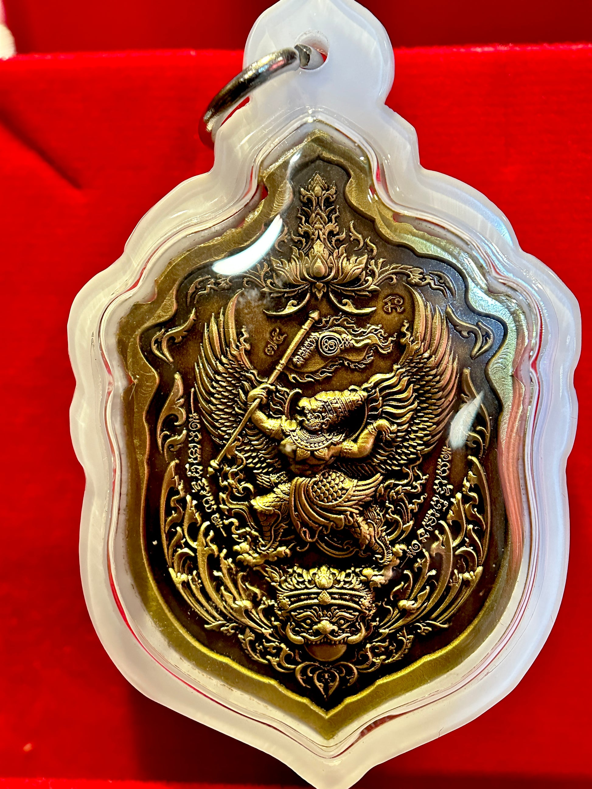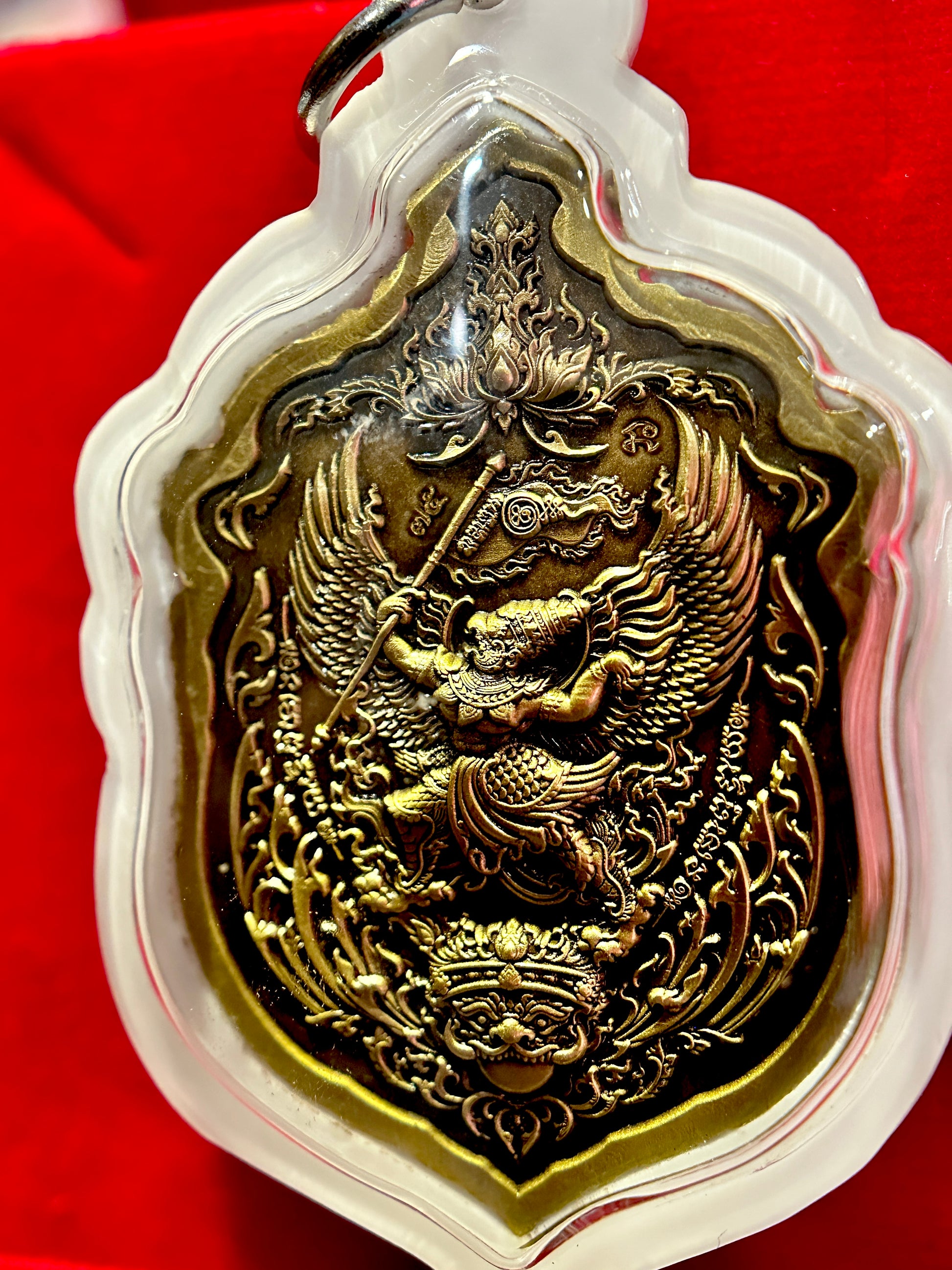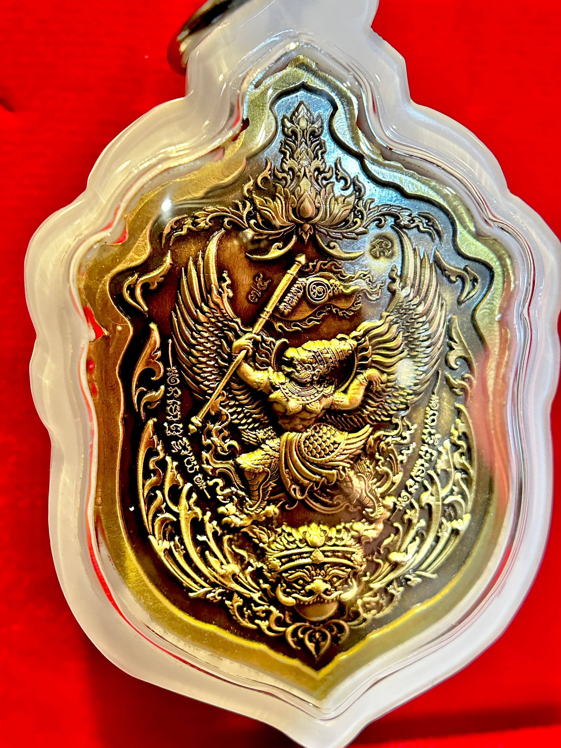 A more subdued brushed gold finish that emphasizes the depth of the flame patterns. Tao Wessuwan’s towering presence and Garuda’s battle stance are rendered in dark metallic tones, giving this amulet a mystical aura of authority and grounded protection. Ideal for wearers who value strength, tradition, and resilience.