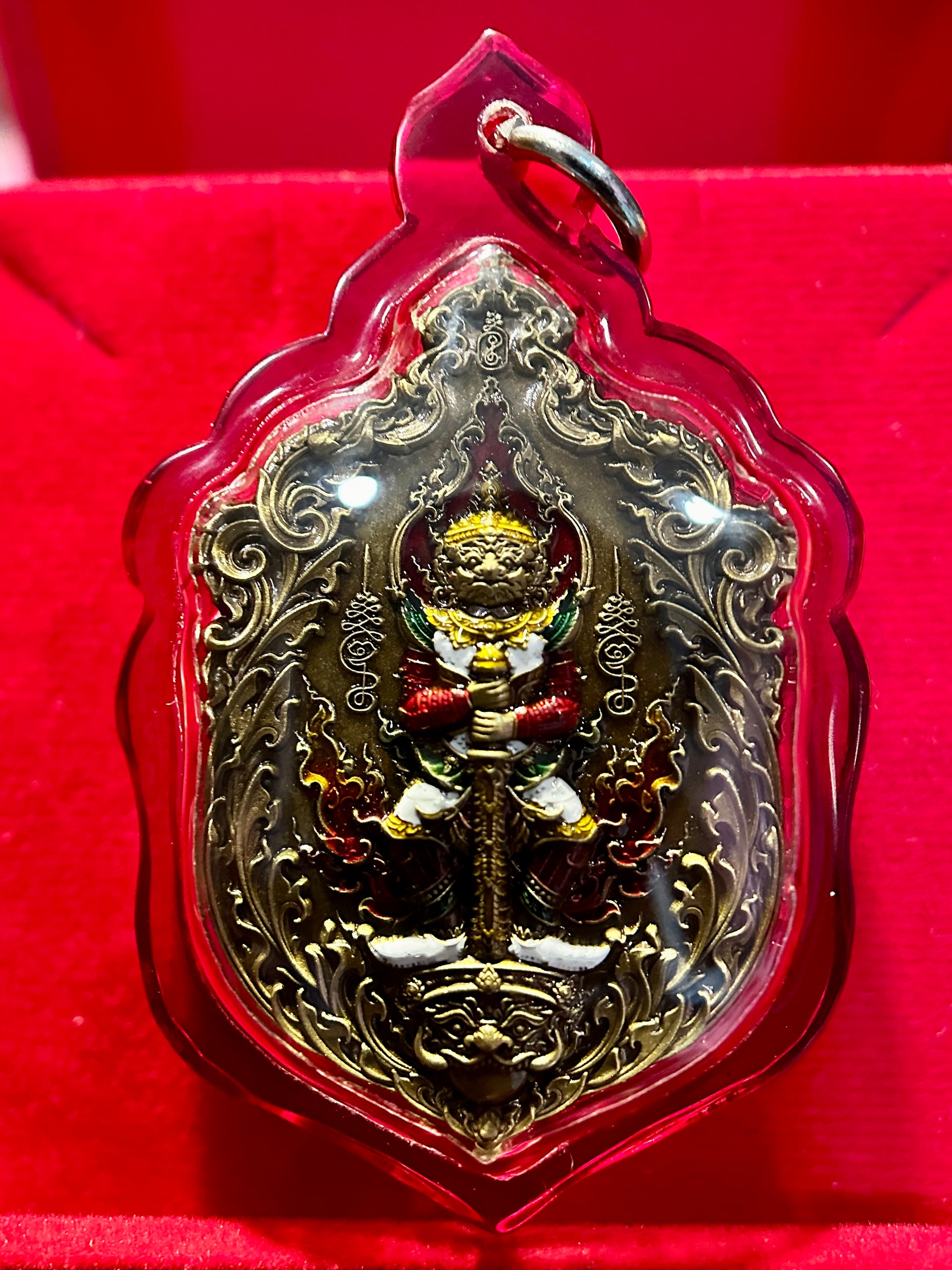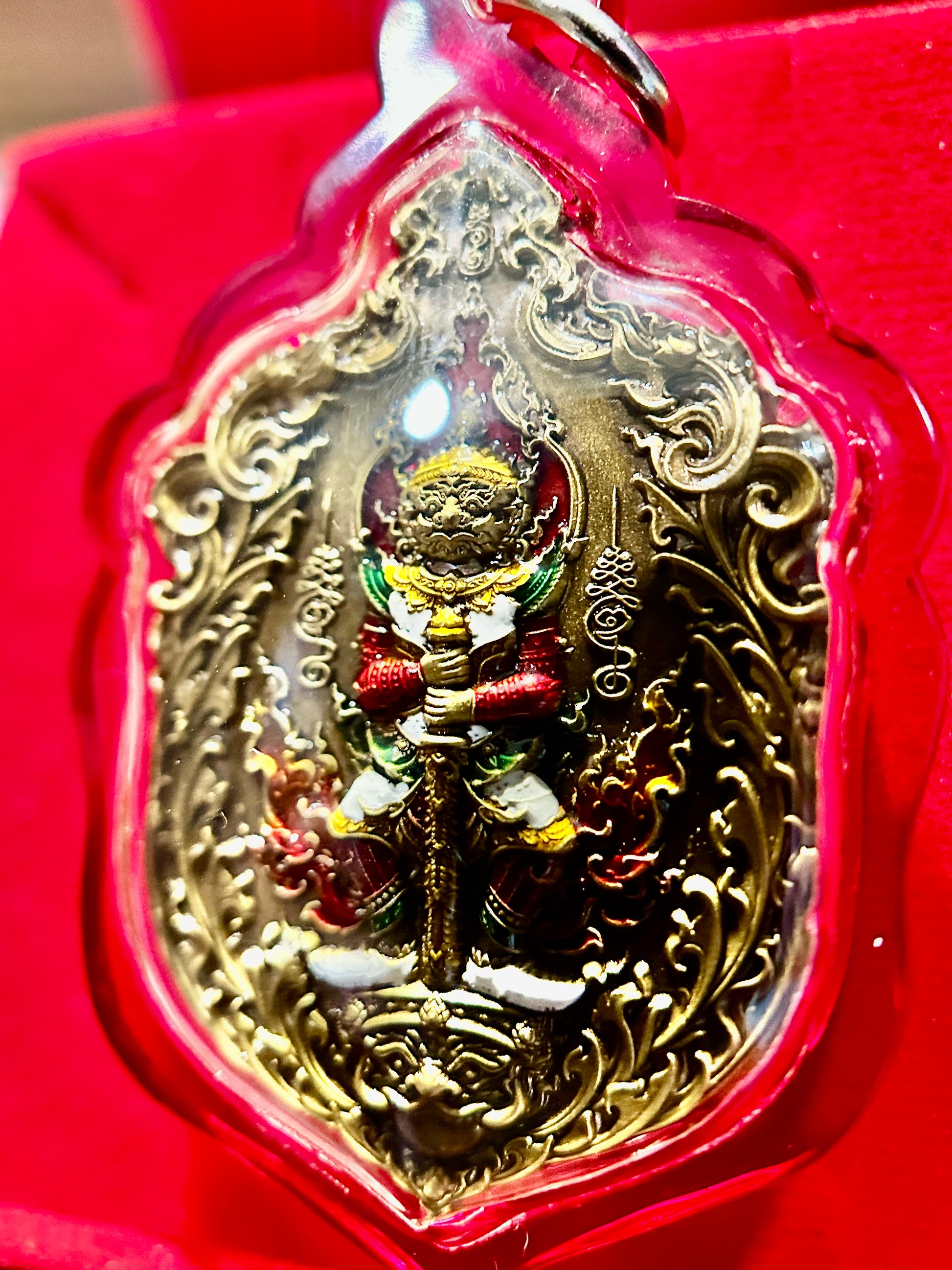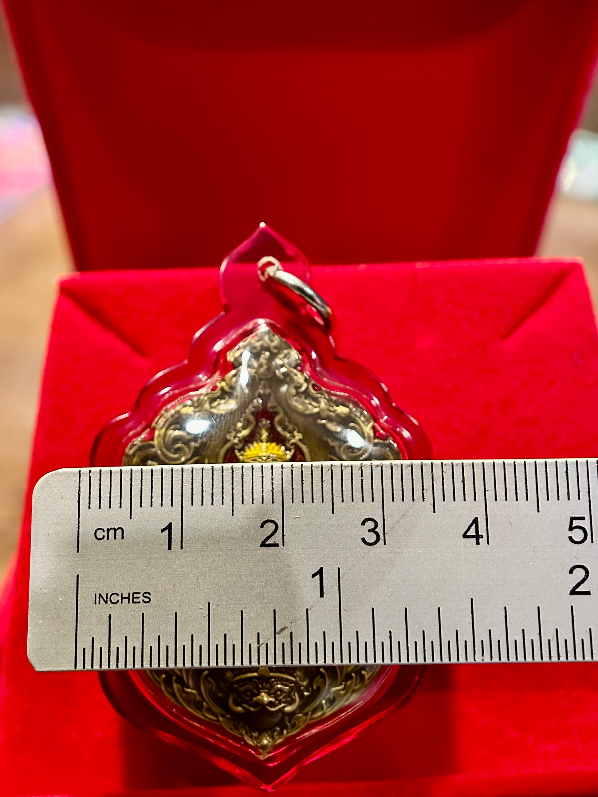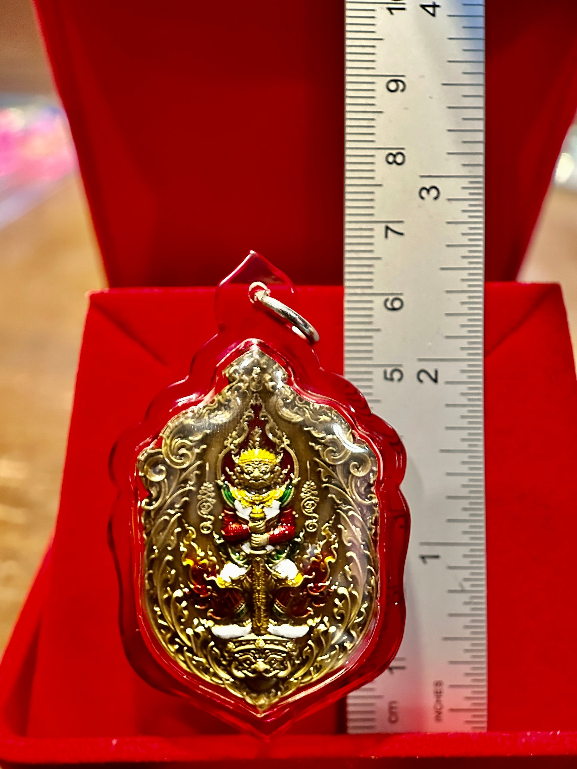 Encased in a clear case with bold red trim, this amulet blends sacred artistry with commanding presence, making it a powerful charm of protection, prosperity, and spiritual triumph.